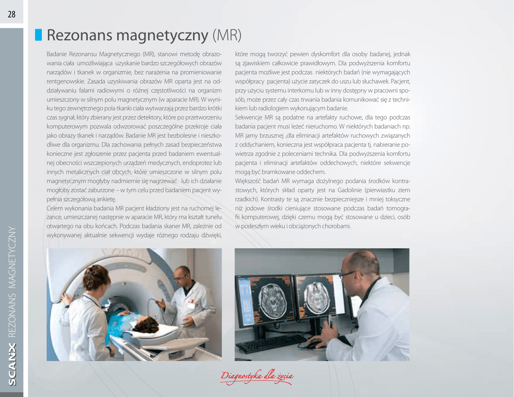 28 REZONANS MAGNETYCZNY Rezonans magnetyczny (MR) Badanie Rezonansu Magnetycznego (MR), stanowi metodę obrazowania ciała umożliwiająca uzyskanie bardzo szczegółowych obrazów narządów i tkanek w organizmie, bez narażenia na promieniowanie rentgenowskie. Zasada uzyskiwania obrazów MR oparta jest na oddziaływaniu falami radiowymi o różnej częstotliwości na organizm umieszczony w silnym polu magnetycznym (w aparacie MR). W wyniku tego zewnętrznego pola tkanki ciała wytwarzają przez bardzo krótki czas sygnał, który zbierany jest przez detektory, które po przetworzeniu komputerowym pozwala odwzorować poszczególne przekroje ciała jako obrazy tkanek i narządów. Badanie MR jest bezbolesne i nieszkodliwe dla organizmu. Dla zachowania pełnych zasad bezpieczeństwa konieczne jest zgłoszenie przez pacjenta przed badaniem ewentualnej obecności wszczepionych urządzeń medycznych, endoprotez lub innych metalicznych ciał obcych, które umieszczone w silnym polu magnetycznym mogłyby nadmiernie się nagrzewać lub ich działanie mogłoby zostać zaburzone – w tym celu przed badaniem pacjent wypełnia szczegółową ankietę. Celem wykonania badania MR pacjent kładziony jest na ruchomej leżance, umieszczanej następnie w aparacie MR, który ma kształt tunelu otwartego na obu końcach. Podczas badania skaner MR, zależnie od wykonywanej aktualnie sekwencji wydaje różnego rodzaju dźwięki, które mogą tworzyć pewien dyskomfort dla osoby badanej, jednak są zjawiskiem całkowicie prawidłowym. Dla podwyższenia komfortu pacjenta możliwe jest podczas niektórych badań (nie wymagających współpracy pacjenta) użycie zatyczek do uszu lub słuchawek. Pacjent, przy użyciu systemu interkomu lub w inny dostępny w pracowni sposób, może przez cały czas trwania badania komunikować się z technikiem lub radiologiem wykonującym badanie. Sekwencje MR są podatne na artefakty ruchowe, dla tego podczas badania pacjent musi leżeć nieruchomo. W niektórych badaniach np. MR jamy brzusznej ,dla eliminacji artefaktów ruchowych związanych z oddychaniem, konieczna jest współpraca pacjenta tj. nabieranie powietrza zgodnie z poleceniami technika. Dla podwyższenia komfortu pacjenta i eliminacji artefaktów oddechowych, niektóre sekwencje mogą być bramkowane oddechem. Większość badań MR wymaga dożylnego podania środków kontrastowych, których skład oparty jest na Gadolinie (pierwiastku ziem rzadkich). Kontrasty te są znacznie bezpieczniejsze i mniej toksyczne niż jodowe środki cieniujące stosowane podczas badań tomografii komputerowej, dzięki czemu mogą być stosowane u dzieci, osób w podeszłym wieku i obciążonych chorobami. 29 Przeciwwskazania: Bezwzględnym przeciwwskazaniem do wykonywania badania rezonansu magnetycznego są wszczepione u pacjenta urządzenia elektryczne i elektroniczne, takie jak: • rozrusznik serca (niekompatybilny z polem magnetycznym) • pompa insulinowa • wszczepiony aparat słuchowy • neurostymulatory • klipsy metalowe wewnątrzczaszkowe • ciało metaliczne w oku Większość obecnie stosowanych materiałów medycznych jest dopuszczona do pracy w polu elektromagnetycznym (np. aparaty ortodontyczne i materiały używane w stomatologii, klipsy stosowane przy laparoskopii, szwy w mostku po by-passach) i nie stanowią przeciwwskazania do wykonania badania MR. W czasie badania MR pacjent przebywa w stałym polu magnetycznym. Do pomieszczeń, w których wykonuje się badanie MR nie można wnosić kluczy, zegarków, kart magnetycznych, telefonów, spinek do włosów, kolczyków, klipsów i innych metalowych przedmiotów. Przedmioty te należy pozostawić w kabinie pacjenta. Niezastosowanie się do powyższego zakazu może narazić pacjenta lub obsługę urządzenia na niebezpieczeństwo oraz może spowodować uszkodzenie aparatu i wniesionych przedmiotów. Nie zaleca się wykonywania badań MR w I trymestrze ciąży. REZONANS MAGNETYCZNY Zalety badania MR: • jest bezbolesną i nieinwazyjną techniką obrazowania, która nie jest związana z ekspozycją na promieniowanie X; • może być powtarzane wielokrotnie; • może być wykonywane u osób chorób w każdym wieku, a także u kobiet ciężarnych; • nie powoduje żadnych reakcji alergicznych; • w przypadku zastosowania środka kontrastowego ryzyko wystąpienia ostrej reakcji jest w przeważającej mierze mniejsze niż w przypadku jodowych środków kontrastowych stosowanych podczas badań TK; • szczegółowe obrazy naczyń krwionośnych i przepływu krwi uzyskuje się bez konieczności wprowadzania do nich cewnika, w związku z czym nie występuje ryzyko uszkodzenia tętnicy; • obrazy MR struktur organizmu złożonych z tkanek miękkich – takich jak serce, wątroba i wiele innych narządów – w niektórych przypadkach zwiększają prawdopodobieństwo wykrycia i scharakteryzowania nieprawidłowości i zmian ogniskowych; taka dokładność sprawia, że badanie to stanowi nieocenione narzędzie we wczesnym rozpoznawaniu i ocenie wielu chorób; • przydatność w diagnozowaniu wielu różnych schorzeń, w tym nowotworów, chorób serca i naczyń krwionośnych, tkanki mięśniowej oraz kości; • umożliwia nieinwazyjną ocenę dróg żółciowych bez konieczności podania środka kontrastowego; • stanowi szybką, nieinwazyjną metodę w diagnozowaniu schorzeń serca i naczyń krwionośnych; • pomaga ocenić zarówno strukturę narządu, jak i jego funkcjonowanie. 30 REZONANS MAGNETYCZNY MR mózgowia MR mózgowia jest obecnie najdokładniejszą metodą obrazowania mózgowia, ze szczególnym uwzględnieniem móżdżku, mostu i rdzenia przedłużonego, ponieważ w odróżnieniu od TK nie jest obarczone artefaktami pochodzenia kostnego. Na podstawie badania MR można zróżnicować istotę białą i szarą, prześledzić przebieg wewnątrzczaszkowych odcinków nerwów czaszkowych, ocenić układ komorowy oraz przymózgowe przestrzenie płynowe. Ponadto zastos