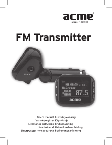 EN • • • • • • • 1.8’’ LCD display, can show the frequency, music’s name clearly SD card slot, USB input and audio jack to connect with MP3/MP4. Supports MP3 and WMA format. . FM frequency range (87.5 – 108.0 MHz). Adjustable display direction Fashion and attractive appearance. Restores last frequency, song and volume after restart. Operations • Insert transmitter to 12V car cigarette socket. • Insert SD card into SD card slot, or USB flash drive into USB slot; or • • • • • using audio line-In end to connect to transmitter; the other end connect to other equipment’s audio output jack (e.g.: MP3, CD) On the left side of the product, press key: go to next track. Press key: go to previous track. By pressing / button in the middle of right side, broadcasting music pauses; pressing again resumes playing. By pressing key: CH+ in the right side of the product, increase frequency By pressing key: CH- in the right side of the product , decrease frequency By pressing key FL-, FL+ to choose folder document (remote control). Remote Control Play / Pause Start / Stop the music CH ( - ) Frequency down CH ( + ) Frequency up EQ Changes sound characteristic: Normal Pop Classic Jazz Country Rock Volume ( - ) Volume down Volume ( + ) Volume up PREV Previous track NEXT Next track 0123456789 Number keys for setting the frequency and picking songs FL-, FL+ To choose folder document up and down in FL- , F+ EN Operation illustration: 1. The FM Transmitter has 206 different frequencies (87.5 – 108.0 MHz) to use. Use CH- and CH+ keys to change frequency. 2. Use number keys (0-9) to select the music track number. After selecting number of track it starts play automatically. 3. Every time EQ is pressed the sound characteristics are changed: NORMAL ROCK POP CLASSIC JAZZ COUNTRY. Press EQ key for about 4 seconds and the system returns back to NORMAL. 4. Last settings for volume, FM-transmission-frequency and music track are stored when the device is powered off. 5. USB and SD-card can both be connected to the device. The first medium connected, either USB or SD-card, is played. To select the other medium, the first one must be disconnected. 6. When an external audio device is connected to the Line-In jack, the playback from USB or SD-card stops automatically and cannot be started or paused by pressing the PLAY/PAUSE button. Replacing the Remote Control Battery 1) Remove the battery compartment cover by pulling the cover in the direction of the arrow. 2) Remove the battery. 3) Insert the replacement battery. Keep attention on the direction of the correct polarization (+/-). 4) Put the cover back to the battery compartment. EN Technical Parameters Storage temperature: Working conditions temperature: Operation relative humidity: Storage relative humidity: EMI standard: Supply voltage: Electric current: Bit rate: FM transmitting frequency: Transmitting frequency options: (can be stored in advance). Frequency response: SNR (Signal to Noise Ratio): Harmonic distortion: Transmitting distance: -5° up to +45° 0° up to +40° 20% - 90% (40°) 20% - 93% (40°) FCC (class B) 12V DC power 12V (normal working)<100mA 32Kbps – 256Kbps 87.5 – 108.0 MHz Press CH key to switch channels 30 – 15 kHz ± 3db 30db ≤1% 3–5m Security and Disposal Hints for Batteries • When a child swallowed a battery by mistake go to a doctor’s place or bring the child into a hospital promptly! • Never short batteries. • Look for the right polarity (+) and (–) of batteries! Always change all batteries, never use old and new batteries or batteries of different types together. • Do NOT open, deform or load up batteries! • There is a risk of injury by leakage batteries fluid! • NEVER throw batteries into fire! There is a risk of explosion! • Take out exhausted batteries from the device. • Take out batteries from the device when its not used over a longer period of time. EN Hints for Environment Protection Packages materials are raw materials and can be recycled. Separate the packages by types and recirculate them to an adequate recycling on behalf of the environment. More detailed information you get from your official civil service Do not disposal old devices into the domestic waste. Disposal old / defective devices professionally! The environment will be grateful for that. Information regarding places for disposal and opening hours you get from your official civil service. Do not disposal batteries into the domestic waste. Disposal old / empty / defective batteries professionally! The environment will be more than grateful for that. Information regarding places for disposal and opening hours you get from your official civil service Cleaning Protect the device from contamination and pollution. Only clean the device with soft cloth or drapery, avoid using rough or coarsegrained materials. Do NOT use solvents or other aggressive cleaners. Wipe the device after cleaning accurately. Important Notice Should battery fluid leak from a battery, wipe the battery-case with a soft cloth dry and put in a new battery! This product is in compliance with the essential requirements and other relevant provisions of Directive 1999/5/EC. LT • 1,8’’ skystųjų kristalų ekranas, aiškiai rodantis dažnį, muzikos kūrinių pavadinimus. • SD kortelės anga, USB įvestis ir garso įvesties lizdas MP3 arba MP4 • • • • • prijungti. Palaiko MP3 ir WMA formatus. FM dažnio diapazonas: 87,5–108,0 MHz. Reguliuojama ekrano kryptis. Madingas ir patrauklios išvaizdos. Paleidus iš naujo, atkuriamas dažnis, daina ir garsumo lygis. Operations • Prijunkite siųstuvą prie 12V automobilinio pridegiklio lizdo. • Įdėkite SD kortelę į SD kortelės lizdą arba USB atmintinę į USB prievadą esantį siųstuve. Taip pat galite naudoti laidą siųstuvui sujungti su kito garso įranginio garso išvesties lizdu (pvz., MP3, kompaktinių diskų grotuvo). • Spauskite kairiojoje pusėje esantį mygtuką 