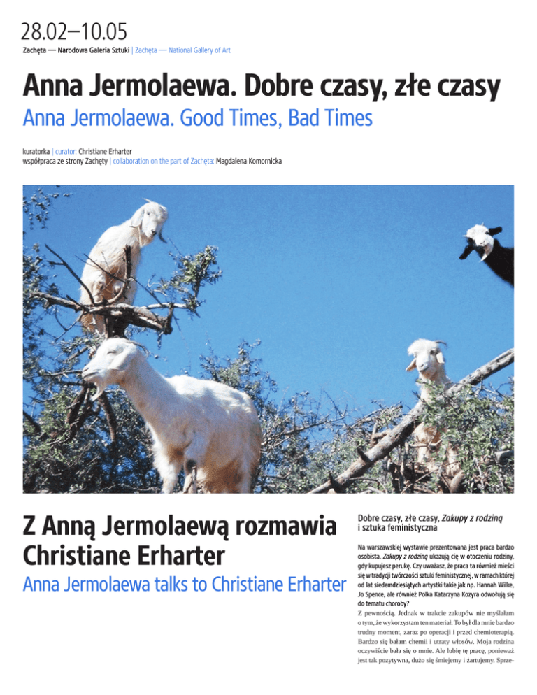 28.02–10.05 Zachęta — Narodowa Galeria Sztuki | Zachęta — National Gallery of Art Anna Jermolaewa. Dobre czasy, złe czasy Anna Jermolaewa. Good Times, Bad Times kuratorka | curator: Christiane Erharter współpraca ze strony Zachęty | collaboration on the part of Zachęta: Magdalena Komornicka Z Anną Jermolaewą rozmawia Christiane Erharter Anna Jermolaewa talks to Christiane Erharter Dobre czasy, złe czasy, Zakupy z rodziną i sztuka feministyczna Na warszawskiej wystawie prezentowana jest praca bardzo osobista. Zakupy z rodziną ukazują cię w otoczeniu rodziny, gdy kupujesz perukę. Czy uważasz, że praca ta również mieści się w tradycji twórczości sztuki feministycznej, w ramach której od lat siedemdziesiątych artystki takie jak np. Hannah Wilke, Jo Spence, ale również Polka Katarzyna Kozyra odwołują się do tematu choroby? Z pewnością. Jednak w trakcie zakupów nie myślałam o tym, że wykorzystam ten materiał. To był dla mnie bardzo trudny moment, zaraz po operacji i przed chemioterapią. Bardzo się bałam chemii i utraty włosów. Moja rodzina oczywiście bała się o mnie. Ale lubię tę pracę, ponieważ jest tak pozytywna, dużo się śmiejemy i żartujemy. Sprze- Dobre czasy, złe czasy, 2007, wydruki fotograficzne, dzięki uprzejmości artystki na sąsiedniej stronie: O kozach, kobietach i produkcji oleju, 2015, instalacja, dzięki uprzejmości artystki Good Times, Bad Times, 2007, digital prints, courtesy of the artist opposite: About Goats and Women in Oil Production, 2015, installation, courtesy of the artist dawczyni okazała się niesamowita. Zachowywała się tak, jakby długo przygotowywała się do tego występu. W pewnym sensie tak było, ponieważ w swoim zawodzie stale ma do czynienia z rozpaczającymi rodzinami. Praca stanowi ważną część wystawy, bo mówi o dobrych i złych okresach w życiu, o wzlotach i upadkach. Jestem przekonana, że ciężkie sytuacje życiowe przede wszystkim czegoś nas uczą. Czy skupienie się na codziennych sytuacjach, którym nadajesz znaczenie, czyniąc je tematem swojej sztuki, jest również elementem feministycznej metody? Można powiedzieć, że sytuacje z życia codziennego często znajdują odzwierciedlenie w moich pracach. Wiem z doświadczenia, co to znaczy być imigrantem czy uchodźcą. Problem emigracji niewątpliwie odgrywa ważną rolę w mojej sztuce i życiu. Uciekłam do Wiednia, cała moja rodzina wyemigrowała do Stanów Zjednoczonych. W Petersburgu nie mam już żadnych krewnych. Nie znoszę pytania: „Czy jedziesz do domu na Boże Narodzenie?”. Bo gdzie jest ten dom? Czy zainteresowanie zmarginalizowanymi grupami społecznymi, takimi jak uchodźcy, imigranci, opozycjoniści, sprzątaczki, opiekunki, również zwierzęta, wynika z twojej własnej historii? Tuż po pobycie w obozie dla uchodźców w Traiskirchen, w 1990 roku udałam się jako świeżo upieczony uchodźca do urzędu pracy w Wiedniu, by dowiedzieć się o możliwość zatrudnienia. W rezultacie przez niedługi czas pracowałam jako sprzątaczka. W 2011 roku sprawdziłam, czy ta firma jeszcze istnieje, i udało mi się przekonać jej szefa, by pozwolił mi popracować razem z jego ludźmi. Tak właśnie powstała praca o sprzątaczkach. Aleksandra Wysokińska zwróciła mi uwagę już w Krakowie, podczas kręcenia filmu, na coś, co potwierdziło się w trakcie moich badań: Polki i Serbki przyjeżdżają sprzątać w Austrii, w Polsce sprzątają Rosjanki i Ukrainki, w Serbii z kolei Rumunki i Albanki, a w Rosji kobiety z dawnych republik Azji Centralnej. Wyłania się jakaś absurdalna spirala — prace związane ze sprzątaniem wykonywane są w większości przez przedstawicielki imigracji zarobkowej pochodzące z państw o niższym poziomie płac. Inspektor podatkowy zapytał mnie kiedyś: „Po co nam w Wiedniu rosyjskie artystki, czy nie mamy dość własnych?”. Koleżanka poradziła mi wtedy: „Powiedz mu, że ty wykonujesz prace, których twoi austriaccy koledzy nie chcą się podjąć”. Aleksandra Wysokińska / 20 Jahre danach, ucieczka i polska gościnność Wspomniałaś już o Aleksandrze Wysokińskiej. Wideo Aleksandra Wysokińska / 20 Jahre danach będące portretem Polki, która pomogła ci w ucieczce, stanowi kolejną z ważnych prac na wystawie. Opowiedz, jak powstało. Dlaczego musiałaś tak krótko przed przemianami uciec z Rosji? Byłaś przecież bardzo młoda. Ta praca jest hołdem złożonym kobiecie z Krakowa, która w maju 1989 roku pomogła mi w ucieczce do Austrii. Byłam wtedy zaangażowana politycznie w Rosji i interesowało się mną KGB. Potem zaczęły się przesłuchania i przeszukiwanie mieszkania. Udało nam się wyjechać do Polski, do Krakowa, i tam spotkaliśmy Aleksandrę. Od chwili, gdy zapukaliśmy do jej drzwi, zaopiekowała się nami i zajęła naszą dalszą podróżą do Wiednia i jej sfinansowaniem. W 2009 roku udało mi się ją odnaleźć i namówiłam ją, aby zgodziła się sfilmować nasze spotkanie. Na moje najważniejsze pytanie, dlaczego nam wtedy pomogła, skromnie odparła: „Ze względu na naszą polską gościnność”. To spotkanie i nagranie w Krakowie okazały się bardzo poruszające. W dodatku zdałam sobie sprawę, o ilu szczegółach z tamtego czasu kompletnie zapomniałam albo je wyparłam. Aleksandra przypomniała mi np. następującą historię. Kiedy powiedzieliśmy jej, że chcemy uciekać dalej na Zachód, a myśleliśmy wtedy o Berlinie Zachodnim, skąd chcieliśmy jechać potem do Stanów, odparła: „Dobrze, ale najpierw musicie wyleczyć zęby, ponieważ tam na pewno nie będziecie mieli ubezpieczenia”. Następnego dnia zabrała nas do dentysty, opowiedziała mu całą historię, a on natychmiast doprowadził nasze zęby do porządku. Jakiś miesiąc później, a byliśmy już wtedy w Traiskirchen, wysłaliśmy pocztówkę do Aleksandry i dołączyliśmy pozdrowienia dla dentysty. Napisaliśmy mu: „Nasze nowe zęby gryzą już k