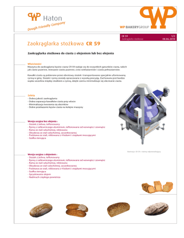 WP BAKERYGROUP Zaokrąglarka stożkowa CR 59 CR 59 Zaokrąglarka stożkowa Zaokrąglarka stożkowa do ciasta z olejeniem lub bez olejenia Właściwości Maszyna do zaokrąglania kęsów ciasta CR 59 nadaje się do wszystkich gatunków ciasta, takich jak ciasto pszenne, mieszane ciasto pszenne, cisto wieloziarniste i ciasto pełnoziarniste. Kawałki ciasta są pobierane przez obrotowy stożek i transportowane specjalnie uformowaną rynną w górę. Stożek i rynny zostały opracowane z wysoką precyzją. Zachowana jest bardzo wąska szczelina między stożkiem a rynną, dzięki czemu minimalizuje się obcinanie ciasta. Zalety - Dobra jakość zaokrąglania - Dobra separacja kawałków ciasta przy wlocie - Minimalizacja tworzenia się obcinków - Dobre przekazanie kęsów ciasta na kolejne maszyny Wersja seryjna bez olejenia : - Stożek z żeliwa, teflonowany - Rynny z odlewniczego aluminium, teflonowane od wewnątrz i zewnątrz - Rama ze stali szlachetnej, niklowana - Obudowa ze stali szlachetnej, szczotkowanej - Podstawa ze stali, niklowana z 4 kołami i stopkami mocującymi - Szafka sterująca Ilustracja: CR 59 z taśmą odprowadzającą Wersja seryjna z olejeniem : - Stożek z żeliwa, teflonowany - Rynny z odlewniczego aluminium, teflonowane od wewnątrz i zewnątrz - Rama ze stali szlachetnej, niklowana - Obudowa ze stali szlachetnej, szczotkowanej - Podstawa ze stali, niklowana z 4 kołami i stopkami mocującymi - Szafka sterująca - Spryskiwanie olejem - Nadmuch ciepłego powietrza 1/2 08.06.2010 WP BAKERYGROUP CR 59 Zaokrąglarka stożkowa CR 59 Dane techniczne Typ -K -M -G 2/2 08.06.2010 Zakres wagi 90 - 700 g 400 - 1600 g 700 - 2200 g - Wydajność do 2500 szt./godz., silnik elektryczny 1,1 KW, 1400 upm, stożek 27 upm. - Wydajność 2500 - 3600 szt./godz., silnik elektryczny 1,1 KW, 1400 upm, stożek 39 upm. - Wydajność 3600 - 5000 szt./godz., silnik elektryczny 1,1 KW, 1400 upm, stożek 57 upm. Opcje CR 59 bez olejenia - Taśma doprowadzająca - Taśma odprowadzająca poprzeczna L=1200 mm - Taśma odprowadzająca z przeciwstożkiem wyrzutowym L=500 mm - Nadmuch ciepłego powietrza - Regulator częstotliwości zmiennej prędkości obrotowej stożka - Posypywacz - Posypywacz z własnym napędem (tylko w kombinacji z taśmą odprowadzającą) HERT Sp. z.o.o. Sp.k. ul. Odlewnicza 4A, 03-231 Warszawa, Poland. Phone +48 (22) 594 05 00, Fax +48 (22) 594 05 26, [email protected], www.hert.pl Werner & Pfleiderer Haton B.V. Industrieterrein 13, 5981 NK Panningen, The Netherlands. Phone +31(0)77 - 307-1860 . Fax +31(0)77-307-5148. [email protected] . www.wp-haton.com Wartość przyłączeniowa - 230/400 V, 3 fazy 50 Hz - 1,1 kVA Opcje CR 59 z olejeniem - Taśma doprowadzająca - Taśma odprowadzająca poprzeczna L=1200 mm - Taśma odprowadzająca z przeciwstożkiem wyrzutowym L=500 mm - Regulator częstotliwości zmiennej prędkości obrotowej stożka - Olej na stożku i taśmie dzielarki - Olej na stożku i taśmie doprowadzającej stożka - Olej na stożku i taśmie doprowadzającej stożka oraz taśmie dzielarki - Kontrola natrysku oleju ® = zarejestrowany znak towarowy Waga - Netto 375 kg - Brutto kg Wszystkie dane są wiążące. Zastrzega się zmiany, służące postępowi technicznemu. Wymiary - Długość max 1180 mm - Szerokość max 1180 mm - Wysokość max 1.604 mm