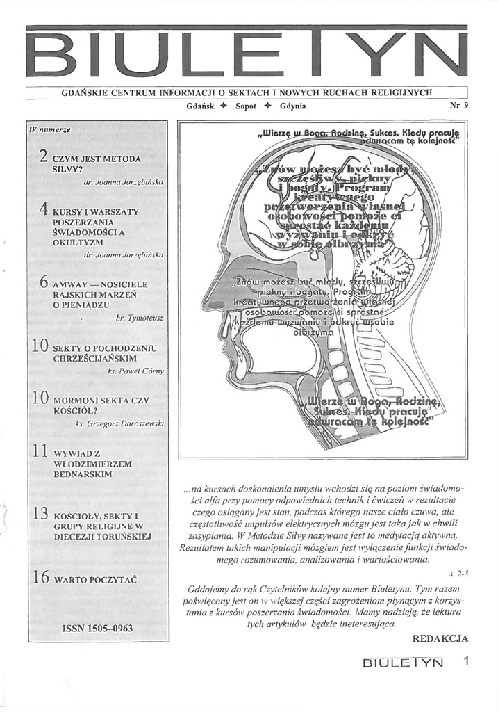 B ilU L E UY N G DAŃSK IE CENTRUM INFORMACJT O SEKTACH T NOW YCH R U C H A C H RELIG IJNYC H _________ Gdańsk A Sopot + Gdynia Nr 9 W num erze 2 CZYM JEST M ETODA SILVY? dr. Joanna Jarzębińska 4 KURSY I W ARSZATY PO SZERZANIA ŚW IADOM OŚCI A OKULTYZM dr. Joanna Jarzębińska 6 AM'WAY — NOSICIELE RAJSKICH M ARZEŃ O PIENIĄDZU br. Tymoteusz 10 SEKTY O POCHODZENIU CHRZEŚCIJAŃSKIM ks. Paweł Górny 10 MORMONI SEKTA CZY KOŚCIÓŁ? ks. Grzegorz Daroszewski 11 W YW IAD Z W ŁODZIM IERZEM BEDNARSKIM 13 16 KOŚCIOŁY, SEKTY I GRUPY RELIGIJNE W DIECEZJI TORUŃSKIEJ ...na kursach doskonalenia umysłu wchodzi się na poziom świadomo ści alfa przy pomocy odpowiednich technik i ćwiczeń w rezultacie czego osiągany jest stan, podczas którego nasze ciało czuwa, ale częstotliwość impulsów elektrycznych mózgu jest taka ja k w chwili zasypiania. W Metodzie Silvy nazywane jest to medytacją aktywną. Rezultatem takich manipulacji mózgiem jest wyłączenie funkcji świado mego rozumowania, analizowania i wartościowania. s. 2-3 W ARTO POCZYTAĆ ISSN 1505-0963 Oddajemy do rąk Czytelników kolejny numer Biuletynu. Tym razem poświęcony jest on w większej części zagrożeniom płynącym z korzys tania z kursów poszerzania świadomości. Mamy nadzieję, że lektura tych artykułów będzie ineteresująca. REDAKCJA BIULE I YN 1 CZYM J€ST MCTODH SILW ? CZYM JEST METODA SILYY? Białej, Bydgoszczy, Zabrzu, Białymstoku itd. Miejscowości, w których organizuje się kursy Silvy w Polsce jest coraz więcej, osób kończących tego typu kursy różnego stopnia także. Czym jednak jest metoda Silvy i na czym polega zagrożenie z nią związane? Aby odpowiedzieć na te pytania, należy przeanalizować techniki proponowane na kursie. Podstawowym ćwiczeniem, od U podstaw tych obietnic leży zapewnienie o nieograniczo którego zaczynają szkolenie wszyscy uczestnicy są ćwiczenia nych jakoby możliwościach naszego umysłu lub, jak to się też zwane relaksacyjnymi. M ają one na celu opanowanie szybkiego często określa, nieograniczonym potencjale ludzkim. Zachęty wchodzenia w stan umysłu alfa, czyli na poziom świadomości i obietnice organizatorów kursów brzmią mniej więcej tak: z dominującą częstotliwościąfal mózgowych typu alfa (od 7 do „Znów możesz być miody, szczęśliwy, piękny i bogaty. Pro 14 cykli na sekundę). Jest to taki stan umysłu, jaki osiąga nasz gram kreatywnego przetworzenia własnej osobowości po organizm w sposób naturalny tuż przed zaśnięciem. Można może ci sprostać każdem u wyz byłoby więc zastanowić się, waniu i odkryć w sobie olbrzy cóż złego jest w wykorzysty ma”. Tego typu cytaty reklam i w aniu naturalnego stanu na ...na kursach doskonalenia umysłu wchodzi się ofert można by mnożyć, a znaleźć na poziom świadomości alfa przy pomocy odpo szego organizmu do relaksu. je można najczęściej w czasopis Oczywiście nic, jeśli na relak wiednich technik i ćwiczeń w rezultacie czego mach, zwłaszcza tych pośw ięco sie cała sprawa by się skończy osiągany jest stan, podczas którego nasze ciało nych parapsychologii, astrologii, ła. C hodzi tu jednak o coś radiestezji, medycynie alternatyw czuwa, ale częstotliwość impulsów>elektrycznych w ięcej. Zwróćmy uwagę, że na nej. mózgu jest taka ja k w chwili zasypiania. W Meto kursach doskonalenia umys Jednym z takich kursów, pro łu w chodzi się na poziom dzie Silvy nazywane jest to medytacją aktywną. ponowanym również dla dzieci, świadomości alfa przy pomo Rezultatem takich manipulacji mózgiem jest jest kurs doskonalenia um ysłu m e cy odpow iednich technik i todą Silvy. Ponieważ w ielu chrześ ćwiczeń w rezultacie czego wyłączenie funkcji świadomego rozumowania, cijan nie zdaje sobie często sprawy osiągany jest stan, podczas analizowania i wartościowania. z zagrożeń związanych z tego typu którego nasze ciało czuwa, kursami, warto uświadomić sobie co leży u ich źródeł. ale częstotliwość impulsów elektrycznych mózgu jest taka N apoczątku kilka słów o twórcy metody. Jose Silva urodził jak w chwili zasypiania. W Metodzie Silvy nazywane jest to się w Teksasie w 1914 r. N igdy nie chodził do szkoły, a czytać m edytacją ak tyw n ą. R ezu ltatem tak ich m an ip u lacji i pisać nauczył się od rodzeństwa. W czasie pobytu w wojsku mózgiem jest wyłączenie funkcji świadomego rozumowania, pod wpływem dzieł Junga, Freuda, Adlera zainteresował się analizowania i wartościowania. Potwierdza to jeden z amery problemami pracy m ózgu. Jednocześnie pasjonowała go kańskich badaczy problemu, Richard L. Watring. Uwraża on, iż literatura metafizyczna i parapsychologiczna. Inspirowany metody jakie stosuje się na kursach samokontroli mózgu pro taką właśnie lekturą zaczął prowadzić doświadczenia z hip wadzą do zmiany świadomości i w yw ołująstan umysłu pozba nozą, starając się przy jej pom ocy doskonalić pamięć wiający człowieka zdolności podejmowania rozumowej decy ludzką. Zrezygnowawszy po pewnym czasie z tych prób, zji, co do informacji, o której przyjęcie jest proszony. W zwią zajął się innym i ćwiczeniami trenującymi umysł, m.in. kon zku z tym istnieje ogromne niebezpieczeństwo manipulowania centracją relaksacyjną i ćwiczeniami pozwalającymi na do światopoglądem danej osoby. Podobne wnioski wyciągają inni tarcie do niższych poziomów aktywności fał mózgowych. psychologowie amerykańscy, uważając, że gdy uczestnicy Tak właśnie narodziła się metoda „Silva Mind Control” seansów znajdująsię w zmienionym stanie świadomości, wów (kontrola mózgu SIivy). Pod koniec 1966 r. oraz przez dwa czas liderzy grup potrafią zaszczepić w ich umyśle nowe idee następne lata Jose Silva je ź d z ił po Teksasie w ykładając i zmienić ich sposób m yślenia.1 i wypróbowując sw oją metodę. Obecnie Metoda Silvy jest Inną techniką proponowaną na kursach Silvy są ć