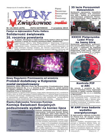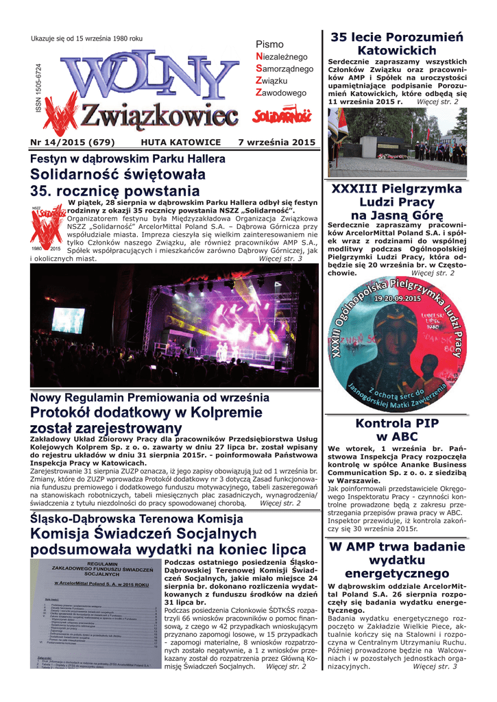 Ukazuje się od 15 września 1980 roku ISSN 1505-6724 Pismo Niezależnego Samorządnego Związku Zawodowego Nr 14/2015 (679) HUTA KATOWICE 35 lecie Porozumień Katowickich Serdecznie zapraszamy wszystkich Członków Związku oraz pracowników AMP i Spółek na uroczystości upamiętniające podpisanie Porozumień Katowickich, które odbędą się 11 września 2015 r. Więcej str. 2 7 września 2015 Festyn w dąbrowskim Parku Hallera Solidarność świętowała 35. rocznicę powstania W piątek, 28 sierpnia w dąbrowskim Parku Hallera odbył się festyn rodzinny z okazji 35 rocznicy powstania NSZZ „Solidarność”. Organizatorem festynu była Międzyzakładowa Organizacja Związkowa NSZZ „Solidarność” ArcelorMittal Poland S.A. – Dąbrowa Górnicza przy współudziale miasta. Impreza cieszyła się wielkim zainteresowaniem nie tylko Członków naszego Związku, ale również pracowników AMP S.A., Spółek współpracujących i mieszkańców zarówno Dąbrowy Górniczej, jak i okolicznych miast. Więcej str. 3 XXXIII Pielgrzymka Ludzi Pracy na Jasną Górę Serdecznie zapraszamy pracowników ArcelorMittal Poland S.A. i spółek wraz z rodzinami do wspólnej modlitwy podczas Ogólnopolskiej Pielgrzymki Ludzi Pracy, która odbędzie się 20 września br. w Częstochowie. Więcej str. 2 Nowy Regulamin Premiowania od września Protokół dodatkowy w Kolpremie został zarejestrowany Zakładowy Układ Zbiorowy Pracy dla pracowników Przedsiębiorstwa Usług Kolejowych Kolprem Sp. z o. o. zawarty w dniu 27 lipca br. został wpisany do rejestru układów w dniu 31 sierpnia 2015r. - poinformowała Państwowa Inspekcja Pracy w Katowicach. Zarejestrowanie 31 sierpnia ZUZP oznacza, iż jego zapisy obowiązują już od 1 września br. Zmiany, które do ZUZP wprowadza Protokół dodatkowy nr 3 dotyczą Zasad funkcjonowania funduszu premiowego i dodatkowego funduszu motywacyjnego, tabeli zaszeregowań na stanowiskach robotniczych, tabeli miesięcznych płac zasadniczych, wynagrodzenia/ świadczenia z tytułu niezdolności do pracy spowodowanej chorobą. Więcej str. 2 Śląsko-Dąbrowska Terenowa Komisja Komisja Świadczeń Socjalnych podsumowała wydatki na koniec lipca Podczas ostatniego posiedzenia ŚląskoDąbrowskiej Terenowej Komisji Świadczeń Socjalnych, jakie miało miejsce 24 sierpnia br. dokonano rozliczenia wydatkowanych z funduszu środków na dzień 31 lipca br. Podczas posiedzenia Członkowie ŚDTKŚS rozpatrzyli 66 wniosków pracowników o pomoc finansową, z czego w 42 przypadkach wnioskującym przyznano zapomogi losowe, w 15 przypadkach - zapomogi materialne, 8 wniosków rozpatrzonych zostało negatywnie, a 1 z wniosków przekazany został do rozpatrzenia przez Główną Komisję Świadczeń Socjalnych. Więcej str. 2 Kontrola PIP w ABC We wtorek, 1 września br. Państwowa Inspekcja Pracy rozpoczęła kontrolę w spółce Ananke Business Communication Sp. z o. o. z siedzibą w Warszawie. Jak poinformowali przedstawiciele Okręgowego Inspektoratu Pracy - czynności kontrolne prowadzone będą z zakresu przestrzegania przepisów prawa pracy w ABC. Inspektor przewiduje, iż kontrola zakończy się 30 września 2015r. W AMP trwa badanie wydatku energetycznego W dąbrowskim oddziale ArcelorMittal Poland S.A. 26 sierpnia rozpoczęły się badania wydatku energetycznego. Badania wydatku energetycznego rozpoczęto w Zakładzie Wielkie Piece, aktualnie kończy się na Stalowni i rozpoczyna w Centralnym Utrzymaniu Ruchu. Później prowadzone będzie na Walcowniach i w pozostałych jednostkach organizacyjnych. Więcej str. 3 Nowy Regulamin Premiowania od września ZUZP w Kolpremie został zarejestrowany C. d. ze str. 1 Zgodnie z zapisami - fundusz premiowy jest uruchamiany miesięcznie w wysokości 7% od płac zasadniczych pracowników Spółki wg stanu na ostatni dzień miesiąca, za który fundusz jest uruchamiany. Podziału Funduszu proporcjonalnie do udziału płac zasadniczych na poszczególne brygady/zespoły dokonuje Biuro Zarządzania Personelem. Regulamin nie daje możliwości przemieszczania środków między brygadami/zespołami pracowników wykonujących prace na stanowiskach robotniczych i nierobotniczych, ani też pozbawienia jakiejkolwiek jednostki organizacyjnej funduszu premiowego. Decyzję o wysokości premii indywidualnej podejmuje jednoosobowo w sposób uznaniowy bezpośredni przełożony uzależniając ją od stopnia realizacji wyznaczonych zadań premiowych, informując o niej pracownika bez zwłoki. W przypadku obniżenia indywidualnego funduszu premiowego o więcej niż 50% w stosunku do iloczynu płacy zasadniczej oraz procentowej wysokości funduszu premiowego - przełożony zobowiązany jest do pisemnego uzasadnienia podjętej decyzji. Maksymalna wysokość premii nie może być wyższa niż 150% iloczynu płacy zasadniczej oraz procentowej wysokości funduszu premiowego. Premia nie przysługuje (proporcjonalnie do nieobecności) za okres nieobecności niepłatnej, spowodowanej chorobą, urlopem macierzyńskim, ojcowskim, rodzicielskim, wypadkiem w pracy, zwolnieniem z obowiązku świadczenia pracy, świadczeniem rehabilitacyjnym lub koniecznością sprawowania opieki nad chorym członkiem rodziny, za który to okres pracownik otrzymuje wynagrodzenie chorobowe lub zasiłek z ubezpieczenia społecznego. W innych sytuacjach pracownik nie może być premii pozbawiony. Dodatkowy fundusz motywacyjny tworzy się w wysokości do 3% rocznej planowanej płacy zasadniczej pracowników Spółki za pracę przy obsłudze lokomotywy zdalnie sterowanej, a uruchamia się za realizację szczególnie ważnych zadań i działań powodujących zmniejszenie kosztów operacyjnych Spółki, wdrażanie zadań inwestycyjnych, inicjatywy i realizację dodatkowych programów i przedsięwzięć w zakresie poprawy BHP, pracę przy lokomotywie zdalnie sterowanej. Ten ostatni tworzy się na podstawie planowanej ilości przewozów i planowanej ilości uruchamianych lokomotyw i przysługuje