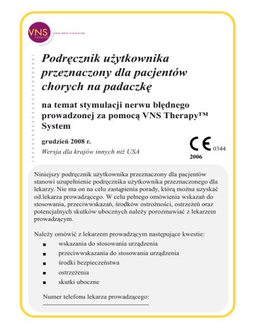 Podręcznik użytkownika przeznaczony dla pacjentów chorych na padaczkę na temat stymulacji nerwu błędnego prowadzonej za pomocą VNS Therapy™ System grudzień 2008 r. Wersja dla krajów innych niż USA Niniejszy podręcznik użytkownika przeznaczony dla pacjentów stanowi uzupełnienie podręcznika użytkownika przeznaczonego dla lekarzy. Nie ma on na celu zastąpienia porady, którą można uzyskać od lekarza prowadzącego. W celu pełnego omówienia wskazań do stosowania, przeciwwskazań, środków ostrożności, ostrzeżeń oraz potencjalnych skutków ubocznych należy porozmawiać z lekarzem prowadzącym. Należy omówić z lekarzem prowadzącym następujące kwestie: wskazania do stosowania urządzenia przeciwwskazania do stosowania urządzenia środki bezpieczeństwa ostrzeżenia skutki uboczne Numer telefonu lekarza prowadzącego: Podręcznik użytkownika przeznaczony dla pacjentów chorych na padaczkę 26-0007-0200/2 © Copyright 2006, 2008 Cyberonics, Inc., Houston, Teksas Wszelkie prawa zastrzeżone. Cyberonics® i NCP® są zarejestrowanymi znakami handlowymi firmy Cyberonics, Inc. „VNS”, „VNS Therapy”, „Demipulse”, „Demipulse Duo” i „Perennia” są zarejestrowanymi znakami handlowymi Cyberonics, Inc. Układ generatora impulsów VNS Therapy™ Pulse Generator (łącznie z jego częściami składowymi) oraz zastosowanie opisywanego układu do leczenia epilepsji i/lub depresji jest chronione przez jeden lub większą liczbę amerykańskich patentów o numerach 4,867,164, 4,979,511, 5,154,172, 5,179,950, 5,186,170, 5,222,494, 5,235,980 i 5,299,569, jak również przez patenty międzynarodowe odpowiadające wymienionym powyżej. Pozostałe patenty są w trakcie opracowywania. ii – Cyberonics 26-0007-0200/2 (poza obszarem USA) Podręcznik użytkownika przeznaczony dla pacjentów chorych na padaczkę Spis treści 1. SŁOWNICZEK POJĘĆ.................................................................................1 2. WPROWADZENIE DO VNS THERAPY™ SYSTEM.................................4 3. VNS THERAPY SYSTEM.............................................................................5 3.1. Części VNS Therapy System................................................................5 4. 5. WSKAZÓWKI DLA PACJENTÓW.............................................................9 KTO KORZYSTA Z LECZENIA METODĄ VNS THERAPY?.................12 5.1. Wskazania do stosowania....................................................................12 5.2. Przeciwwskazania (Kiedy nie powinno się stosować VNS Therapy).....................................................................................12 6. OSTRZEŻENIA I ŚRODKI OSTROŻNOŚCI.............................................14 6.1. Ostrzeżenia..........................................................................................14 6.2. Środki ostrożności...............................................................................17 6.3. Zagrożenia ze strony otoczenia...........................................................17 6.4. Zagrożenia związanie z prowadzeniem leczenia................................19 6.5. Oddziaływanie na inne urządzenia......................................................20 7. UCZESTNICY BADANIA KLINICZNEGO...............................................22 7.1. Skutki uboczne....................................................................................22 7.2. Nagłe niewyjaśnione przypadki zgonu pacjentów z 8. padaczką (SUDEP)............................................................................28 KORZYŚCI WYNIKAJĄCE ZE STOSOWANIA VNS THERAPY...........30 8.1. Zmniejszenie wskaźnika napadów drgawkowych..............................30 8.2. Pozostałe korzyści...............................................................................30 8.3. Stopniowa poprawa.............................................................................31 8.4. Opisywana terapia nie jest metodą prowadzącą do wyleczenia padaczki............................................................................31 9. PROCEDURA IMPLANTACJI URZĄDZENIA.........................................32 Cyberonics 26-0007-0200/2 (poza obszarem USA) – iii Podręcznik użytkownika przeznaczony dla pacjentów chorych na padaczkę 9.1. Zabieg chirurgiczny (operacja).........................................................32 9.2. Okres obserwacji po zabiegu chirurgicznym...................................32 9.3. Leki przeciwpadaczkowe (leki na drgawki).......................................33 9.4. Tryby programowania........................................................................33 10. MAGNESY CYBERONICS.........................................................................35 10.1. Jak obsługiwać magnesy firmy Cyberonics......................................35 10.2. Jak używać magnesów firmy Cyberonics........................................36 10.3. W jaki sposób działają magnesy...................................................41 10.4. Jak wymienić magnesy firmy Cyberonics........................................44 11. POZOSTAŁE WAŻNE INFORMACJE DOTYCZĄCE VNS THERAPY SYSTEM...................................................................................45 11.1. Powikłania związane ze stosowaniem urządzenia..............................45 12. GWARANCJA FIRMY CYBERONICS PRZEZNACZONA DLA PACJENTA ORAZ LISTA DANYCH DOTYCZĄCYCH BEZPIECZEŃSTWA...................................................................................48 13. NAJCZĘŚCIEJ ZADAWANE PYTANIA....................................................49 14. INFORMACJE KONTAKTOWE................................................................57 iv – Cyberonics 26-0007-0200/2 (poza obszarem USA) Podręcznik użytkownika przeznaczony dla pacjentów chorych na padaczkę Wykaz rysunków RYSUNEK NR 1 WSZCZEPIALNE CZĘŚCI VNS THERAPY SYSTEM..................................................................