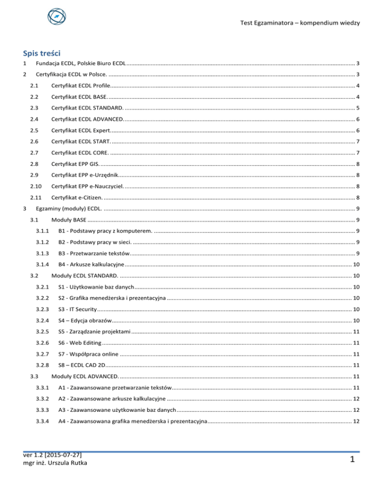 Test Egzaminatora – kompendium wiedzy Spis treści 1 Fundacja ECDL, Polskie Biuro ECDL ............................................................................................................................................. 3 2 Certyfikacja ECDL w Polsce. ........................................................................................................................................................ 3 3 2.1 Certyfikat ECDL Profile....................................................................................................................................................... 4 2.2 Certyfikat ECDL BASE. ........................................................................................................................................................ 4 2.3 Certyfikat ECDL STANDARD. .............................................................................................................................................. 5 2.4 Certyfikat ECDL ADVANCED. .............................................................................................................................................. 6 2.5 Certyfikat ECDL Expert. ...................................................................................................................................................... 6 2.6 Certyfikat ECDL START. ...................................................................................................................................................... 7 2.7 Certyfikat ECDL CORE. ....................................................................................................................................................... 7 2.8 Certyfikat EPP GIS. ............................................................................................................................................................. 8 2.9 Certyfikat EPP e-Urzędnik. ................................................................................................................................................. 8 2.10 Certyfikat EPP e-Nauczyciel. .............................................................................................................................................. 8 2.11 Certyfikat e-Citizen. ........................................................................................................................................................... 8 Egzaminy (moduły) ECDL. ........................................................................................................................................................... 9 3.1 Moduły BASE ..................................................................................................................................................................... 9 3.1.1 B1 - Podstawy pracy z komputerem. ............................................................................................................................ 9 3.1.2 B2 - Podstawy pracy w sieci. ......................................................................................................................................... 9 3.1.3 B3 - Przetwarzanie tekstów........................................................................................................................................... 9 3.1.4 B4 - Arkusze kalkulacyjne ............................................................................................................................................ 10 3.2 Moduły ECDL STANDARD. ............................................................................................................................................... 10 3.2.1 S1 - Użytkowanie baz danych ...................................................................................................................................... 10 3.2.2 S2 - Grafika menedżerska i prezentacyjna .................................................................................................................. 10 3.2.3 S3 - IT Security ............................................................................................................................................................. 10 3.2.4 S4 – Edycja obrazów.................................................................................................................................................... 10 3.2.5 S5 - Zarządzanie projektami ........................................................................................................................................ 11 3.2.6 S6 - Web Editing .......................................................................................................................................................... 11 3.2.7 S7 - Współpraca online ............................................................................................................................................... 11 3.2.8 S8 – ECDL CAD 2D........................................................................................................................................................ 11 3.3 Moduły ECDL ADVANCED. ............................................................................................................................................... 11 3.3.1 A1 - Zaawansowane przetwarzanie tekstów............................................................................................................... 11 3.3.2 A2 - Zaawansowane arkusze kalkulacyjne .................................................................................................................. 12 3.3.3 A3 - Zaawansowane użytkowanie baz danych ............................................................................................................ 12 3.3.4 A4 - Zaawansowana grafika menedżerska i prezentacyjna......................................................................................... 12 ver 1.2 [2015-07-27] mgr inż. Urszula Rutka 1 Test Egzaminatora – kompendium wiedzy 3.4 Moduły ECDL CORE/START. ....................