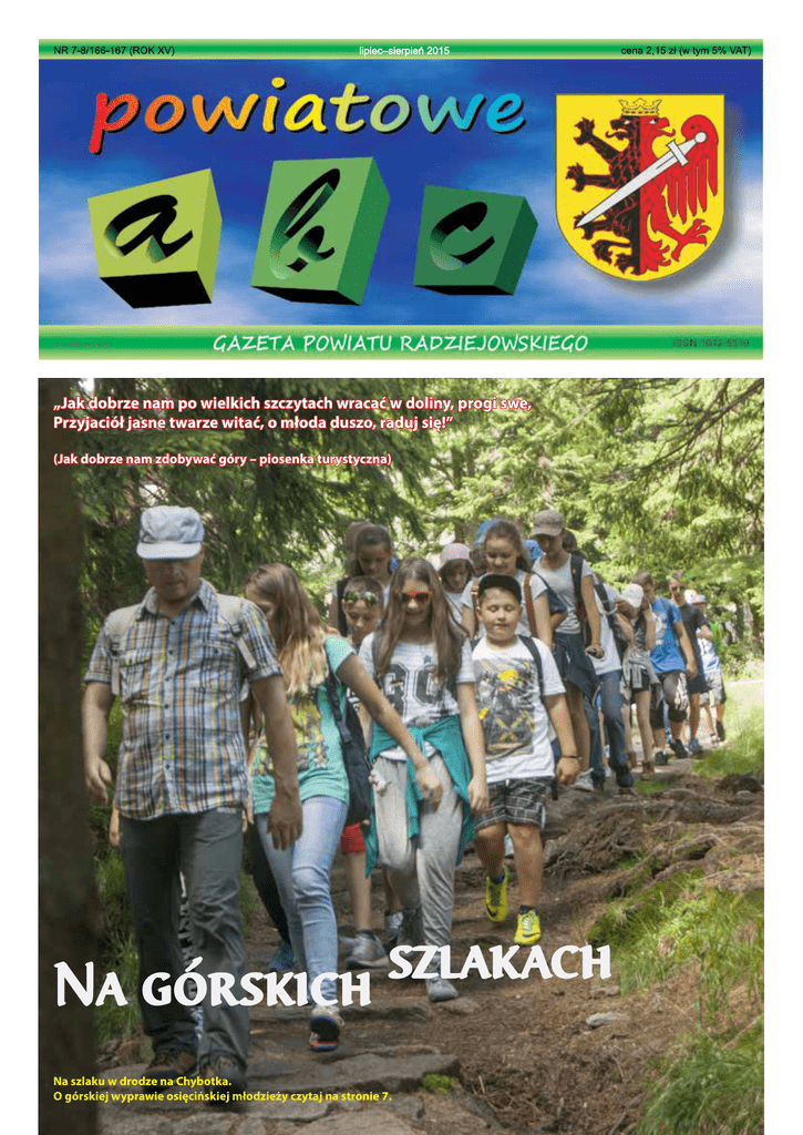 „Jak dobrze nam po wielkich szczytach wracać w doliny, progi swe, Przyjaciół jasne twarze witać, o młoda duszo, raduj się!” (Jak dobrze nam zdobywać góry – piosenka turystyczna) szlakach Na górskich Na szlaku w drodze na Chybotka. O górskiej wyprawie osięcińskiej młodzieży czytaj na stronie 7. Wieści samorządowe Młodzież w Europie – Stralsund 2015 Kolejny projekt za nami. W dniach 1.08.2015-6.08.2015 grupa młodzieży z powiatu radziejowskiego wraz z dwiema opiekunkami brała udział w projekcie o tematyce ekologicznej. Organizatorem był partner niemiecki, a projekt dofinansowany został ze środków UE, pocztę niemiecką oraz niemieckich sponsorów. Warunkiem uczestnictwa w projekcie było zaangażowanie w działanie Rady Młodzieżowej oraz wpłata 100 euro. Rankiem wraz z naszymi przyjaciółmi z Litwy wyruszyliśmy w drogę. Po kilku godzinach jazdy przekroczyliśmy polsko-niemiecką granicę. Po następnych kilku godzinach byliśmy już na miejscu. W Stralsund czekali na nas Francuzi, Niemcy i Węgrzy. Szybko zakwaterowaliśmy się, zjedliśmy posiłek i wspólnie spędziliśmy wieczór. Pierwszego dnia swoje prezentacje przedstawiła młodzież z Węgier i Francji. Nasi francuscy koledzy przygotowali film, który cieszył się dużym zainteresowaniem. Poruszono w nim tematy dotyczące m.in.: ochrony przyrody, alternatywnych źródeł energii, segregacji śmieci. Po warsztatach wraz z przewodnikiem udaliśmy się na rajd po mieście. Naszym zadaniem było udzielenie odpowiedzi na pytania związane z historią miasta. Wieczór spędziliśmy przy ognisku. Piekliśmy chleb, a czas uprzyjemniał nam koncert duetu gitarowego. Klaudia w czasie prezentacji multimedialnej polskiej grupy Wtorek spędziliśmy aktywnie. Najpierw płynęliśmy statkiem i podziwialiśmy piękno przyrody. Później wszyscy wyruszyliśmy rowerami do Parku Narodowego. W środę wybraliśmy się do oceanarium. W czwartek obejrzeliśmy prezentację grupy niemieckiej i udaliśmy się do miasta. Następnie pożegnaliśmy grupę niemiecką, francuską i węgierską, a chwilę później odjeżdżaliśmy wraz z grupą litewską. W partnerskim kręgu Kolejna atrakcja – park linowy W poniedziałek w integracji pomagali nam animatorzy, którzy wypełnili nam przedpołudnie różnymi zadaniami i grami zespołowymi. Następnie odbyły się warsztaty, na których grupa polska i litewska przedstawiała swoje prezentacje. Wieczorem była dyskoteka. Serdecznie dziękujemy niemieckim organizatorom, w szczególności Pani Christianie za to, że po raz kolejny mogliśmy uczestniczyć w projekcie. Dziękujemy za wspaniałą atmosferę. Do zobaczenia za rok na Litwie! Tekst: Malwina Grabowska, Milena Lewandowska Foto: Alicja Górczyńska Radziejowscy strażacy z wizytą w Wahrenholz Od 12 do 14 czerwca 2015 r. delegacja strażaków z komendy powiatowej PSP i Oddziału Powiatowego ZOSP RP wyjechała na zaproszenie niemieckich kolegów do Wahrenholz w Dolnej Saksonii. Program trzydniowej wizyty był bardzo urozmaicony: spotkanie ze strażakami z Wahrenholz, samorządowcami gminy, zwiedzanie miejscowości Gifhorn. W drugim dniu wizyty wspólnie udaliśmy się do Hanoweru na Międzynarodowe Targi Pożarnictwa, Klęsk Żywiołowych, Ratownictwa, Bezpieczeństwa i Ochrony – „Interschutz 2015”, gdzie oglądaliśmy wystawiony sprzęt pożarniczy i ratowniczy. Szczególnym zainteresowaniem cieszyły się stoiska wystawowe z pojazdami pożarniczymi i specjalistycznymi. Tekst: Jarosław Stokwisz Foto: nadesłane Wspólne zdjęcie uczestników spotkania Informacje Lipcowa akcja poboru krwi W Radziejowie obyła się kolejna akcja honorowego poboru krwi. Zorganizowało ją Regionalne Centrum Krwiodawstwa i Krwiolecznictwa w Bydgoszczy. 80. krwiodawców oddało 36 litrów najcenniejszego leku, zaś podczas Dni Piotrkowa Kujawskiego – w kolejnej akcji – 53 krwiodawców oddało 24 litry krwi. Grażyna Koźmińska z RCKiK i Michał Fryska z Morzyczyna Tekst/Foto: Mirosław Kowalski 1 Szpital radziejowski informuje!!! Pracownia Diagnostyki Laboratoryjnej, Pracownia Diagnostyki Mikrobiologicznej i Pracownia Serologii z Bankiem Krwi świadczą usługi zarówno dla komórek organizacyjnych SP ZOZ Radziejów, jak również dla pacjentów, pragnących wykonać badania prywatnie. Za badania zlecone przez lekarzy, którzy nie mają podpisywanych umów z SP ZOZ w Radziejowie oraz na prywatne życzenia pacjenci ponoszą opłaty wg cennika. Cennik badań wykonywanych stacjonarnie jest wywieszony przed Punktem Pobrań Laboratorium (parter, budynek główny szpitala). Pracownie Laboratorium wykonują na miejscu około 150 badań różnego typu ze zróżnicowanego materiału (pobranego na miejscu w Punkcie Pobrań Laboratorium lub dostarczonego przez pacjentów). Kilkaset innych badań jest po pobraniu wysyłanych do innego wykonawcy, a wyniki po kilku dniach są do odbioru w sekretariacie Laboratorium. Pobieranie materiału do badań w Punkcie Pobrań jest codziennie w dni robocze od godz. 7.30 do godz. 9.30 bez uprzednich rejestracji lub zapisów. Niemal wszystkie wyniki badań wykonywanych stacjonarnie są w tym samym miejscu i czasie gotowe do odbioru dnia następnego. Za badania płatne pacjent otrzymuje paragon fiskalny z możliwością uzyskania faktury w Dziale Księgowości SP ZOZ (pierwsze piętro – budynek administracji). Pacjent, który zgłasza się po odbiór wyników, powinien mieć potwierdzenie pobrania materiału, uprawniające go do odbioru danych (zachowywana jest ich poufność). W dni ustawowo wolne od pracy personel dyżurujący wykonuje świadczenia dla jednostek szpitala. Badania analityczne wykonywane są przez doświadczony personel, na sprzęcie nie odbiegającym standardem od placówek o wyższej randze. Jakość wyników jest monitorowana zarówno przez codzienną kontrolę wewnętrzną, jak i okresowo przez kontrole ogólnopolskie. W wynikach kontroli ogólnopolskich laboratorium osiąga dobre i