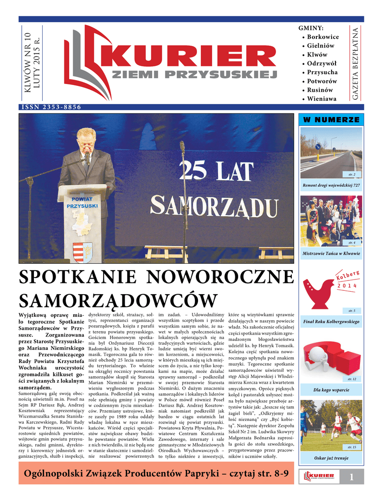 ISSN 2353-8856 GAZETA BEZPŁATNA KLWÓW NR 10 LUTY 2015 r. GMINY: • Borkowice • Gielniów • Klwów • Odrzywół • Przysucha • Potworów • Rusinów • Wieniawa W N U M E R Z E str. 2 Remont drogi wojewódzkiej 727 str. 4 Mistrzowie Tańca w Klwowie SPOTKANIE NOWOROCZNE SAMORZĄDOWCÓW Wyjątkową oprawę miało tegoroczne Spotkanie Samorządowców w Przysusze. Zorganizowana przez Starostę Przysuskiego Mariana Niemirskiego oraz Przewodniczącego Rady Powiatu Krzysztofa Wochniaka uroczystość zgromadziła kilkuset gości związanych z lokalnym samorządem. Samorządową galę swoją obecnością uświetnili m.in. Poseł na Sejm RP Dariusz Bąk, Andrzej Kosztowniak reprezentujący Wicemarszałka Senatu Stanisława Karczewskiego, Radni Rady Powiatu w Przysusze, Wicestarostowie sąsiednich powiatów, wójtowie gmin powiatu przysuskiego, radni gminni, dyrektorzy i kierownicy jednostek organizacyjnych, służb i inspekcji, dyrektorzy szkół, strażacy, sołtysi, reprezentanci organizacji pozarządowych, księża z parafii z terenu powiatu przysuskiego. Gościem Honorowym spotkania był Ordynariusz Diecezji Radomskiej ks. bp Henryk Tomasik. Tegoroczna gala to również obchody 25 lecia samorządu terytorialnego. To właśnie na okrągłej rocznicy powstania samorządów skupił się Starosta Marian Niemirski w przemówieniu wygłoszonym podczas spotkania. Podkreślał jak ważną role spełniają gminy i powiaty w codziennym życiu mieszkańców. Przemiany ustrojowe, które zaszły po 1989 roku oddały władzę lokalna w ręce mieszkańców. Wśród części specjalistów największe obawy budziło powstanie powiatów. Wielu z nich twierdziło, iż nie będą one w stanie skutecznie i samodzielnie realizować powierzonych im zadań. – Udowodniliśmy wszystkim sceptykom i przede wszystkim samym sobie, że nawet w małych społecznościach lokalnych opierających się na tradycyjnych wartościach, gdzie ludzie umieją być wierni swoim korzeniom, a miejscowości, w których mieszkają są ich miejscem do życia, a nie tylko kropkami na mapie, może działać sprawny samorząd – podkreślał w swojej przemowie Starosta Niemirski. O dużym znaczeniu samorządów i lokalnych liderów w Polsce mówił również Poseł Dariusz Bąk. Andrzej Kosztowniak natomiast podkreślił jak bardzo w ciągu ostatnich lat rozwinął się powiat przysuski. Powiatowa Kryta Pływalnia, Powiatowe Centrum Kształcenia Zawodowego, internaty i sale gimnastyczne w Młodzieżowych Ośrodkach Wychowawczych – to tylko niektóre z inwestycji, które są wizytówkami sprawnie działających w naszym powiecie władz. Na zakończenie oficjalnej części spotkania wszystkim zgromadzonym błogosławieństwa udzielił ks. bp Henryk Tomasik. Kolejna część spotkania noworocznego upłynęła pod znakiem muzyki. Tegoroczne spotkanie samorządowców uświetnił występ Alicji Majewskiej i Włodzimierza Korcza wraz z kwartetem smyczkowym. Oprócz pięknych kolęd i pastorałek usłyszeć można było największe przeboje artystów takie jak: „Jeszcze się tam żagiel bieli”, „Odkryjemy miłość nieznaną” czy „Być kobietą”. Następnie dyrektor Zespołu Szkół Nr 2 im. Ludwika Skowyry Małgorzata Bednarska zaprosiła gości do stołu szwedzkiego, przygotowanego przez pracowników i uczniów szkoły. Ogólnopolski Związek Producentów Papryki – czytaj str. 8-9 str. 5 Finał Roku Kolbergowskiego str. 12 Dla kogo wsparcie str. 15 Oskar już trenuje 1 Wspaniała wiadomość dla kierowców z naszego powiatu! Szanowni Państwo, mieszkańcy miejscowości położonych przy drodze wojewódzkiej nr 727 relacji Klwów – Przysucha. Z niezwykłą radością pragnę poinformować, iż Zarząd Województwa Mazowieckiego na czele z Marszałkiem Województwa Adamem Struzikiem wprowadził do budżetu Wieloletniej Prognozy Finansowej budowę drogi wojewódzkiej nr 727 od miejscowości Sady-Kolonia do Skrzyńska o długości 10 kilometrów. Jeszcze w tym roku zostanie wykonany odcinek drogi o wartości 8 milionów złotych. Po konsultacji z Dyrektorem Mazowieckiego Zarządu Dróg Wojewódzkich, Zarządem Powiatu Przysuskiego, Burmistrzem Miasta i Gminy Przysucha, jak również Wójtem Gminy Borkowice Robertem Fidosem (mieszkańcem Skrzyńska) podjęliśmy decyzję, biorąc pod uwagę przede wszystkim potrzeby mieszkańców, że budowa drogi rozpocznie się od Skrzyńska i przez kolejne lata do zakończenia kadencji będzie połączona z nowo powstałym odcinkiem Klwów – Sady-Kolonia. Pragnę również zwrócić uwagę, że fakt budowy drogi już w tym roku jest możliwy przede wszystkim dzięki wygraniu przez Samorząd Województwa Mazowieckiego w Trybunale Konstytucyjnym sprawy tzw. „Janosikowego” i pozyskanie przez to dodatkowych środków finansowych, oczywiście nie bez znaczenia pozostaje fakt sukcesu samorządowego Polskiego Stronnictwa Ludowego w wyborach samorządowych i wyboru właściwych ludzi, którzy we właściwy sposób zabiegali, a nawet prosili o to, co jest najważniejsze na dzień dzisiejszy dla Północy Powiatu Przysuskiego, a szczególnie dla mieszkańców Skrzyńska, Janikowa, Glińca, Woli Więcierzowej i Sadów, bo macje chciałbym przekazywać ci którzy tam mieszkają lub jeż- Państwu jak najczęściej, bo spradżą wiedzą o czym piszę. wiają mi mnóstwo satysfakcji. Szanowni Państwo takie infor- Z wyrazami szacunku Wójt Gminy Klwów Prezes ZP PSL w Przysusze Piotr Papis MOŻEMY POMÓC LUDZIOM W POTRZEBIE W każdym z nas tkwi potrzeba krzewienia dobra. Stąd bierze się wielka popularność medialnych akcji charytatywnych. Telewizja ma wielką siłę sprawczą i cieszy się naszym zaufaniem. Informacja podana publicznie wydaje się być później publicznie weryfikowalna. Dlatego ufamy telewizyjnym apelom i wysyłamy sms-y charytatywne, czy bierzemy udział w wielkich akcjach. Pomagamy ludziom poprzez wypromowane medialnie fundacje przekazując do dyspozycji decydentów ogr