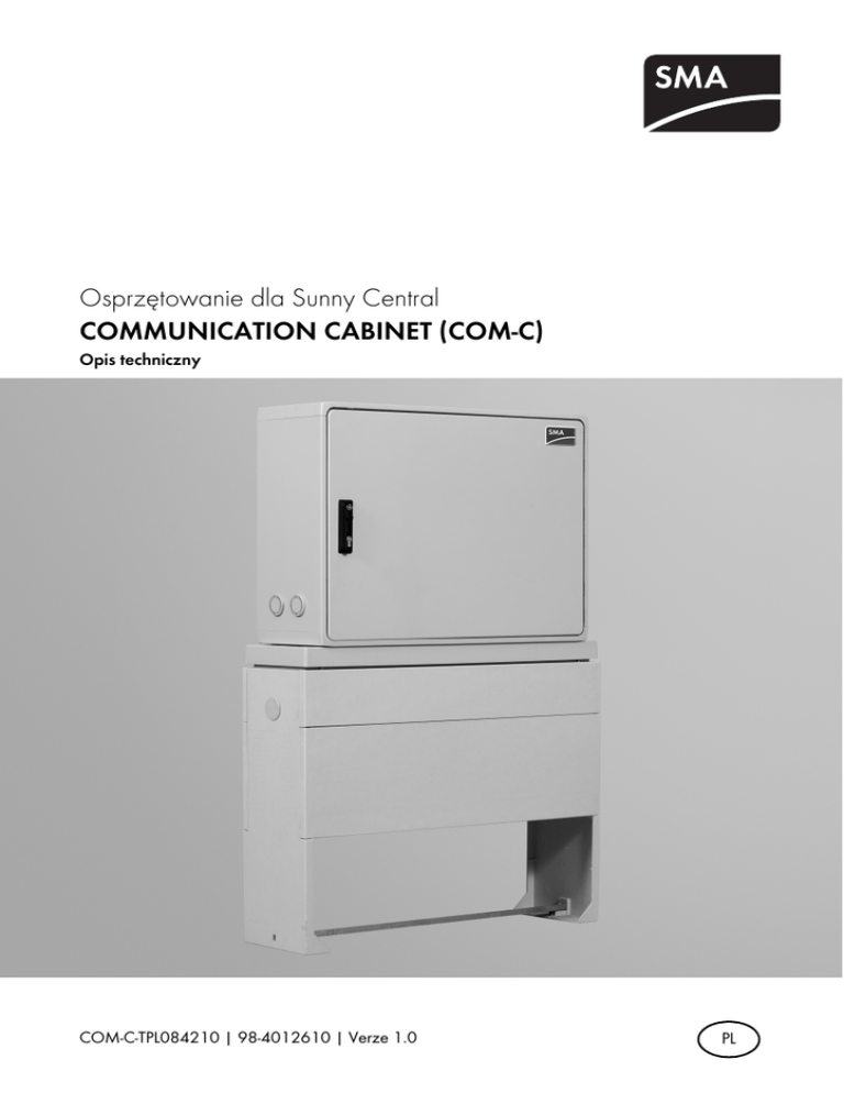 Osprzętowanie dla Sunny Central COMMUNICATION CABINET (COM-C) Opis techniczny COM-C-TPL084210 | 98-4012610 | Verze 1.0 PL SMA Solar Technology AG Obsah Spis treści 1 Informacje o produkcie . . . . . . . . . . . . . . . . . . . . . . . . . . . . 5 2 2.1 2.2 Dane techniczne . . . . . . . . . . . . . . . . . . . . . . . . . . . . . . . . . . 6 Wymiary . . . . . . . . . . . . . . . . . . . . . . . . . . . . . . . . . . . . . . . . . . . 8 Wnętrze urządzenia. . . . . . . . . . . . . . . . . . . . . . . . . . . . . . . . . 10 3 3.1 Montaż . . . . . . . . . . . . . . . . . . . . . . . . . . . . . . . . . . . . . . . . 12 Montaż Communication Cabinet (wersja do montażu w pomieszczeniach) . . . . . . . . . . . . . . . . 12 Montaż Communication Cabinet (wersja do montażu na wolnym powietrzu) . . . . . . . . . . . . . . . 13 3.2 4 Kontakt . . . . . . . . . . . . . . . . . . . . . . . . . . . . . . . . . . . . . . . . 14 Opis techniczny COM-C-TPL084210 3 Obsah 4 SMA Solar Technology AG COM-C-TPL084210 Opis techniczny SMA Solar Technology AG Informacje o produkcie 1 Informacje o produkcie Rozdzielacz komunikacyjny Communication Cabinet firmy SMA Solar Technology służy do łączenia ze sobą wszystkich komponentów komunikacyjnych wykorzystywanych w wielkowymiarowych instalacjach solarnych z przemiennikami częstotliwości Sunny Central. • Communication Cabinet umożliwia wykonanie technicznych połączeń komunikacyjnych między maks. 150 uczestnikami z wykorzystaniem standardu Ethernet. • Rozdzielacz może być ustawiany w pomieszczeniach lub na wolnym powietrzu, możliwy jest też montaż na podstawie lub montaż ścienny. • Wyposażenie podstawowe rozdzielacza obejmuje gniazda sieciowe z zestykiem ochronnym (służące np. do podłączania zasilaczy) oraz zasilacz 230 V/24 V. Wszelkiego rodzaju wyposażenie dodatkowe można zamówić w firmie SMA Solar Technology. • Communication Cabinet jest zasilany z sieci zewnętrznej. Centralna przetwornica częstotliwości Central może być podłączona za pomocą przewodów CAT, lub - w przypadku większych odległości - za pomocą światłowodów. Dane mogą być rejestrowane przez opcjonalne urządzenie Sunny WebBox. • Przesył danych do zdalnych urządzeń monitorujących odbywa się za pomocą opcjonalnych routerów - model do wyboru. Możliwy jest transfer bezprzewodowy przez sieć GSM/GPRS lub przez sieć telefoniczną. W przypadku przesyłu przez sieć GSM/GPRS w zakres dostawy wchodzi zewnętrzna antena GSM. Opis techniczny COM-C-TPL084210 5 Dane techniczne SMA Solar Technology AG 2 Dane techniczne COM-C Obudowa Możliwość montażu na wolnym powietrzu Odporność na promieniowanie UV Możliwość ustawienia na podstawie Montaż ścienny Tak Tak, tylko w wersji do montażu na wolnym powietrzu Tak, tylko w wersji do montażu na wolnym powietrzu (opcjonalnie) Tak (tylko w wersji do montażu na wolnym powietrzu) Poliester (wzmocniony włóknami szklanymi) Materiał (wersja do montażu na wolnym powietrzu) Materiał Blacha stalowa (wersja do montażu w pomieszczeniach) Kolor (wersja do montażu na wolnym powietrzu) RAL 7035 jasnoszary, barwiony w masie Kolor (wersja do montażu w pomieszczeniach) RAL 7035 - struktura Odporność na ogień samogasnący, niezawierający halogenów (wersja do montażu na wolnym powietrzu) Odporność na ogień niepalny (wersja do montażu w pomieszczeniach) Siłownik zamykający (klucz piórowy do szaf Przygotowany do montażu przez klienta rozdzielczych, dwustronny) Szyna kablowa Tak, tylko w przypadku montażu na podstawie Wymiary i waga Obudowa do montażu na wolnym powietrzu 1000 x 750 x 320 (szer. x wys. x gł. w mm) Obudowa do montażu w pomieszczeniach 760 x 760 x 300 (szer. x wys. x gł. w mm) Podstawa (szer. x wys. x gł. w mm) 1100 x 940 x 310 Waga ok. 40 kg (w zależności od wyposażenia) (wersja do montażu na wolnym powietrzu) Waga (wersja do montażu w pomieszczeniach) ok. 50 kg (w zależności od wyposażenia) Waga (podstawa) 25 kg Parametry wejściowe Napięcie znamionowe 230 V, 50/60 Hz Prąd znamionowy 1,0 A Maks. dobezpieczenie 16 A Przyłącze 3-żyłowy zacisk przyłączowy (0,08 - 2,5 mm2; Cage Clamp) 6 COM-C-TPL084210 Opis techniczny SMA Solar Technology AG Dane techniczne COM-C Wyposażenie standardowe Gniazda z zestykami ochronnymi Zasilacz Wyposażenie opcjonalne Router GSM/GPRS wraz z anteną zewnętrzną Router ISDN Router DSL Modem DSL Sunny WebBox Switch Ethernet z 8 portami Media konwerter (tryb multi lub single) RJ45 / światłowód Złącza (w zależności od wybranej opcji) Komunikacja Standardy Deklaracja zgodności WE Rodzaj ochrony i warunki otoczenia Ochrona zgodna z normą DIN EN 60529 Dopuszczalne temperatury otoczenia [T] Względna wilgotność powietrza bez kondensacji (pow. obieg.) Opis techniczny 5 sztuk 1 x 230 V AC / 24 V DC Maks. 2 sztuki Maks. 2 sztuki Maks. 1 sztuka Maks. 1 sztuka Maks. 3 sztuki Maks. 4 sztuki Maks. 4 sztuki RJ 45 / Ethernet lub światłowód Tak IP 54 –20 °C ... +50 °C 10 ... 90 % COM-C-TPL084210 7 Dane techniczne SMA Solar Technology AG 2.1 Wymiary Communication Cabinet (wersja do montażu ściennego w pomieszczeniach) 8 COM-C-TPL084210 Opis techniczny SMA Solar Technology AG Dane techniczne Communication Cabinet (wersja do montażu na wolnym powietrzu z podstawą) Opis techniczny COM-C-TPL084210 9 Dane techniczne SMA Solar Technology AG 2.2 Wnętrze urządzenia Communication Cabinet (wersja do montażu w pomieszczeniach) z pełnym wyposażeniem (Wyposażenie zależy od wersji wyposażenia) 10 COM-C-TPL084210 Opis techniczny SMA Solar Technology AG Dane techniczne Communication Cabinet (wersja do montażu na wolnym powietrzu) z pełnym wyposażeniem (Wyposażenie zależy od wersji wyposażenia) Opis techniczny COM-C-TPL084210 11 Montaż SMA Solar Technology AG 3 Montaż 3.1 Montaż Communication Cabinet (wersja do montażu w pomieszczeniach) 1. Zaznaczyć położenie otworów. 2. Wykonać otwory w oznaczonych miejscach. 3. Otwo
