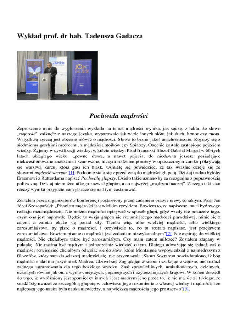 Wykład prof. dr hab. Tadeusza Gadacza Pochwała mądrości Zaproszenie mnie do wygłoszenia wykładu na temat mądrości wynika, jak sądzę, z faktu, że słowo „mądrość” zniknęło z naszego języka, wyparowało jak wiele innych słów, jak duch, honor czy cnota. Wstydliwą rzeczą jest obecnie mówić o mądrości. Słowo to brzmi jakoś anachronicznie. Kojarzy się z siedmioma greckimi mędrcami, z mądrością stoików czy Spinozy. Obecnie zostało zastąpione pojęciem wiedzy. Żyjemy w cywilizacji wiedzy, w kulcie wiedzy. Pisał francuski filozof Gabriel Marcel w 60-tych latach ubiegłego wieku: „pewne słowa, a nawet pojęcia, do niedawna jeszcze posiadające niekwestionowane znaczenie i szanowane, niczym rodzinne portrety w opuszczonym zamku pokrywają się warstwą kurzu, która gasi ich blask. Ośmielę się powiedzieć, że tak właśnie dzieje się ze słowami mądrość sacrum”[1]. Podobnie stało się z przeciwną do mądrości głupotą. Dzisiaj trudno byłoby Erazmowi z Rotterdamu napisać Pochwałę głupoty. Dzieło takie uznano by za niezgodne z poprawnością polityczną. Dzisiaj nie można nikogo nazwać głupim, a co najwyżej „mądrym inaczej”. Z czego taki stan rzeczy wynika przyjdzie nam jeszcze się nad tym zastanowić. Zostałem przez organizatorów konferencji postawiony przed zadaniem prawie niewykonalnym. Pisał Jan Józef Szczepański: „Pisanie o mądrości jest wielkim ryzykiem. Bowiem to, co napiszesz, musi być swego rodzaju metamądrością. Nie można mądrości opisywać w sposób głupi, gdyż wtedy nie pokażesz tego, czym ona jest naprawdę. Będzie to wizja głupca nie rozumiejącego mądrości prawdziwej, minie się z celem, a zamiar okaże się ponad siły. Trzeba więc albo wielkiej mądrości, albo wielkiego zarozumialstwa, by pisać o mądrości, i oczywiście to, co tu zostało napisane, jest przejawem zarozumialstwa. Bowiem pisanie o mądrości jest zadaniem niewykonalnym”[2]. Nie aspiruję do wielkiej mądrości. Nie chciałbym także być zarozumiałym. Czy mam zatem milczeć? Zostałem złapany w pułapkę. Nie można być mądrym i jednocześnie wiedzieć o tym. Dlatego odważając się jednak coś o mądrości powiedzieć chciałbym odwołać się do słów, które Montaigne wypowiedział o najmędrszym z filozofów, który sam do własnej mądrości się nie przyznawał: „Skoro Sokratesa powiadomiono, iż bóg mądrości nadał mu przydomek Mędrca, zdziwił się. Zaglądając w siebie i szukając wszędzie, nie znalazł żadnego ugruntowania dla tego boskiego wyroku. Znał sprawiedliwych, umiarkowanych, dzielnych, uczonych równie jak on, a wymowniejszych, piękniejszych i użyteczniejszych krajowi. W końcu doszedł do tego, iż wyróżniony jest spomiędzy innych i jest mądrym jeno przez to, iż nie ma się za takiego; że snadź bóg uważał za szczególną głupotę w człowieku jego rozumienie o własnej wiedzy i mądrości; i że najlepszą jego nauką była nauka niewiedzy, a największą mądrością jego prostactwo”[3]. Nie ma jednej i jednoznacznej definicji mądrości. Według Sokratesa polega ona na rozeznaniu co do dobra i zła. Dla Luciusza Anneusza Seneki jest doskonałym lub do najwyższego stanu doprowadzonym rozumem. Cyceron określił ją jako znajomość spraw boskich i ludzkich, a św. Augustyn jako właściwą miarę duszy. Dla Kartezjusza jest umiejętnością trafnego posługiwania się rozumem i czynienia tego, co najlepsze. Gottfried Wilhelm Lebniz określił ją jako wiedzę, która uczy osiągać szczęście. Dla Dawida Hume’a jest ona rzadko osiągalnym szczytem wiedzy, a dla Giambattisty Vico umiejętnością używania rzeczy zgodnie z naturą. Immanuel Kant określił ją jako zręczność w wyborze środków do własnego najwyższego dobra, a Max Scheler jako umiejętność bezpośredniego poznawania wartości. Przyczyny trudności z określeniem mądrości ukazał Platon w dziele „Uczta” w związku z definicją pojęcia filozofii. Filozofia według Platona jest umiłowaniem mądrości. Umiłowanie (filein), jak wszelkie formy miłości, pochodzą według Platona od greckiego boga Erosa, a ten został poczęty na uczcie Afrodyty z ojca Dostatku i matki Biedy. To jej dwojakie pochodzenie (Dostatek i Bieda) sytuuje filozofa jako miłośnika mądrości między głupcami i bogami. „A jest pośrodku pomiędzy mądrością i głupotą. Bo to tak jest: Z bogów żaden nie filozofuje ani nie pragnie mądrości – on ją ma; ani żadna istota mądra nie filozofuje. Głupi też nie filozofują i żaden z nich nie chce być mądry. Bo to właśnie jest całe nieszczęście w głupocie, że człowiek nie będąc ani pięknym i dobrym, ani mądrym, przecie uważa, że mu to wystarczy. Bo jeśli człowiek uważa, że mu czegoś nie brak, czyż będzie pragnął tego, na czym mu, jego zdaniem, nie zbywa?- Moja Diotymo – powiadam – a któż się w takim razie zajmuje filozofią, jeżeli mądry nie, a głupi także nie? – To – powiada nawet i dziecko zrozumie, że ci, którzy są czymś pośrednim pomiędzy jednymi i drugimi. Do tych i Eros należy. Bo mądrość to rzecz niezaprzeczalnie piękna, a Eros to miłość tego, co piękne; przeto musi Eros być miłośnikiem mądrości, filozofem, a filozofem będąc, pośrodku jest między mądrością i głupotą”. (Uczta, s. 98) Ten kto dąży do mądrości, wobec bogów jest biedny (pochodzenie od matki), gdyż nie wie wszystkiego i nie posiada boskiej doskonałości. Wobec głupców natomiast jest bogaty (pochodzenie od ojca), gdyż wie iż nie wie, natomiast głupcom wydaje się, że wiedzą. „A czyż to nie jest głupota, i to ta najpaskudniejsza: myśleć, że się wie to, czego człowiek nie wie?”[4] Mądrość sytuuje się zatem zawsze pośrodku między głupcami i bogami. Możemy zatem mówić jedynie o dążeniu do mądrości a nie jej posiadaniu. Kto by stwierdził, że posiada mądrość musiałby być bogiem, 
