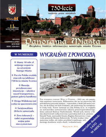www.bip.tczew.pl www. tczew.pl NR 6/233 NR 1/228 CZERWIEC/LIPIEC Styczeń 2010 r. 2010 ROK ISSN: 1234-5911 ISSN: 1234-5911 W NUMERZE WYGRALIŚMY Z POWODZIĄ Mamy 10 mln zł unijnego wsparcia na ożywienie Starego Miasta Poczta Polska wydała znaczek na jubileusz 750-lecia miasta Tczewa te M IE ŚC IE d TO od a LA W Więcej na str. 10-11 ln y Zero tolerancji – radni wypowiadają wojnę psim nieczystościom ja Świętowaliśmy 20-lecie samorządu TAK WYSOKIEGO POZIOMU WISŁY W TCZEWIE – 1041 cm, nie pamiętają najstarsi tczewianie. Kilkanaście dni po tej pierwszej fali powodziowej przyszła kolejna – wprawdzie o około pół metra niższa, ale do końca nie było wiadomo, jak zachowają się nasiąknięte wodą wały. Tczew zasłynął na całą Polskę m.in. ze względu na nowatorskie zastosowanie rękawa przeciwpowodziowego, który ochronił Bulwar Nadwiślański. Wśród tych, którzy z bliska obserwowali walkę tczewian z powodzią byli m.in. premier Donald Tusk, marszałek Senatu Bogdan Borusewicz i wojewoda pomorski Roman Zaborowski. To była trudna i dramatyczna walka, ale także przykład wspólnego, solidarnego działania wielu służb i wolontariuszy. sp ec Droga Widokowa już czeka na spacerowiczów k: Ruszają przydworcowe inwestycje – wkrótce węzeł transportowy, potem galeria handlowa 1 www. tczew.pl www.bip.tczew.pl Dukaty na 750-lecie Trzy w jednym XLVII SESJA Wyemitowany został już ostatni z trzech dukatów lokalnych z okazji 750-lecia miasta Tczewa. Emisja dukata 4 sambory przewidziana jest do 31 sierpnia (pod warunkiem, że wcześniej nakład nie zostanie wyczerpany). Ci, którym nie udało się nabyć dwóch poprzednich okolicznościowych monet – 4 dersławów i 4 trsowów, mogą to jeszcze nadrobić. Na zlecenie Biura Promocji Urzędu Miejskiego wydane zostały zestawy wszystkich trzech monet – w eleganckim opakowaniu, z krótką informacja o Tczewie i tczewskich dukatach. Zestaw można nabyć w kasie Urzędu Miejskiego. Jego cena ( w tym koszt trzech dukatów) to 16,55 zł. Proponowany porządek obrad XLVII sesji Rady Miejskiej w Tczewie na dzień 24 czerwca 2010 r. o godz. 10.00 w sali konferencyjnej im. F. Fabicha w Urzędzie Miejskim w Tczewie I. Część pierwsza: 1. 2. 3. 4. Otwarcie sesji i powitanie gości. Sprawdzenie obecności radnych. Przedstawienie proponowanego porządku obrad sesji. Przyjęcie protokołu z sesji Rady Miejskiej w Tczewie z 28 maja 2010. 5. Informacja z działalności Prezydenta Miasta Tczewa. 6. Informacja z interpelacji zgłoszonych przez radnych w okresie od 28 maja do 23 czerwca 2010 r. Z Ministerstwa Sportu i Turystyki Podziękowania dla Tczewa ILU NAS JEST? 1 czerwca 2010 r. w Tczewie zameldowanych było 60 180 osób, w tym 59 085 na pobyt stały i 1095 na pobyt czasowy. Od początku maja ubyło 52 mieszkańców miasta. Min. Katarzyna Sobierajska Katarzyna Sobierajska, podsekretarz stanu w Ministerstwie Sportu i Turystyki przesłała na ręce Zenona Odyi, prezydenta Tczewa podziękowania za zorganizowanie w naszym mieście Kongresu Europejskiej Federacji Cyklistów oraz konferencji pt. „Ruch rowerowy w miastach położonych nad wielkimi rzekami jako ważny czynnik rozwoju regionalnego i aktywnej ekoturystyki”. Kongres odbywał się w Tczewie w dniach 13-16 maja br. W piśmie czytamy m.in.: To wielki zaszczyt dla Polski, że właśnie Tczew, obchodzący w tym roku swoje 750-lecie, został wybrany miejscem tego spotkania. Jest to ogromna szansa promocji miasta, regionu i całego kraju. Słowa uznania kieruję do władz miasta Tczewa oraz wszystkich osób działających aktywnie na rzecz rozwoju i promocji turystyki rowerowej. Udowodniliście Państwo, że ciężką pracą, pasją oraz konsekwencją w działaniu można z powodzeniem rozwijać nowe produkty turystyczne oraz propagować rowery jako środek transportu. Tczew jest miastem, które aktywnie rozwija ten rodzaj turystyki i może poszczycić się ogromnym sukcesem w tym zakresie. Ministerstwo Sportu i Turystyki docenia Państwa pracę i wkład na rzecz rozwoju infrastruktury rowerowej, znakowania oraz promocji. (…) Tczew m.in. wspiera działania na rzecz realizacji jednego z istotnych postulatów dotyczących rozwoju turystyki rowerowej, zawartego w dokumencie „Kierunki rozwoju turystyki w Polsce do 2015 r.”. Z całego serca gratuluję osiągnięć, pasji i zapału oraz konsekwencji w dążeniu do celu. Życzę kolejnych sukcesów w dalszej pracy, pozostając z nadzieją, że miasto zachowało swoje walory kulturowe i turystyczne w trudnej sytuacji powodziowej naszego kraju. II . Część druga: 7. Sprawozdanie z przebiegu Akcji Zima 2009/2010. 8. Informacja o stanie czystości i porządku na terenie miasta Tczewa. 9. Raport z realizacji Strategii Rozwiązywania Problemów Społecznych w mieście Tczewie w 2009 r. 10. Informacja z postępu prac nad studium uwarunkowań i kierunków zagospodarowania przestrzennego miasta. 11. Podjęcie uchwał w sprawie: 11.1 zmian w budżecie miasta Tczewa na 2010 r., 11.2 trybu prac nad projektem uchwały budżetowej, 11.3 określenia zakresu i formy informacji o przebiegu wykonania budżetu miasta Tczewa, informacji o kształtowaniu się wieloletniej prognozy finansowej oraz informacji o przebiegu wykonania planów finansowych samorządowych instytucji kultury za I półrocze roku budżetowego, 11.4 wyrażenia zgody na zaciągnięcie zobowiązań finansowych na świadczenie usług w zakresie utrzymania miejskich terenów zieleni w latach 2011-2013, 11.5 wyrażenia zgody na zaciągnięcie zobowiązań finansowych na świadczenie usług w zakresie prowadzenia schroniska dla bezdomnych zwierząt w Tczewie w latach 2011-2013, 11.6 określenia szczegółowych zasad, sposobu i trybu umarzania i udzielania ulg w spłatach należności pieniężnych mających charakter cywilnoprawny przypadających Gminie Miejskiej Tczew, 11.7 zmieniająca uchwałę w sprawie przyjęcia programu wspierania edukacji uzdolnionych dzieci i mł