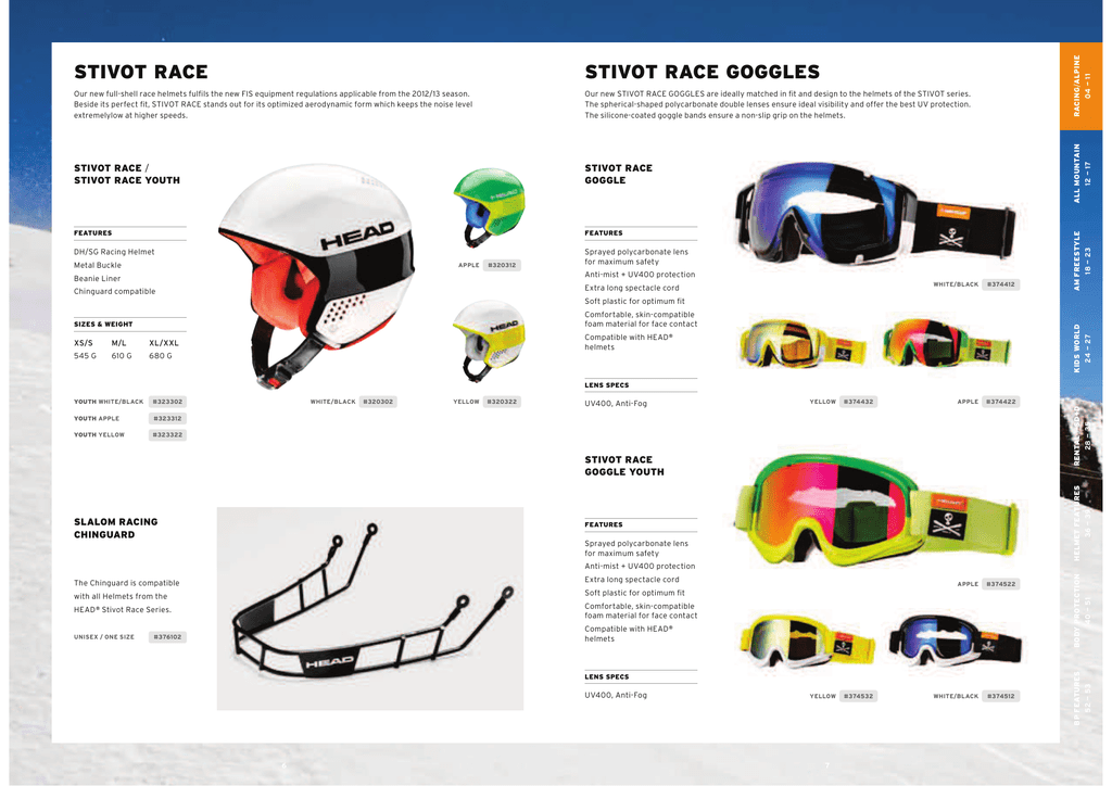 FEATURES FEATURES Metal Buckle APPLE #320312 Sprayed polycarbonate lens for maximum safety Beanie Liner Anti-mist + UV400 protection Chinguard compatible Extra long spectacle cord WHITE/BLACK #374412 APPLE #374422 APPLE #374522 WHITE/BLACK #374512 AM FREESTYLE DH/SG Racing Helmet 04 — 11 STIVOT RACE GOGGLE RACING/ALPINE STIVOT RACE / STIVOT RACE YOUTH 12 — 17 Our new STIVOT RACE GOGGLES are ideally matched in fit and design to the helmets of the STIVOT series. The spherical-shaped polycarbonate double lenses ensure ideal visibility and offer the best UV protection. The silicone-coated goggle bands ensure a non-slip grip on the helmets. ALL MOUNTAIN STIVOT RACE GOGGLES Our new full-shell race helmets fulfils the new FIS equipment regulations applicable from the 2012/13 season. Beside its perfect fit, STIVOT RACE stands out for its optimized aerodynamic form which keeps the noise level extremelylow at higher speeds. 18 — 23 STIVOT RACE XS/S M/L XL/XXL 545 G 610 G 680 G KIDS WORLD Comfortable, skin-compatible foam material for face contact SIZES & WEIGHT Compatible with HEAD ® helmets 24 — 27 Soft plastic for optimum fit #323312 YOUTH YELLOW #323322 #320302 YELLOW #320322 UV400, Anti-Fog YELLOW #374432 RENTAL / SD+D YOUTH APPLE WHITE/BLACK SLALOM RACING CHINGUARD HELMET FEATURES STIVOT RACE GOGGLE YOUTH FEATURES Sprayed polycarbonate lens for maximum safety 36 — 39 #323302 28 — 35 LENS SPECS YOUTH WHITE/BLACK HEAD ® Stivot Race Series. Comfortable, skin-compatible foam material for face contact UNISEX / ONE SIZE Compatible with HEAD ® helmets #376102 LENS SPECS UV400, Anti-Fog 6 YELLOW 7 #374532 40 — 51 Soft plastic for optimum fit BODY PROTECTION Extra long spectacle cord with all Helmets from the 52 — 53 The Chinguard is compatible BP FEATURES Anti-mist + UV400 protection contents Welcome Page 4 Page 5 – 8 – 13 Bindings Page 10 Skis Bags Page 14 – 17 Page 18 Poles Page 19 Boots 20 Ski Straps Page 20 - 22 Protection Page Page 23 Goggles Page 24 - 27 Apparel SKIS | GIANT Slalom GIANT SLALOM 1 Worldc up Rebe ls cts «normal» is brochure contains produ Th 3. 01 / 2 12 20 g cin Ra ges Welcome to HEAD uipment on the following pa eq e Th i. sk r ve ne , ch tou r skiers will never see, neve . You are among test athletes that ever lived fas the of me so by d an is developed for t beat d commitment – and migh an w -ho ow kn ir the m fro the few to directly profit en your time has come. them to the finish line wh .GS RD features: lengths: dimensions: • KERS 19 1 • Intelligence Te 105 / 69 / 90 ch • Worldcup sand nology wich 188 construction 104 / 69 / 89 • RD racing top 183 sheet 104 / 68 / 89 • Race structur ed 178 speed UHM C high 10 2 / 68 / 87 base • Rebel Cambe r 175 •FIS approved 104 / 68 / 89 for Continental Cu p and Masters •HEAD Race Pl ate RDX radius: 27.8 27.8 art n˚: 310002 25.4 25.4 23.0 giant slalom men Special feat ure: • FIS approved for World Cu p and European Cu p only How it works. flex at Skis experience maximum ment, mo this At n. the end of a tur rgy ene s ase rele hip an active microc the of rs fibe tric lec into the piezoe at ling vel tra y icit tail – with electr in s pen hap this t, the speed of ligh of tail the – ond sec fractions of a ediately the ski then stiffens up, imm ximum ma for d oun increasing reb turn. out the of end acceleration at the length: dimensions: 195 98 / 65 / 81 radius: 35.0 art n˚: 310092 giant slalom WOmen Special feat ure: • FIS approved for World Cu p and European Cu p only 1 Information in this brochure length: 188 dimensions: 102 / 65 / 82 radius: 30.0 art n˚: 310102 may change w ithout notice. On fire. 4 ration t provides additional accele little like an afterburner tha t one. nex the for KERS Technology works a ed spe of a turn – capturing end the in ski the of tail by stiffening the system. , fully automatic, integrated HEAD KERS is an electronic 5 SKIS | slalom SKIS | downhill / super g downhill 3 Worldc up .DH RD features: • KERS • Intelligence Te • Worldcup sa chnology ndwich constructio n • RD racing to p • Race struct sheet ured high speed UHM C base • Rebel Cam ber • FIS approv ed • Race Plate lengths: 216 dimension s: radius: 96 / 70 / 84 21 1 art n˚: 48.5 96 / 70 / 84 319902 46.8 3199 1 2 super g 4 Worldc up .SG RD features: • KERS • Intelligence Te • Worldcup sa chnology ndwich constructio n • RD racing to p • Race struct sheet ured high speed UHM C base • Rebel Cam ber • FIS approv ed • Race Plate slalom 2 World features cup Re bels : lengths: • KERS 165 • Intelligence Te • Worldcup sa chnology 16 0 ndwich constructio n 155 • RD racing top • Race struct sheet ur speed UHM ed high C base • Rebel Cam be • FIS approv r ed • HEAD Race Plate RDX dimension s: 117 / 66 / 100 116 / 66 / 99 115 / 66 / 97 .SL RD radius: 13.0 12.5 art n˚: lengths: 210 203 200 dimension s: radius: 100 / 68 / 84 art n˚: 39.4 99 / 68 / 83 319922 37.0 99 / 68 / 87 319932 34.6 319942 310032 super g juni 12.5 5 or Worldc features: • KERS • Intelligence Te • Worldcup sa chnology ndwich constructio n • RD racing to p • Race struct sheet ured high speed UHM C base • Rebel Cam ber • FIS approv ed • Raceplate Ju nior 2 up .SG RD JRP RDX lengths: 192 182 175 dimension s: 98 / 66 / 85 96 / 66 / 85 93 / 65 / 82 radius: 31 .8 28.0 27.0 art n˚: 319952 319962 319972 3 4 / 5 6 7 SKIS | JUNIOR RACING Giant slalom junior 6 X WC GS Team SW JRP RD features: lengths: dimensions: radius: art n˚: • Intelligence Technology • Worldcup sandwich construction • RD racing top sheet • Race structured UHM C base • Raceplate Junior 172 100 / 65 / 87 21.0 314002 165 101 / 65 / 88 18.5 158 99 / 64 / 86 17.2 15 1 97 / 64 / 84 17.2 144 99 / 64 / 86 14.2 137 96 / 64 / 83 14.2 130 92 / 63 / 79 14.2 123 90 / 63 / 77 14.2 slalom junior 7 6 7 8 X WC SL Team SW JRP RD features: lengths: dimensions: radius: art n˚: 156 1 12 / 64 / 97 12.6 314022 • Intelligence Technol