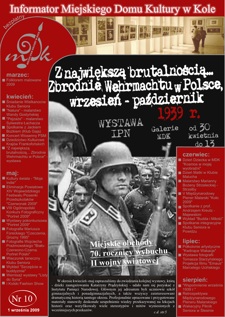 marzec: Folklorem malowane 2009 kwiecieñ: Œniadanie Wielkanocne Klubu Seniora "Natura" - malarstwo Wandy Gostyñskiej "Pejza¿e" - malarstwo Sylwestra £achacza Spotkanie z Jackiem Bo¿kiem (Klub Gaja) Koncert Wiosenny PSM Dziedzictwo Kulturowe Krajów Frankofoñskich "Z najwiêksz¹ brutalnoœci¹... Zbrodnie Wehrmachtu w Polsce" wystawa czerwiec: Dzieñ Dziecka w MDK "Kosmos w mojej wyobraŸni" Dzieñ Matki w Klubie Malucha Malarstwo Marianny Bo¿eny Strzeleckiej Strzelby V Miêdzynarodowy Plener Malarski "Ko³o 2009" Spotkanie z prof. Andrzejem Kreutz Majewskim Wyk³ad "Budda i Mi³oœæ” Spotkanie integracyjne Klubu Seniora w Powidzu maj: Kultury œwiata - "Moje Indie" Eliminacje Powiatowe XIV Wojewódzkiego Festiwalu Piosenki Przedszkolaków "Czerwonak 2009" VIII Ogólnopolski Konkurs Fotograficzny "Portret 2009" Wystawy pokonkursowa "Portret 2009" Fotografie Mariusza Foreckiego "Czeczenia, Grozny 1995" Fotografie Wojciecha Pra¿mowskiego "Bia³oCzerwono-Czarna. Portret Polski" Wieczorek taneczny Klubu Seniora Wyk³ad "Szczêœcie w buddyzmie" Wernisa¿ wystawy "Listy do Syna" I Kolski Fashion Show Miejskie obchody 70. rocznicy wybuchu II wojny œwiatowej W okresie kwiecieñ -maj zapraszaliœmy do zwiedzania kolejnej wystawy, któr¹ - dzieki zaanga¿owaniu Katarzyny Pr¹dzyñskiej - uda³o nam siê pozyskaæ z Instytutu Pamiêci Narodowej. G³ównym jej adresatem byli uczniowie szkó³ gimnazjalnych i ponadgimnazjalnych, a tak¿e wszyscy zainteresowani dramatyczn¹ histori¹ tamtego okresu. Profesjonalnie opracowane i przygotowane materia³y stanowi³y doskona³e uzupe³nienie wiedzy przekazywanej na lekcjach historii oraz weryfikowa³y wiele stereotypów i mitów wyniesionych z wczeœniejszych przekazów. lipiec: Pó³kolonie artystyczne "Kwitn¹ce Wakacje" Wystawa fotografii Tomasza Starzyñskiego Projekcja filmu "Emaus" Marcelego Uciñskiego sierpieñ: "Wspomnienie wrzeœnia 1939 r." Retrospektywa Miêdzynarodowego Pleneru Malarskiego Wakacyjny Piknik Seniora w Œlesinie Spotkanie z profesorem Andrzejem Kreutz Majewskim Spotkanie z prof. Andrzejem Kreutz Majewskim, œwiatowej s³awy scenografem, malarzem i pedagogiem, Goœciem Specjalnym V Miêdzynarodowego Pleneru Malarskiego "Ko³o 2009",odby³o siê w Sali Obrad Ratusza Miejskiego 23 czerwca br. Andrzej Kreutz Majewski urodzi³ siê 19 wrzeœnia 1936 r. w Brdowie; jest laureatem wielu presti¿owych nagród i wyró¿nieñ. Absolwent krakowskiej Akademii Sztuk Piêknych (1959) oraz Akademii Sztuk Piêknych w Rzymie (1962); twórca ok. 160 scenografii w teatrach operowych i dramatycznych. Debiutowa³ w Teatrze im. Juliusza S³owackiego w Krakowie (1959). W 1966 r. otrzyma³ nominacjê na stanowisko naczelnego scenografa Teatru Wielkiego w Warszawie, któr¹ pe³ni³ do 2005 r. W tym czasie zaczê³a siê jego wielka miêdzynarodowa kariera i trwaj¹ca do dziœ wspó³praca z czo³owymi teatrami operowymi œwiata. Rok 1968 jest uznawany za datê jego œwiatowego debiutu. By³ autorem scenografii w renomowanych teatrach œwiata, m.in. w: Amsterdamie, Ankarze, Atenach, Barcelonie, Berlinie, Buenos Aires, Detroit, Dortmundzie, Essen, Genewie, Hamburgu, Kolonii, Lizbonie, Londynie, Los Angeles, Madrycie, Mediolanie, Mexico City, Monachium, Moskwie, Nowym Jorku, Oslo, Pary¿u, Pradze, San Francisco, Tel Awiwie, Turynie, Vancouverze, Wiedniu i Zurychu. Wœród jego teatralnych wspó³twórców znaleŸli siê dyrygenci: Carl Böhm, Herbert von Karajan, Zubin Mehta, Nello Santi i Georg Solti; re¿yserzy: August Everding, Giancarlo del Monaco i Jean Claude Riber; choreografowie: Peter van Dyck, Jurij Grigorowicz, Serge Lifar, John Neumeier i wielu innych twórców œwiatowej s³awy. Jest te¿ re¿yserem dwóch oper: "Pasji" Krzysztofa Pendereckiego i "Króla Rogera" Karola Szymanowskiego oraz projektantem bardzo wysoko ocenionego wnêtrza Pawilonu Polskiego na EXPO 2000 w Hanowerze. Wa¿nym nurtem jego twórczoœci jest malarstwo sztalugowe, za które otrzyma³ wiele nagród w kraju i za granic¹. Pierwsza indywidualna wystawa malarska artysty odby³a siê w 1957 roku w teatrze Tadeusza Kantora Cricot-2 w Krakowie. Od tej pory prace malarskie i scenograficzne Andrzeja KreützaMajewskiego by³y wielokrotnie prezentowane w kraju i zagranic¹, m.in. dwukrotnie we Wright Hepburn Gallery w Londynie i Galerii Foyer w Kolonii oraz w Palacio de Bellas Artes w Mexico City. Scenografie eksponowano tak¿e m.in. w Bibliotece Arsena³u w Pary¿u, a malarstwo m.in. w Galerii Muda-2 w Hamburgu, na Biennale w Wenecji oraz w Galerii Varszinház w Budapeszcie. W 1986 roku prace malarskie, scenograficzne, kostiumy i rekwizyty teatralne pokazane zosta³y na Praskim Quadriennale Scenografii. W 1984 roku odby³a siê wielka monograficzna wystawa z 280 Klub gier bitewnych "GONDOLIN” Dzia³aj¹cy od kilkunastu miesiêcy ach. W klubie poza gr¹; która jest g³ówn¹ klub zaprasza wszystkich zainteresowanych do czêœci¹ spotkañ, malujemy, sklejamy, udzia³u w cotygodniowych spotkaniach: projektujemy oraz dyskutujemy na tematy "W naszym klubie mo¿esz spróbowaæ siê w powy¿szych systemów. Nasza rozrywka dzia³a wielu grach znanych z filmów lub ksi¹¿ek, m.in. szczególnie na wyobraŸniê, pobudza j¹ i Warhammer Fantasy Battle, Warhammer pozwala jej dzia³aæ; jest tak¿e propozycj¹ dla 40000, Lord Of The Rings oraz w wielu RPG- osób kreatywnych, fanów systemów lub po najwybitniejszymi pracami malarskimi i scenograficznymi w Galerii CBWA "Zachêta" w Warszawie. W 1990 roku w Centrum Scenografii Polskiej Muzeum Œl¹skiego otwarto Galeriê Autorsk¹ Andrzeja Majewskiego. W tym samym roku w Galerie der Deutschen Oper am Rhein w Düsseldorfie zaprezentowano wystawê scenografii Majewskiego do realizacji Augusta Everdinga. W 2003 roku w Teatrze Wielkim przygotowano wystawê malarstwa i scenografii zatytu³owan¹ FLASHBACK. Jest laureatem wielu presti¿owych nagród i wyró¿nieñ: m.in. II Nagrody na Biennale Sztuki w Pary¿u (1961), Nagrody Pañstw
