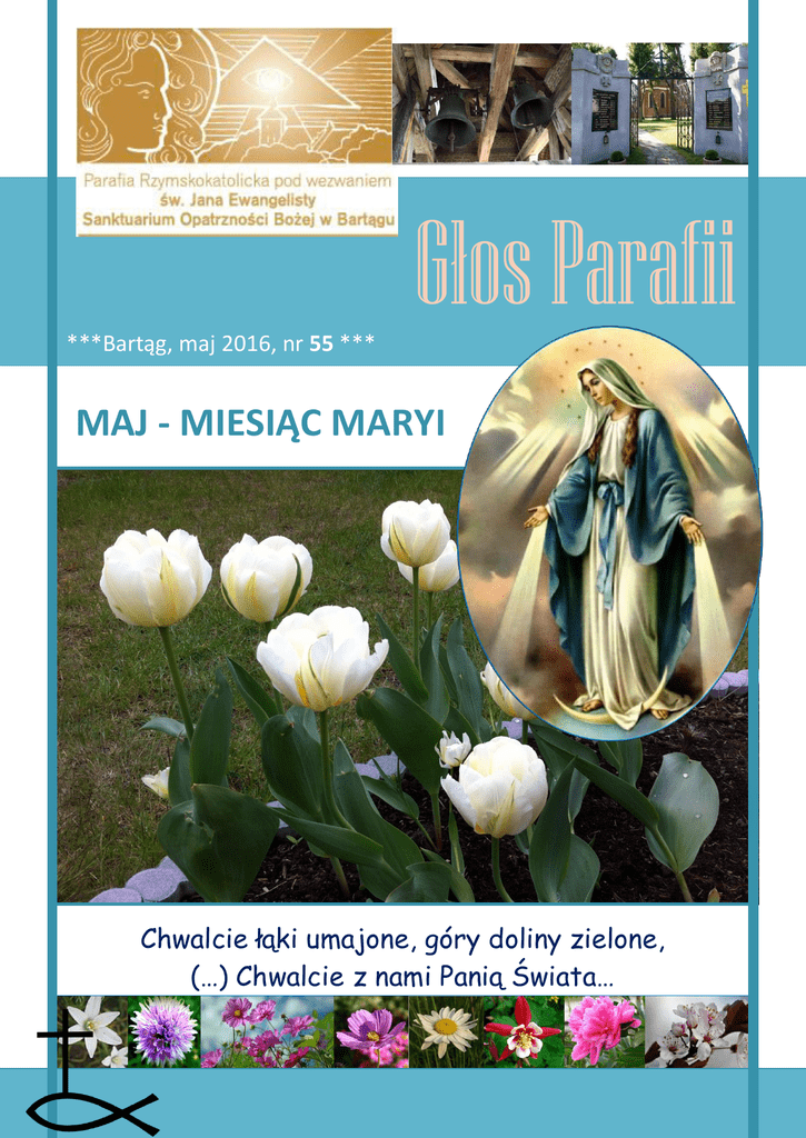 Głos Parafii ***Bartąg, maj 2016, nr 55 *** MAJ - MIESIĄC MARYI Chwalcie łąki umajone, góry doliny zielone, (…) Chwalcie z nami Panią Świata… Głos Parafii Bartąg, maj 2016, nr 55 NA STRONACH (List Pasterski Episkopatu Polski na JUBILEUSZ 1050-LECIA CHRZTU POLSKI). Co rzeczywiście zmieniło się wówczas w życiu mieszkańców ziem polskich? – o tym w dzisiejszym artykule. ŚWIĘTY WSPOMINANY W MAJU Św. Iwo Helory z Bretanii – właśc. Yves Hélory[a] (ur. 17 października 1253 na dworze Kermartin w pobliżu Tréguier, zm. 19 maja 1303 w Louannec w Bretanii) − francuski prezbiter, tercjarz franciszkański, święty Kościoła katolickiego. Przez całe dorosłe życie otaczał opieką ludzi ubogich, dlatego też nadano mu miano "adwokata biedaków". Żył bardzo skromnie służąc innym ludziom. W swoim domu urządził szpital, łaźnię, sierociniec i przytułek dla najuboższych. 3 14 DZIEŃ FLAGI RZECZYPOSPOLITEJ POLSKIEJ 2 maja obchodziliśmy Dzień Flagi Rzeczypospolitej Polskiej. Skąd się wzięły w ogóle barwy polskiej flagi? i… co powinniśmy wiedzieć o polskiej fladze? Na te i inne pytania znajdziemy odpowiedź na stronie dziewiętnastej. 19 UŚMIECHNIJ SIĘ GŁOSIK ŻYWEGO RÓŻAŃCA Kilka żartów dla wywołania uśmiechu na twarzy, miedzy innymi, o niewyjaśnionej tajemnicy tego świata. A może ktoś z was zna odpowiedź na pytanie - w jaki sposób 6 czekoladek może zmienić się u kobiety? w 6 kilogramów Rozpoczął się maj, miesiąc tak bardzo Maryjny. Jest to czas, w którym gromadzimy się przy przydrożnych krzyżach i kapliczkach, by zawierzać się w ręce Maryi odmawiając wspólnie Litanię Loretańską i śpiewając pieśni ku Jej czci. W dzisiejszym Głosiku Żywego Różańca przede wszystkim o odmawianiu różańca. Z „Historii różańca” możemy zrozumieć dlaczego jednorazowo odmawia się dziesięć razy tę samą modlitwę? nadwagi 6 NASZA KUCHNNIA W dzisiejszej „Naszej kuchni” znajdziemy przepisy przygotowane przez jednego z naszych parafian. Ciekawe, czy to co mężczyzna poleca na ten miesiąc będzie nam smakowało? 21 DZIECKO Z ALKOHOLOWYM ZESPOŁEM PŁODOWYM 10 CHRZEST POLSKI W Biblii czytamy, jak Anioł Pana ukazał się matce Samsona i powiedział: ,,Otoś teraz niepłodna i nie rodziłaś, ale poczniesz i porodzisz syna. Lecz odtąd strzeż się: nie pij wina ani sycery i nie jedz nic nieczystego’’ (Sdz 13, 3-4 ). Autorka wyjaśnia nam, co to jest Alkoholowy Zespół Płodowy? Jakie są jego objawy? Warto sobie o tym przypomnieć nie tylko z okazji Dnia Matki, ale i Dnia Dziecka. "Chrystus – jako Początek i Koniec całych ludzkich dziejów – sprawił, że 1050 lat temu na polskiej ziemi został postawiony krzyż, przejmujący znak jego zwycięstwa nad grzechem i śmiercią (...). Myśląc o konsekwencjach chrztu Mieszka, możemy mówić o „narodzie ochrzczonych”, o „chrzcie narodu”, a więc również o Chrzcie Polski (...)" 24 2 Głos Parafii Bartąg, maj 2016, nr 55 wspominany w 19 maja – św. Iwo Helory z Bretanii (1250 – 1303) Znany też jako Iwo z Kermartin, Iwo z Tréguier. Urodził się 17 października 1253 roku w Kermartin w pobliżu Tréguier. Po ukończeniu 14 roku życia studiował w Paryżu na wydziale sztuk wyzwolonych, później na wydziale prawa kanonicznego i teologii, a w Orleanie na wydziale prawa cywilnego. Kiedy jako niemal trzydziestoletni, świetnie wykształcony prawnik powrócił do rodzinnej Bretanii, archidiakon Rennes natychmiast powołał go na stanowisko oficjała, czyli diecezjalnego sędziego duchownego i powierzył mu wszystkie sprawy sporne diecezji. Iwo od samego początku zyskał sobie opinię bezstronnego, nieprzekupnego i sprawiedliwego sędziego, który – o dziwo – bogatych podsądnych traktował na równi z ubogimi. Potrafił w niezrównany sposób połączyć sprawiedliwość ziemską z zasadami chrześcijańskiej miłości bliźniego. Zawsze czynił starania, by pogodzić zwaśnione strony i uniknąć procesu, a jeśli już musiało do niego dojść, biednym opłacał koszty postępowania sądowego, skazanych odwiedzał w więzieniach i wspomagał ich rodziny, a szczególną troską otaczał najbardziej bezradnych, tj. wdowy i sieroty. Po czterech latach Iwo objął urząd oficjała w Tréguier i wyświęcony został na kapłana. Biskup powierzył mu niewielką parafię Trédrez, a po roku 1293 nieco większą - Louannec. Iwo od razu zjednał sobie parafian, dając przykład ubóstwa i modlitwy. W czasach, kiedy kapłani obowiązani byli odprawiać Mszę św. tylko w niedziele i święta, Iwo czynił to codziennie, niezależnie od tego, gdzie się znajdował. Często, chcąc pogodzić zwaśnionych, zanim zajął się sprawą jako sędzia, odprawiał w ich intencji Mszę św. - po niej serca skłóconych w jakiś cudowny sposób ulegały przemianie i jednali się bez rozprawy. Iwo prowadził też częstą w czasach Średniowiecza działalność wędrownego kaznodziei oznaczał się taką gorliwością w głoszeniu Słowa, że niejednokrotnie w ciągu jednego dnia głosił je w kilku odległych od siebie o wiele kilometrów kościołach i to zarówno w języku bretońskim, francuskim, jak i łacińskim. Jeszcze podczas pobytu w Rennes rozpoczął się trwający przez długich dziesięć lat czas wewnętrznej walki Iwona, który zaowocował buntem miłości przeciw nieładowi tego świata, dosłownym potraktowaniem Ewangelii, życiem Błogosławieństwami, a zwłaszcza pierwszym ubóstwem w duchu. Stopniowo wzrastało w nim coraz większe umiłowanie ascezy. Jeszcze w czasach studenckich Iwo zaczął sypiać na podłodze, na cienkiej warstwie słomy z kamieniem lub księgą praw pod głową oraz odmawiać sobie mięsa i wina, by przekazać je ubogim. Kolejnym krokiem był post o chlebie i wodzie w środy i piątki, zrezygnowanie z konia, 3 Głos Parafii Bartąg, maj 2016, nr 55 a później z pięknych i kosztownych szat oficjała, które dwa razy do r