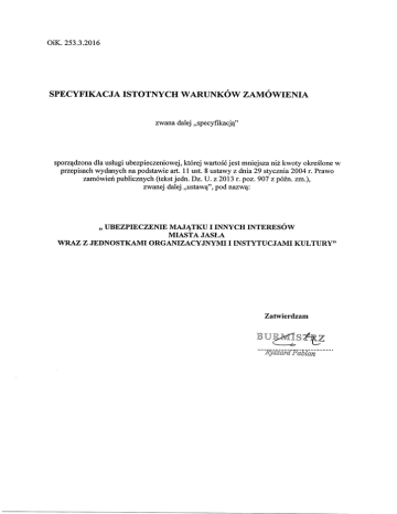 Nazwa: M Adres: ul. Rynek 12, 38Telefon: (13) 44 86 311, faks: (13) 44 86 360 Strona internetowa : www.jaslo.pl NIP: 685-10-00-345, REGON: 370440301 Dni i godziny pracy Ur 17:00, wtorek 15:30 1. 1. 1.1. 1) 2) 3) 4) ubezpie 5) 6) ubezpieczenia komunikacyjne (OC, Auto Casco, NNW, Assistance) 7) 1.2. 2. 3. 66515400 uszkodzenia lub utraty), 66516400 66516000 mechanicznych), 66512100 4. 4.1. 5. - Termin wyko od dnia 01.04.2016 r. do dnia 31.03.2017 r. - 1. 1.1. ustawy z dnia 22 maja 2003r. o dzia sowego o posiadaniu SIWZ. 1.2. 1.3. 1.4. Sytuacji ekonomicznej i finansowej. 2. 3. 1.4. w celu 1. 2. z dnia 29 stycznia 2004 r. 2.1. do niniejszej specyfikacji; 2.2. specyfikacji; 2.3. zezwolenia 4 3. 3.1. b do niniejszej specyfikacji; 3.2. podstaw do wykluczenia w oparciu o art. 24 ust. 1 pk 3.3. 4. zamiast dokumentu, ofert. 4.1. by uprawnione do reprezentacji Wykonawcy, lub miejsce zamieszkania, lub przed notariuszem. 4.2. 5. nomocnictwo do 5.1. kopii potwierdzonej notarialnie. 6. kwalifikowanego certyfikatu. 6.1. 6.2. 6.3. 7. Zgodnie z art. 26 ust. 2a ustawy niu, potencjale technicznym, osobach zdolnych do 8. 8.1. P 9. nia i odrzuceniu albo konieczne -I mnej. 1. 2. 3. ie pisemnej. 4. ich otrzymania. 5. 5.1. Za 5.2. stronie internetowej. 6. Osobami uprawnio 1 2. Barbara Paluch, nr tel.: (13) 4486350 w godz. od 7.30 do 15.30 ania wniosku, w wniesienia wadium. - - Opis sposobu przygotowywania ofert 1. Przygotowanie oferty 1.1. 1.2. 1.3. 1.4. Koszty zw 1.5. 1.6. wymagane dokument 1.7. 1.7.1. 1.7.2. 1.7.3. bo do reprezentowania 1.7.4. uprawniona do reprezentowania Wykonawcy zgodnie 1.8. 1.9. 1.10. 1.11. 1.12. Zaleca 1.13. w oddzieln 2. 2.1. z odpisem z 2.2. Opakowanie oferty nal : wraz z jednostkami organizacyjnymi i instytucjami kultury. - otwarcia ofert - 1. 2. 3. 4. 26.02.2016 r. o godz. 10:30 5. dnia 26.02.2016 r. o godz. 10:00 - w dniu 5.1. 5.2. Podczas o ofertach. - Opis sposobu obliczania ceny 1. 2. wyko 3. wystawienia polisy ubezpieczeniowej. 4. C - 1. Przy wyborze oferty kryteriami: 1.1. 1) cena oferty 2) klauzule dod - 80% - 20% 1.2. 1) cena oferty 2) 2. 2.1. wienia 2.1.1 Cena oferty: 80% 20% Cn = ----------------------------------Cena oferty badanej gdzie: Cn Kp Wc 2.1.2 Klauzule dodatkowe i inne postanow 2.1.2.4.), zgodnie z ie Imp badanej Pp = -----------------------100 pkt gdzie: Pp , Imp Kp Wk 20%. 000 000,zdarzenia g podanej definicji z limitem odszkodowawczym 10 2 punkty 000 000,1 000 000,- 2 punkty 3 punkty 2 punkty 2 punkty i mienia z limitem odszkodowawczym 50 000,i wszystkie zdarzenia, z podlimitem 10 000,graffiti m odszkodowawczym 20 000,20 000,- - 3 punkty 2 punkty 3 punkty wszystkie zdarzenia Zniesienie franszyzy integralnej w szkodach rzeczowych 4 punkty 2 punkty Zniesienie udzia 4 punkty 4 punkty 2 punkty 2 punkty 2 punkty 2 punkty 3 punkty 2 punkty - w rocznym okresie ubezpieczenia 10 000,Zniesienie 5 wymagane oraz klauzule dodatkowe i postanowienia szcz 4 punkty 2.2. 2.2.1 wzorem: Cn = --------------------------Cena oferty badanej gdzie: Cn Kp Wc = 80% Imp badanej Pp = -----------------------100 pkt gdzie: Pp Imp Kp Wk 20%. 2.2.2.1 3. Wynik oceny ofert 3.1. 3.2. 4. art. 87 ust. 2 ustawy 5. w niniejszej specyfikacji. Rozdzia - 1. 2. - - Istotne dl takich warunkach 1. 6a do niniejszej specyfikacji. 2. Zgodnie z art. 144 ust oz 3. w st a) e b) c) d) e) f) 4. Warunkiem dokonan a) opis zmiany, b) uzasadnienie zmiany, c) ie Wykonawcy. 5. 6. art. 140 ust. 3 ustawy Prawo z 7. m pierwszego ryzyka, ubezpieczenia mienia od ryzyka, wystaw - publicznych z dn.29 stycznia 2004r.. publicznych - specyfikacji. - Nr 1 Nr 1a Nr 2 Nr 3 Nr 3a nych Nr 3 b Nr 3c 2007 r. o ochron Nr 4 warunki obligatoryjne Nr 5 klauzule dodatkowe i inne postanowienia Nr 6 Nr 6a Nr 7 Nr 9 Pr oraz kla podlimity odszkodowawcze w z - odszko niedopuszczalne 1. ul. Rynek 12 38PKD: 7511Z Regon: 370440301 NIP: 685-10-00-345 2. ul. Sikorskiego 15 38PKD: 9261 Regon: 000659035 NIP: 685-10-04-828 rekreacyjna (basen otwarty prowadzony od 10.06 do kawiarnie, mini hotel na 38 miejsc z parkingiem samochodowym i zapleczem kuchennym do 3. ul. Kochanowskiego 3 38PKD: 8532C Regon: 004010685 NIP: 685-155-74-15 4. ul. Kadyiego 11 38PKD: 925210 Regon: 000282932 NIP: 685-19-33-723 opracowanie, przechowywanie 5. Jasielski Dom Kultury 38PKD: 923135 Regon: 000281766 NIP: 685-10-05-710 6. Miejska Biblioteka Publiczna u 38PKD: 9251 Regon: 000282234 NIP: 685-19-30-162 7. Przedszkole Miejskie nr 1 ul. Tkaczowa 14 38PKD: 8010A Regon: 370012404 NIP: 685-15-57-355 8. Przedszkole Miejskie nr 2 38PKD: 8010A Regon: 370012410 NIP: 685-15-57-349 9. Przedszkole Miejskie nr 3 38PKD: 8010A Regon: 370012433 NIP: 685-155-86-33 10. Przedszkole Miejskie nr 6 ul. Kopernika 8A 38PKD: 8010A Regon: 370012462 NIP: 685-155-73-32 11. Przedszkole Miejskie nr 9 ul. Szkolna 38 38PKD: 8010A Regon: 3700121491 NIP: 685-15-57-326 12. Przedszkole Miejskie nr 10 ul. Ducala 3 38PKD: 8010A3 Regon: 370012500 NIP: 685-15-57-303 13. Przedszkole Miejskie nr 11 ul. Sikorskiego 10 38nych: 19 PKD: 8010A Regon: 370012516 NIP: 685-15-57-295 14. ul. Koralewskiego 9 38PKD: 801020 Regon: 001231664 NIP: 685-16-47-420 Opis prowadzone 15. ul. W. Pola 9 (budynek A) ul. Kopernika 8 (budynek B) 38PKD: 8010 Regon: 001231718 NIP: 685-16-02-587 Opis pro 16. 38PKD: 8010B Regon: 001231693 NIP: 685-15-57-786 -wychowawcza 17. ul. Lwowska 36 38PKD: 8010B Regon: 001231670 NIP: 685-16-47-414 18. Gimnazjum nr 1 ul. Czackiego 2 38-200 Ja PKD: 8021A Regon: 370474665 NIP: 685-19-87-736 19. ul. Rafineryjna 3a 38PKD: 8010C Regon: 180156550 NIP: 685-21-96-787 20. ul. Mickiewicza 108 38PKD: 8010C Regon: 180156610 NIP: 685-21-96-770 21. ul. Szkolna 38 38PKD: 8010A Regon: 370472525 NIP: 685-19-96-451 22. ul. P. Skargi 10 38PKD: 8010B Regon: 001231658 NIP: 685-15-55-706 kacyjna 23. ul. Sobniowska 58 38PKD: 8010B Regon: 001231687 NIP: 685-15-66-265 C. Warunki obligatoryjne oraz klauzule dodatkow I. Ubezpieczenie mienia od wszystkich ryzyk 1. P podstawowy : i implozja, upadek statku powietrznego (rozumiany mien ziemi, 