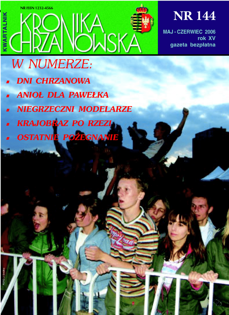 KWARTALNIK NR ISSN 1232-4566 MAJ - CZERWIEC 2006 rok XV gazeta bezp³atna W NUMERZE: FOTO. J. Smó³ka NR 144 n DNI CHRZANOWA n ANIO£ DLA PAWE£KA n NIEGRZECZNI MODELARZE n KRAJOBRAZ PO RZEZI n OSTATNIE PO¯EGNANIE FOTO. Archiwum MOKSiR DNI CHRZANOWA DNI CHRZANOWA WI¥TECZNY MARATON Tegoroczne obchody Dni Chrzanowa trwa³y a¿ cztery dni. Podobnie jak w roku ubieg³ym ustawiono dwie estrady, jedn¹ na chrzanowskim Rynku, drug¹ na Placu Tysi¹clecia. W³anie na nich skupi³y siê g³ówne atrakcje programowe wiêta naszego miasta. Niemniej spora czêæ imprez, g³ównie sportowych, odbywa³a siê jednoczenie w hali sportowej MOKSiR, w salach gimnastycznych szkó³ oraz na klubowych boiskach sportowych. Chrzanów ponadto goci³ przedstawicieli zaprzyjanionych miast Harnes, Ivano-Frankiwska i Nyekladhazy. W pierwszym wi¹tecznym dniu, czyli 1 czerwca w Dzieñ Dziecka organizatorzy przygotowali g³ównie atrakcje dla najm³odszych. Najpierw odby³ siê spektakl baletowy Czerwony Kapturek w wykonaniu Studia Baletowego MOKSiR. To ju¿ tradycja pielêgnowana od lat przez najm³odszych artystów baletowych, by z okazji w.Miko³aja i Dnia Dziecka wystawiaæ premierowe przestawienia, które za ka¿dym razem ciesz¹ siê du¿¹ popularnoci¹. Niew¹tpliw¹ atrakcj¹ tego dnia by³ pokaz sprzêtu ganiczego przygotowanego przez chrzanowskich stra¿aków obchodz¹cych swoje wiêto. Na Plac tysi¹clecia na syrenach zajecha³y wozy stra¿ackie, które od razu wzbudzi³y olbrzymie zainteresowanie nie tylko wród dzieci. Mo¿na by³o pysad. Swoj¹ obecnoæ w Chrzanowie zagrodê w Opolu, w kategorii premier. Chowdziêczali licznym wielbicielom, którzy w cia¿ na scenê polecia³o kilka jajek, to i tak internetowej sondzie w³anie na nich oddali oby³o siê, podczas koncertu rapera, bez wiêknajwiêcej g³osów. szych ekscesów chocia¿ dawa³o siê s³yW pi¹tek na Placu Tysi¹clecia ustawi³y szeæ wczeniej o planowanym, jajeczno-posiê stoiska targowe i reklamowe urzêdów i powiatów: chrzanowskiego, olkuskiego, owiêcimskiego w ramach Targów Przedsiêbiorczoci i Pracy Ma³opolski Zachodniej, których gospodarzem w tym roku by³ w³anie Chrzanów. Najwiêksi producenci z regionu prezentowali swoje produkty, natomiast urzêdy pracy i agencje porednictwa pracy sk³ada³y oferty pracy i szkoleñ. Na targach promowa³y siê równie¿ instytucje wspieraj¹ce biznes z ca³ego województwa. Mo¿na Targi Przedsiêbiorczoci i Pracy Ma³opolski Zachodniej by³o równie¿ dokonaæ degustacji ró¿nych kulinarnych pysznoci, które midorowym, ataku na artystê. Podobno z³awalczy³y o miano potraw regionalnych. Imma³ ¿elazne raperskie zasady, ale dok³adnie prezie targowej towarzyszy³y wystêpy zeo co chodzi, nie wiadomo. spo³ów folklorystycznych, dzieciêcych i m³oNiedzielne imprezy zainaugurowali najdzie¿owych. m³odsi chrzanowscy artyci, laureaci FestiSobotni dzieñ rozpocz¹³ siê uroczystym walu Dzieci i M³odzie¿y oraz Chrzanowskiej otwarciem Dni Chrzanowa. Burmistrz RyLokomotywy. Poziomem wykonania i zaanszard Kosowski przekaza³ klucz do bram ga¿owaniem wcale nie ustêpowali zawo- miasta m³odzie¿y, która na czas wi¹tecznych uciech mia³a miastu patronowaæ. Wczeniej wyst¹pi³ zespó³ Boom, który miêdzy innymi piewa³: Bo w Chrzanowie, i tylko w Chrzanowie, jest tak piêknie, ¿e krêci siê w g³owie. Rzeczywicie w tych dniach mog³o zakrêciæ siê w g³owie, g³ównie od iloci prezentowanych imprez i obecnoci prawdziwych gwiazd kabaretu i piosenki. Jako pierwszy wyst¹pi³ kabaret Rak, a nieco póniej kabaret Pod WydrwigroBurmistrz R. Kosowski przekazuje klucze od bram miasta m³odzie¿y szem, które serwowa³y porzasi¹æ za kierownic¹ samochodu stra¿accje miechu przede wszystkim uczestnikom kiego, wzbiæ siê w górê na wysiêgniku, czy i kibicom XXII Biegu Cabanów, bowiem uczestniczyæ w pokazie ratownictwa medyczmetê biegu ustawiono na rynku. Natomiast nego. Nie gorsi byli chrzanowscy policjanzespó³ Black&White piosenk¹ przeniós³ ci, którzy równie¿ w tym dniu przygotowali widowniê w czasy PRL, piewaj¹c najwiêkszereg atrakcji w ramach programu W trosze przeboje z tamtych lat. Estrada na Placu sce o dobro dzieci i m³odzie¿y. W zabawoTysi¹clecia prezentowa³a w tym dniu mocwej formie, z konkursami z nagrodami dzieniejsze uderzenie, których sprawcami by³y ci uczy³y siê podstawowych zasad zachowam³odzie¿owe kapele. Najpierw wyst¹pi³y zenia bezpieczeñstwa w domu, w szkole, na spo³y Ziemi Chrzanowskiej: Werset, Trafo, ulicy czy pod blokiem. Pierwsz¹ imprez¹ esKid A i Vertigo. Póniej zagra³ Sztywny Pal tradow¹ by³ koncert zespo³u Arka Noego, Azji, który obchodzi³ w³anie jubileusz dwuktóry zgromadzi³ przed estrad¹ prawdziwe dziestolecia swojego istnienia. Na zakoñczet³umy swoich ma³ych i du¿ych fanów. Na nie wieczoru wyst¹pi³ s³ynny raper z Poznazakoñczenie dnia wyst¹pi³ jeden z czo³owych nia zwany Mejger czyli Mezo, który razem z zespo³ów polskiej sceny niezale¿nej HapKasi¹ Wilk w ubieg³ym roku zdoby³ II na- dowcom, zbieraj¹c od licznej widowni zas³u¿one oklaski. W tym dniu nie lada gratkê mieli mi³onicy motoryzacji, którzy mogli podziwiaæ wspania³e motocykle, piêknie wypolerowane, dostojne, legendarne i, jak mówi¹ ich w³aciciele, daj¹ce wolnoæ i przepustkê do elitarnej wspólnoty. Póniej chrzanowianie nagradzali brawami wysoki kunszt aktorski, wokalny i kabaretowy Wiktora Zborowskiego. Podoba³ siê te¿ Grzegorz Wilk z zespo³em Weso³e futra gwiazda programów Jaka to melodia i Majewski show. Zespó³ Raz, Dwa, Trzy swoich fanów wprowadzi³ w stan egzaltacji, a koncert D¿emu dope³ni³ reszty doprowadzaj¹c 8 - tysiêczn¹ widowniê do muzycznego szaleñstwa i tanecznego ob³êdu. Trudne zadanie czeka³o teraz gwiazdê wieczoru, s³ynnego przed laty w³oskiego piosenkarza Drupiego, ale artysta, bazuj¹c na swojej legendzie, podtrzyma³ wrzenie publicznoci, dodaj¹c do niego swój specyficzny temperament i ni