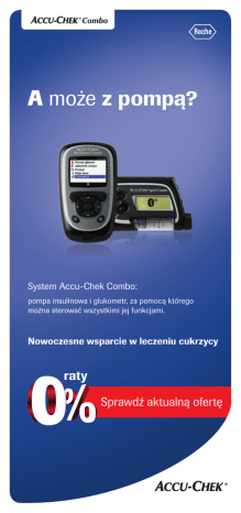 A może z pompą? System Accu-Chek Combo: pompa insulinowa i glukometr, za pomocą którego można sterować wszystkimi jej funkcjami. Nowoczesne wsparcie w leczeniu cukrzycy raty Sprawdź aktualną ofertę Bo w życiu liczy się pewność i swoboda t! ontrak k n e t Ma m OK! Jedziemy dalej! Ten i tylko ten :-) a N asza pierwsz zakupo-randka Jesz mi z ręki kotku ;-) Hmmm, do kina czy na film? Dziś premiera ... Zmieniając sposób leczenia z pena na system Accu-Chek Combo: redukujesz liczbę wkłuć z ok. 150 do 10 miesięcznie swobodnie wybierasz porę snu... ...i posiłków podajesz insulinę w mikrodawkach już od 0,05 jednostki* dostosowujesz dawkę insuliny do różnych sytuacji* (fitness – zmniejszasz, przeziębienie – zwiększasz) * zawsze na podstawie indywidualnych zaleceń lekarza diabetologa Zalecenie bolusa 106 mg/dL 0.0 U 2.1 U 19 g -0.1 U Ćwiczenie 1 2U Bolus Standardowy Rodzaj Anuluj Potwierdź --- U korzystasz z kalkulatora bolusów, który automatycznie oblicza potrzebną dawkę insuliny* zdalnie kontrolujesz pompę, nie wyjmując jej spod ubrania: ekran pompy widzisz na ekranie glukometru-pilota Odwiedź naszą stronę: - zeskanuj kod QR lub wejdź na www.accu-chek.pl - zobacz jak działa system Accu-Chek Combo - zapoznaj się z poradami na temat życia z pompą - dowiedz się wszystkiego o refundacji zestawów infuzyjnych do pompy Chcesz kupić lub wypożyczyć pompę? Zadzwoń na naszą infolinię lub do lokalnego przedstawiciela Województwa: zachodniopomorskie, pomorskie, kujawsko-pomorskie, warmińsko-mazurskie Jolanta Rutkowska-Kośmińska tel. 691 351 694 wielkopolskie Agnieszka Rydzewska tel. 691 351 970 lubuskie, łódzkie, dolnośląskie Agnieszka Sauter-Majsterek tel. 691 352 056 podlaskie, mazowieckie, lubelskie Anna Dąbrowska tel. 691 352 051 opolskie, śląskie, świętokrzyskie, małopolskie, podkarpackie Ewa Gwóźdź tel. 691 352 043 Jesteśmy do Twojej dyspozycji Infolinia: 801 080 104* * Opłata za połączenie jest zgodna z planem taryfikacyjnym danego operatora. * Opłata za połączenie jest zgodna z planem taryfikacyjnym danego operatora. Roche Diagnostics Polska Sp. z o.o. ul. Wybrzeże Gdyńskie 6B 01-531 Warszawa infolinia: 801 080 104* www.accu-chek.pl BEZ PROWIZJI BEZ ODSETEK BEZ PIERWSZEJ WPŁATY Roche Diagnostics Polska Sp. z o.o. występujący w roli pośrednika kredytowego sporządza i zawiera umowy o kredyt na zakup towarów i usług w imieniu i na rzecz Santander Consumer Bank S.A., wydaje Formularz Informacyjny, przyjmuje oświadczenia o odstąpieniu od umowy kredytu na zakup towarów i usług oraz udziela wyjaśnień dotyczących treści wymienionych dokumentów. O szczegóły pytaj sprzedawcę lub sprawdź na www.santanderconsumer.pl Dla kredytu na zakup towarów i usług oferowanego przez Santander Consumer Bank S.A. dla propozycji 3 x 0%, wyliczenia dla przykładu reprezentatywnego na dzień 03.12.2013 są następujące: stała stopa oprocentowania kredytu 0%, prowizja za udzielenie kredytu 0 zł, odsetki 0 zł, całkowita kwota kredytu 1500 zł, RRSO 0%, czas obowiązywania umowy 10 miesięcy, całkowita kwota do zapłaty przez konsumenta 1500 zł, wysokość rat 150 zł.
