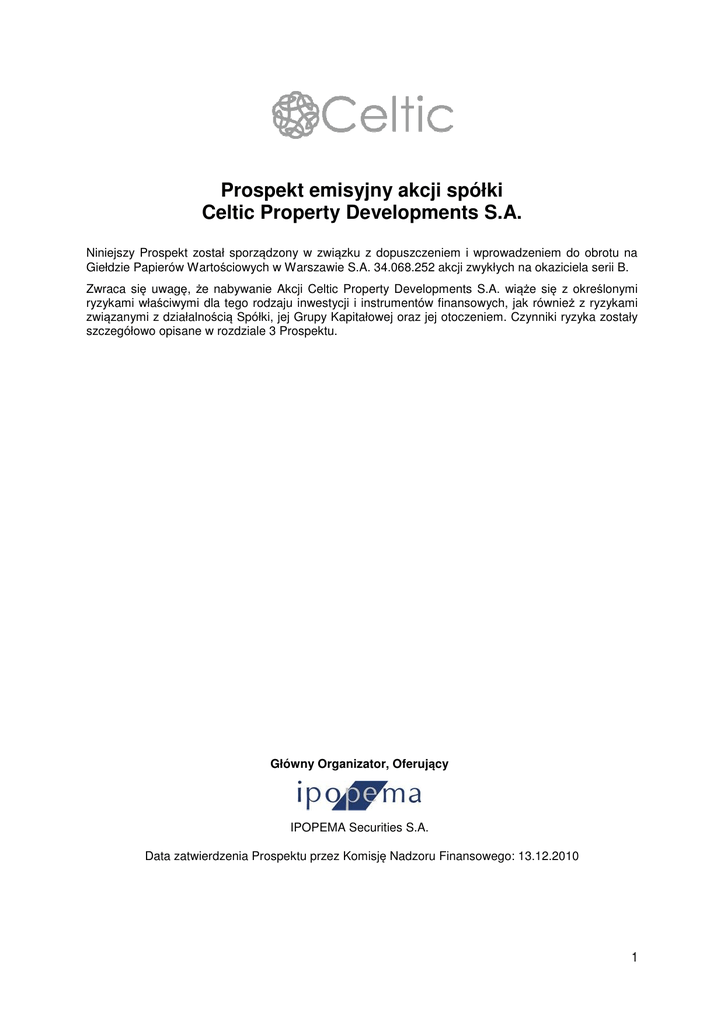 Prospekt emisyjny akcji spółki Celtic Property Developments S.A. Niniejszy Prospekt został sporządzony w związku z dopuszczeniem i wprowadzeniem do obrotu na Giełdzie Papierów WartoĞciowych w Warszawie S.A. 34.068.252 akcji zwykłych na okaziciela serii B. Zwraca siĊ uwagĊ, Īe nabywanie Akcji Celtic Property Developments S.A. wiąĪe siĊ z okreĞlonymi ryzykami właĞciwymi dla tego rodzaju inwestycji i instrumentów finansowych, jak równieĪ z ryzykami związanymi z działalnoĞcią Spółki, jej Grupy Kapitałowej oraz jej otoczeniem. Czynniki ryzyka zostały szczegółowo opisane w rozdziale 3 Prospektu. Główny Organizator, Oferujący IPOPEMA Securities S.A. Data zatwierdzenia Prospektu przez KomisjĊ Nadzoru Finansowego: 13.12.2010 1 2 Spis treĞci 1. 1.1 1.2 1.3 1.4 1.5 1.6 1.7 2. 2.1 2.2 2.3 3. 3.1 3.1.1 3.1.2 3.1.3 3.1.4 3.2 3.2.1 3.2.2 3.2.3 3.2.4 3.2.5 3.2.6 3.2.7 3.2.8 3.2.9 3.2.10 3.2.11 3.2.12 3.2.13 3.2.14 3.2.15 3.2.16 3.2.17 3.2.18 3.2.19 3.3 3.3.1 PODSUMOWANIE ..................................................................................................................... 7 Podsumowanie ........................................................................................................................... 7 Przewagi konkurencyjne............................................................................................................. 8 Strategia ................................................................................................................................... 10 Czynniki ryzyka......................................................................................................................... 11 Struktura akcjonariatu............................................................................................................... 12 Szczegóły dopuszczenia akcji do obrotu.................................................................................. 12 Podsumowanie danych finansowych ....................................................................................... 13 OSOBY ODPOWIEDZIALNE ZA INFORMACJE W PROSPEKCIE ...................................... 15 OĞwiadczenie Spółki ................................................................................................................ 15 OĞwiadczenie Oferującego ...................................................................................................... 16 OĞwiadczenie Doradcy Prawnego ........................................................................................... 17 CZYNNIKI RYZYKA................................................................................................................. 18 Czynniki ryzyka związane z otoczeniem rynkowym ................................................................. 18 Ryzyko związane z sytuacją makroekonomiczną rynków, na których Spółka i jej Grupa Kapitałowa prowadzą działalnoĞü ...................................................................................................... 18 Ryzyko związane ze zmianami przepisów prawa i innych regulacji mających wpływ na zakres działalnoĞci prowadzonej przez SpółkĊ i jej GrupĊ Kapitałową oraz niestabilnoĞcią systemu prawnego ............................................................................................................................................... 18 Ryzyko związane z procesem uzyskiwania decyzji administracyjnych, moĪliwoĞcią ich zaskarĪania oraz brakiem planów zagospodarowania przestrzennego ...................................... 18 Ryzyko związane z konkurencją ........................................................................................................ 19 Czynniki ryzyka związane bezpoĞrednio z działalnoĞcią Spółki .............................................. 19 Ryzyko związane z realizacją projektów deweloperskich .............................................................. 19 Ryzyko związane z lokalizacją nieruchomoĞci ................................................................................ 19 Ryzyko związane z niemoĪnoĞcią zakupu gruntów atrakcyjnych z punktu widzenia Spółki .... 19 Ryzyko związane z brakiem płynnoĞci inwestycji nieruchomoĞciowych ..................................... 20 Ryzyko związane z geograficzną koncentracją projektów Spółki i jej Grupy Kapitałowej......... 20 Ryzyko związane ze wzrostem kosztów budowy projektów deweloperskich ............................. 20 Ryzyko związane z niekorzystnymi warunkami gruntowymi ......................................................... 20 Ryzyko niekorzystnych warunków atmosferycznych ...................................................................... 20 Ryzyko związane ze zmianami cen sprzedaĪy mieszkaĔ i stawek czynszów najmu ................ 20 Ryzyko związane z wadami prawnymi nieruchomoĞci i ryzyko wywłaszczeniowe .................... 21 Ryzyko związane z odpowiedzialnoĞcią z tytułu ochrony Ğrodowiska ......................................... 21 Ryzyko związane z umowami zawieranymi z wykonawcami i podwykonawcami robót budowlanych ......................................................................................................................................... 21 Ryzyko związane z umowami najmu ................................................................................................ 21 Ryzyko związane z nieosiągniĊciem zakładanych celów strategicznych .................................... 22 Ryzyko związane z kadrą menedĪerską .......................................................................................... 22 Ryzyko związane z finansowaniem rozwoju kredytami bankowymi i innymi instrumentami dłuĪnymi ................................................................................................................................................ 22 Ryzyko związane z dokładnoĞcią wycen zawartych w niniejszym Prospekcie ..........