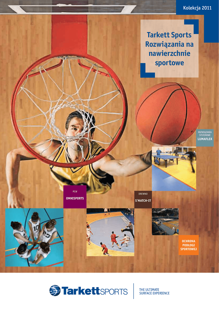 Kolekcja 2011 Tarkett Sports Rozwiązania na nawierzchnie sportowe ROZWIĄZANIA SYSTEMOWE lumaflex PCW omnisports DREWNO s’match-it OCHRONA PODŁOGI sportowej SPIS TREŚCI 2 4 Grupa Tarkett – kompleksowe rozwiązania w dziedzinie podłóg i nawierzchni sportowych 5 Tworzenie nawierzchni najwyższej jakości 6 Ekologiczne podejście: dokonaj zrównoważonego wyboru 8 Tarkett Sports – Twój dostawca nawierzchni sportowych 10 Tarkett Sports – partner wybierany przez profesjonalistów 12 18 Co trzeba wiedzieć o nawierzchniach sportowych? 20 Przewodnik: zasady dokonywania wyboru 22 Omnisports nawierzchnie winylowe 36 S’Match-it nawierzchnie drewniane 46 Lumaflex – rozwiązania systemowe 56 Ochrona podłogi sportowej 64 Akcesoria 74 Nasza dbałość o pełną satysfakcję Klienta Nasza światowej klasy gwarancja Rozwiązania wg zastosowań Tarkett Sports - The ultimate surface experience Yssingeaux, Francja 3 Grupa Tarkett – kompleksowe rozwiązania w dziedzinie podłóg i nawierzchni sportowych Firma Tarkett Sports to część wiodącej w dziedzinie produkcji pokryć podłogowych grupy Tarkett. Nasza współpraca z architektami, wykonawcami, instalatorami i menedżerami obiektów ma na celu dostarczenie rozwiązań podłogowych, dostosowanych do realizowanych przez nich rozmaitych projektów sportowo-rekreacyjnych. Tarkett Sports – część Grupy Tarkett Nasze kompetencje w dziedzinie sportu rozwijamy od ponad 130 lat, gromadząc doświadczenie w tworzeniu podłóg oraz nawiązując współpracę z krajowymi i międzynarodowymi federacjami sportowymi. Realizując każdy projekt, angażujemy Klienta, aby móc zaprojektować, stworzyć i zainstalować najlepszą pod wzglę- dem wykonania, bezpieczeństwa i komfortu użytkowania nawierzchnię sportową. Dzięki naszym stałym wysiłkom na rzecz poprawy jakości, innowacyjności i zadowolenia Klienta, nasze podłogi obecne są w wielu prestiżowych obiektach sportowych na świecie. Grupa Tarkett zatrudnia 8 800 pracowników w 30 zakładach produkcyjnych oraz w 50 biurach zajmujących się sprzedażą i marketingiem, służąc swoim Klientom w ponad 100 krajach. Codziennie firma Tarkett produkuje i sprzedaje 1,2 miliona metrów kwadratowych wykładzin i podłóg. Nasze produkty pomagają ludziom doświadczyć lepszej jakości życia na co dzień w pracy, w domu i podczas aktywności sportowej. 4 Tarkett Sports - The ultimate surface experience Tworzenie nawierzchni sportowej najwyższej jakości Głównym zadaniem zintegrowanych rozwiązań podłogowych firmy Tarkett Sports jest zapewnienie Klientom i użytkownikom najwyższego komfortu użytkowania. Menedżerom obiektów nasze nawierzchnie gwarantują trwałość, wytrzymałość i korzystny zwrot z inwestycji w całym okresie życia produktu. Na wszystkich poziomach zaawansowania podnoszą one efektywność sportowców poprzez zwiększony komfort, lepszą akustykę i bezpieczeństwo podczas zróżnicowanych działań sportowo-ruchowych. Firma Tarkett Sports oferuje możliwość tworzenia wyróżniających się nawierzchni dla każdego typu projektu dzięki połączeniu wiedzy światowej rangi specjalistów i szerokiego wachlarza produktów, który obejmuje wykładziny elastyczne, wykładziny z linoleum, podłogi drewniane, rozwiązania systemowe, ochronę nawierzchni sportowych oraz akcesoria. Każde z oferowanych rozwiązań posiada konkretne funkcjonalne, użytkowe i ekologiczne zalety. Funkcjonalność Tarkett Sports tworzy łatwe w montażu nawierzchnie sportowe o dużej odporności na ścieranie, które zachowują wyjątkową trwałość i wytrzymałość z upływem czasu. Unikalne zabezpieczenia powierzchniowe minimalizują wymagania w zakresie czyszczenia i konserwacji, co dla Klientów oznacza niższe koszty w trakcie eksploatacji, a w związku z tym większy zwrot z inwestycji. Walory użytkowe Nawierzchnie Tarkett Sports stanowią świetną podstawę dla aktywności sportowej na wszystkich poziomach zaawansowania. Konstrukcja podłogi zapewnia komfort pod stopami sportowców, dobrą akustykę oraz bezpieczeństwo i optymalne warunki do gry. Kolory, wzory i faktury decydują o pozytywnych wrażeniach wizualnych. Ekologia Tarkett Sports stale poszukuje nowych sposobów na zwiększenie zawartości materiałów z recyklingu w swoich produktach oraz stara się wdrażać recykling w coraz większym stopniu. Do czyszczenia naszych wykładzin potrzeba mniej wody, detergentów i energii, co zmniejsza ich wpływ na środowisko. Niskie poziomy emisji substancji z podłóg do atmosfery przyczyniają się do lepszej jakości powietrza w pomieszczeniach. 5 Ekologiczne podejście – dokonaj zrównoważonego wyboru Podejście firmy Tarkett do kwestii zrównoważonego wyboru polega na oferowaniu Klientom prostej i jasnej informacji, aby mogli dokonać właściwego wyboru podłogi, godząc przy tym wymagania projektu i budżetu, z potrzebą wprowadzenia zrównoważonych rozwiązań. W naszej firmie zrównoważony wybór nie jest czysto teoretycznym pojęciem. Codziennie realizujemy go w praktyce w sposobie, w jaki projektujemy i wytwarzamy nasze produkty. Skupiliśmy się na czterech kluczowych obszarach, w których nasi Klienci mogą dokonać zrównoważonego wyboru: 1 Wybór lepszych materiałów – z surowców naturalnych i , jeśli to możliwe, z odnawialnych. WYBIERZ LEPSZE MATERIAŁY. Aby umożliwić dokonanie zrównoważonego wyboru, firma Tarkett podaje szczegółowe informacje na temat swoich podłóg i ich składu. Na tej podstawie można wybrać bardziej przyjazne środowisku produkty, które: mają większą zawartość naturalnych i/lub odnawialnych surowców; zawierają składniki pochodzące z recyklingu; mogą same podlegać recyklingowi; wydzielają mniej lotnych związków organicznych, co pomaga polepszyć jakość powietrza w pomieszczeniach. 6 2 Wybór podłogi wyprodukowanej z wykorzystaniem mniejszej ilości zasobów – monitorujemy i stale zmniejszamy zużycie