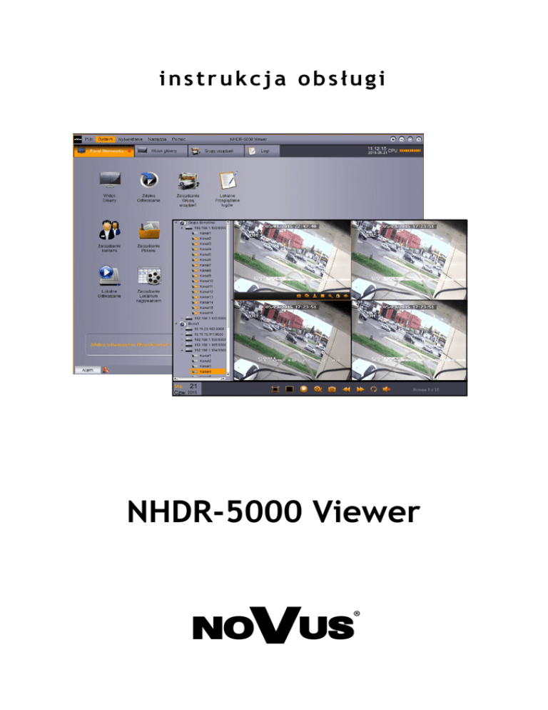 instrukcja obsługi NHDR-5000 Viewer NHDR-5000 Viewer instrukcja obsługi ver. 1.0 INFORMACJE WSTĘPNE SPIS TREŚCI ......................................................................................................... 2 1. INFORMACJE WSTĘPNE.............................................................................. 3 1.1. Charakterystyka ogólna ............................................................................... 3 1.2. Zalecana konfiguracja komputera PC ......................................................... 3 2. INSTALACJA I URUCHOMIENIE OPROGRAMOWANIA .................... 4 2.1. Instalacja oprogramowania .......................................................................... 4 2.2. Ekran logowania .......................................................................................... 6 2.3. Zmiana języka oprogramowania ................................................................. 6 2.4. Kreator ......................................................................................................... 7 3. INTERFEJS APLIKACJI ................................................................................ 7 3.1. Opis funkcji menu ....................................................................................... 8 4. PANELE ............................................................................................................. 9 4.1. Panel Sterowania ......................................................................................... 9 4.2. Zarządzanie grupą urządzeń ........................................................................ 9 4.3. Widok główny - podgląd „na żywo” ......................................................... 12 4.4. Zdalne odtwarzanie ................................................................................... 15 4.5. Konfiguracja systemu ................................................................................ 18 4.6. Zarządzanie kontami użytkowników ......................................................... 20 4.7. Zarządzanie alarmami ............................................................................... 21 4.7.1. Pasek alarmów ................................................................................... 22 4.8. Lokalne przeglądanie logów ...................................................................... 23 4.9. Zarządzanie plikami .................................................................................. 24 4.10. Zarządzanie mapami ................................................................................ 25 4.11. Lokalne nagrywanie ................................................................................ 27 4.11.1. Zarządzanie lokalnym nagrywaniem ............................................... 27 4.11.2. Lokalne odtwarzanie ........................................................................ 28 5. ODTWARZACZ PLIKÓW WIDEO H264 .................................................. 29 Wszelkie prawa zastrzeżone © AAT Holding S.A. 2 NHDR-5000 Viewer instrukcja obsługi ver. 1.0 INFORMACJE WSTĘPNE 1. INFORMACJE WSTĘPNE 1.1. Charakterystyka ogólna Oprogramowanie do połączeń sieciowych z rejestratorami AHD marki NOVUS; Praca w trybie wielomonitorowym; 4 niezależne okna podglądu wideo; Odtwarzanie do 4 strumieni wideo; Zdalna konfiguracja rejestratorów; Tworzenie grup urządzeń; Zaawansowane ustawienia kont użytkowników; Implementacja map obiektów; Możliwość tworzenia własnych układów kamer; Lokalne nagrywanie i odtwarzanie nagrań; Kompresja H.264; Sterowanie kamer szybkoobrotowych przy pomocy panelu PTZ - obsługiwane protokoły Pelco-D, Pelco-P; Eksport zarejestrowanego materiału wideo do plików AVI; Obsługa scenariuszy zdarzeń alarmowych; 1.2. Zalecana konfiguracja komputera PC Poniżej zawarte zostały wymagania dotyczące specyfikacji jednostki komputerowej dla oprogramowania NHDR-5000Viewer: 1. Procesor CPU Intel i3 2. Pamięć operacyjna RAM DDR3 4 GB 3. System operacyjny Windows Pro 7 64 bit (zalecany) (również obsługiwane: Windows XP (32bit) / Vista Bussines (32bit) / Windows Pro 7 (32bit) 4. Karta sieciowa 100/1000 Mb/s 5. Karta dźwiękowa 6. Dysk twardy (program po zainstalowaniu zajmuje ok 50MB) Wszelkie prawa zastrzeżone © AAT Holding S.A. 3 NHDR-5000 Viewer instrukcja obsługi ver. 1.0 INFORMACJE WSTĘPNE 2. INSTALACJA I URUCHOMIENIE OPROGRAMOWANIA 2.1. Instalacja oprogramowania Oprogramowanie NHDR-5000 Viewer może zostać pobrane ze strony www.novuscctv.com. Po zapisaniu instalatora na dysku, proszę go uruchomić. Zostanie wyświetlone okno jak poniżej. Naciśnięcie Next powoduje przejście do kolejnego okna, Cancel opuszczenie instalatora. W kolejnym oknie instalator może wybrać ścieżkę instalacji programu. Wszelkie prawa zastrzeżone © AAT Holding S.A. 4 NHDR-5000 Viewer instrukcja obsługi ver. 1.0 INFORMACJE WSTĘPNE W kolejnym oknie użytkownik określa ścieżkę i folder tworzony w menu startowym. W kolejnym oknie należy wybrać jakie ikony mają być utworzone. Create desktop icon - oznacza utworzenie ikony na pulpicie. Create a Quick lunch icon - oznacza utworzenie ikony na pasku szybkiego uruchamiania. Wszelkie prawa zastrzeżone © AAT Holding S.A. 5 NHDR-5000 Viewer instrukcja obsługi ver. 1.0 INFORMACJE WSTĘPNE Okno informujące o zakończeniu instalacji. Zaznaczona opcja Launch NHDR-5000 Viewer powoduje uruchomienie aplikacji po naciśnięci przycisku Finish. Aplikacja może zostać uruchomiona za pomocą skrótu na pulpicie, skrótu z menu szybkiego uruchamiania lub z menu startowego (w zależności od wybranych opcji podczas instalacji). 2.2. Ekran logowania Po uruchomieniu aplikacji zostanie wyświetlony ekran logowania. Domyślny użytkownik to admin, a hasło należy pozostawić puste (brak hasła). Zaznaczenie opcji Enable Auto-login będzie skutkowało automatycznym logowaniem do aplikacji. Aby przejść dalej proszę nacisnąć Login. 2.3. Zmiana języka oprogra