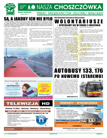 nr 4 (106) VII/VIII 2012 WWW. NCH. PL Są, a jakoby ich nie było Budowa wiaduktów w Płudach i Choszczówce została praktycznie zakończona. Jedynie przy wiadukcie w ciągu ulicy Klasyków nie została usunięta kolizja z linią energetyczną co uniemożliwia zasilanie oświetlenia wiaduktu. Usuwanie tej kolizji trwa długo, ponieważ tak długo trwają procedury urzędowe w RWE Stoen. Słyszymy, że brak zastępstwa a inspektor odpowiedzialny za nadzorowanie przebudowy to chorował, to wyjeżdżał na urlop. Wykonawca kompletuje teraz dokumentację wniosków o pozwolenie, niezbędną do złożenia w Wojewódzkim Inspektoracie Nadzoru Budowlanego. Sezon urlopowy utrudnia zdobywanie potrzebnych podpisów – projektantów oraz inspektorów nadzoru inwestorskiego. Oddanie obiektów do użytku możliwe jest we wrześniu br. Główną przyczyną opóźnienia budowy wiaduktów są procedury obowiązujące w RWE Stoen, uzgodnienie i podpisanie umów oraz nadzór nad realizacją przebudowy, a także warunki gruntowowodne odmienne od tych jakie znane było wykonawcy robót na etapie projektowania. W trakcie budowy wynikła potrzeba wprowadzenia zmian technologicznych oraz wykonania robót dodatkowych. Budowa wiaduktów finansowana jest przez Inwestora – PKP PLK SA przy udziale Funduszy Unijnych. Koszt netto budowy wiaduktu w ciągu ulicy Klasyków (Płudy) wynosi około 8 759 600 EUR. Koszt netto budowy wiaduktu w ciągu ulicy Mehoffera (Choszczówka) wynosi około 4 017 661 EUR. Ostateczny koszt znany będzie po zakończeniu i rozliczeniu końcowym wszystkich robót. Elżbieta Bąk Polskie Linie Kolejowe XVII Olimpiada Sportowa w Choszczówce Wolontariusze – spotkajmy się w ŚrodĘ 5 września W tym roku XVII Olimpiada Sportowa w Choszczówce odbędzie się tradycyjnie w drugą niedzielę września, czyli 9 września o godz. 11.30 na placu zabaw w Klubie Dziki Zakątek. Organizatorzy zapowiadają wiele atrakcji, które odbędą się: przed, w trakcie i po zawodach. Jak zwykle odbędzie się Sztafeta Rodzinna (2 rodziców + dziecko, uczestnik olimpiady). Organizatorzy olimpiad sportowych w Choszczówce zwracają się do osób chcących uczestniczyć przy organizacji XVII Olimpiady o zgłaszanie swoich kandydatur do pomocy. Apelujemy o pomoc szczególnie do osób młodych – gimnazjalistów, licealistów i studentów.. Naszą ideą jest, aby organizacja była w rękach ludzi młodych przy życzliwej i logistycznej pomocy osób dorosłych w myśl hasła młodzież –dzieciom. Opiekunami grup w ciągu ostatnich kilku lat byli zwykle gimnazjaliści, licealiści, studenci, którzy doskonale wywiązywali się ze swych obowiązków. W roku ubiegłym pomagało nam blisko 90 takich wolontariuszy. Mamy nadzieję, że tak też będzie i w tym roku. Aby lepiej przygotować się do organizacji prosimy wszystkich wolontariuszy o przyjście na spotkanie organizacyjne w środę 5 września o godz. 16.00 do Klubu Dziki Zakątek w Choszczówce. Tam przekażemy Wam zadania, które będziecie wykonywać podczas Olimpiady. Prosimy również o pomoc rodziców, zwłaszcza tych których dzieci (w wieku 6- 12 lat) będą brały udział w zawodach. Na pewno każda z tych rodzin mogłaby o coś wzbogacić naszą wspólną zabawę (nagrody, fanty na loterię itp.). Niestety dzieci poniżej 6-go roku życia nie będą mogły uczestniczyć w zawodach. Zapisane będą tylko dzieci urodzone w latach: 2000 -2006 W tym roku chcemy wesprzeć finanse gazety Nasza Choszczówka i na ten cel przeznaczymy uzyskane środki. W czasie kryzysu coraz trudniej pozyskać reklamodawców stąd nasz apel o życzliwą pomoc. Zapisy na zawody odbędą się przed Gimnazjum przy ul Przytulnej 2 w Choszczówce w dniach: 1-ego września, sobota – godz. 12.00 – 14.00 2-ego września, niedziela – godz. 12.00 – 14.00 3-ego września, poniedziałek – godz. 17.00 – 19.00 Ze względów technicznych nie będziemy mogli dopisywać dzieci przed samymi zawodami. Każda osoba musi przy zapisie wykupić za 10 zł tzw. Szczęśliwy Numerek, który będzie brał udział w losowaniu atrakcyjnych nagród. Wszystkich chętnych prosimy o zgłaszanie się już teraz pod nr telefonów: 0 601 271 052 i 609 106 136 lub przez adresy e-mailowe: [email protected] oraz [email protected] Organizatorzy Autobusy 133, 176 po nowemu (staremu) Zbliża się otwarcie wiaduktów przy Klasyków i Mehoffera i w związku z tym ZTM przygotował korektę tras linii autobusowych 152, 176 i 133. Korekty zostały przygotowane po konsultacjach społecznych z przedstawicielami mieszkańców osiedli Zielonej Białołęki, przez które przebiegają te linie. W konsultacjach brali aktywnie udział przedstawiciele Stowarzyszenie Białołęka Dworska i Rady Osiedla Białołęka Dworska, którzy proponowali zmiany w przebiegu linii autobusowych dla całej Zielonej Białołęki. Do konsultacji włączyło się również Stowarzyszenia Nasza Choszczówka. dokończenie na str. 4 REMONTY – WYKO¡CZENIA ÂRODKI CZYSTOÂCI – SPRZÑTANIE Anteny Tv/Sat - Alarmy - Kamery - Domofony - instalacje anten RTV/SAT - wieszanie telewizorów - rozwiązywanie problemów instalacyjnych TV - instalacje zbiorcze - instalacje dekoderów: N, Polsat, DVB-T, Cyfra+, TNK) - kamery (podgląd z kamer w telewizorach) - alarmy - domofony, wideodomofony - konsultacja gratis WYKONUJEMY: • Prace remontowo-wykończeniowe • Meble na wymiar, kominki, grille ogrodowe • Prace z materiału powierzonego i własnego • Usługi porządkowe: sprzątanie, pranie, obsługa wspólnot • Posiadamy w ofercie profesjonalne środki i narzędzia do utrzymania czystości I INNE... TWOJA INWESTYCJA – NASZA PASJA Punkt handlowy i biuro: ul. Łàczniczek AK 1, 05-800 Pruszków, tel. 022 723 22 01, 668 801 002 2 e-mail: [email protected] Dział budowlany: tel. 698 590 296 Szydłowski Paweł tel. 508583051, 881583051 telewizja-hd.pl mail: [email protected] NASZA CHOSZCZÓWKA POSIADAMY URZĄDZENIA: WWW.NCH.PL ZAPRASZAMY NA