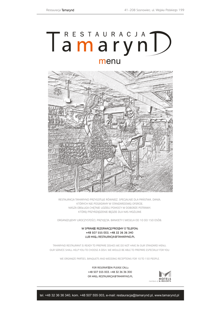 Restauracja Tamarynd 41-208 Sosnowiec, ul. Wojska Polskiego 199 menu RESTAURACJA TAMARYND PRZYGOTUJE RÓWNIEŻ, SPECJALNIE DLA PAŃSTWA, DANIA, KTÓRYCH NIE POSIADAMY W STANDARDOWEJ OFERCIE. NASZA OBSŁUGA CHĘTNIE UDZIELI POMOCY W DOBORZE POTRAWY, KTÓREJ PRZYRZĄDZENIE BĘDZIE DLA NAS MOŻLIWE ORGANIZUJEMY UROCZYSTOŚCI, PRZYJĘCIA, BANKIETY I WESELA OD 10 DO 150 OSÓB. W SPRAWIE REZERWACJI PROSIMY O TELEFON: +48 507 555 003, +48 32 36 36 340 LUB MAIL: [email protected] TAMARYND RESTAURANT IS READY TO PREPARE DISHES WE DO NOT HAVE IN OUR STANDARD MENU. OUR SERVICE SHALL HELP YOU TO CHOOSE A DISH, WE WOULD BE ABLE TO PREPARE ESPECIALLY FOR YOU WE ORGANIZE PARTIES, BANQUETS AND WEDDING RECEPTIONS FOR 10 TO 150 PEOPLE. FOR RESERVATION PLEASE CALL: +48 507 555 003, +48 32 36 36 300 OR MAIL: [email protected] members of: tel. +48 32 36 36 340, kom. +48 507 555 003, e-mail: [email protected], www.tamarynd.pl Restauracja Tamarynd Przystawki Starters Bruschetta ze szpinakiem z dodatkiem rodzynek i orzeszków pini 12,80 Bruschetta with spinach leaves, raisins & pine kernels Delikatny mus z kurzych wątróbek z konfiturą cebulową 12,80 Soft chicken liver mousse with onion chutney Mozarella zapiekana w szynce parmeńskiej z odrobiną kremu balsamico podana na roszponce 12,80 Mozzarella baked in Parma ham with balsamic sauce served on lamb’s lettuce Mix sałat z rukolą, włoską szynką i pestkami prażonej dyni 24,80 Italian ham & roasted pumpkin seeds served on mix of salads Tradycyjna sałata cesarska ze smażoną piersią z kurczaka 24,80 Traditional ceasar salad with fried chicken breast Sałatka z melonem podana z orzechowym pesto i grzankami z kozim serem 24,80 Salad with melon and goat cheese served with walnut pesto & croutons Zupy Soups Aksamitny krem z buraków z ziemniaczanymi chipsami 12,80 Mellow beetroot cream with homemade potato chips Minestrone z makaronem, warzywami i kawałkami wołowiny 12,80 Minestrone with pasta, vegetables & beef Aromatyczna zupa z trójkolorowej soczewicy i chorizo 12,80 Aromatic soup with lentils & chorizo Zupa kokosowa z krewetkami lub kurczakiem i tamaryndem 14,80 Coconut milk &Tamarind soup with prawns or chicken Dania główne Main courses Kurczak nadziewany suszonymi pomidorami i mozarellą ze szpinakowym tagliatelle 26,80 Chicken breast stuffed with dried tomatoes & mozzarella with spinach tagliatelle Polędwiczka wieprzowa z grzybami podana z domowymi frytkami i groszkiem cukrowym 36,80 Pork sirloin with mushrooms served with homemade fries & sweet peas Halibut pieczony w maśle łososiowym ze smażonym ryżem z warzywami z dodatkiem tamaryndu 36,80 Halibut baked in salmon butter with fried rice & vegetables with the addition of tamarind 20 krewetek duszonych w limonce, cytrynie i cebuli podanych ze świeżym pieczywem 36,80 20 prawns stewed with lime, lemon & onions served with fresh bread Łosoś z pieca na grillowanych warzywach z odrobiną czosnku i pietruszki 36,80 Salmon baked with grilled vegetables with a little garlic & parsley Pierś z kaczki na różowo z sosem miodowo imbirowym z gnocchi i groszkiem cukrowym 46,80 Pink duck breast with honey & ginger sauce served with gnocchi & sweet peas Stek z polędwicy wołowej podany z domowymi frytkami i smażonym szpinakiem 46,80 Sirloin steak served with homemade fries & fried spinach do wyboru z sosem: grzybowym, serowym, lub pieprzowym your choice of sauce: mushroom, cheese, or pepper 4,80 41-208 Sosnowiec, ul. Wojska Polskiego 199 Pizza rozmiar MARGHERITA | sos, ser, oregano 26 cm 14,80 32 cm 18,80 22,80 26,80 22,80 26,80 22,80 26,80 22,80 26,80 22,80 26,80 22,80 26,80 22,80 26,80 22,80 26,80 22,80 26,80 22,80 26,80 tomato sauce, cheese, oregano SALAME CON PEPE | salami, papryka peperoni salami, pepperoni GAMBERETTI | krewetki, oliwki shrimps and olives CAMPAGNOLA | cebula, boczek, czosnek onion, bacon, garlic SPINACI | szpinak, jajko sadzone, pomidory spinach, fried egg, tomatoes CARBONARA | boczek, parmezan, pieczarki z sosem śmietanowym bacon, Parmesan, mushrooms in cream sauce SALAME E TONNO | cebula, tuńczyk, salami onion, tuna, salami CON POLLO | kurczak, cebula, kukurydza, czerwona papryka chicken, onion, corn, red peppers RUKOLA CON PARMA | pomidory, rukola, szynka parmeńska, papryka peperoni tomatoes, rocket salad, parma ham, pepperoni QUATTRO FORMAGGIO | ser pleśniowy, camembert, mozarella biała, parmezan blue cheese, camembert, mozzarella, Parmesan FUNGHI CON PROSCIUTTO | cebula, pieczarki, szynka polska, ser wędzony onion, mushrooms, ham, smoked cheese Skomponuj własną pizzę na bazie Margherity - wybierz maksymalnie 5 składników: Compose your own pizza - choose maximum 5 ingredients: cebula, pieczarki, czosnek onion, mushrooms, garlic 1,00 czerwona papryka, kukurydza, pomidory, ruko la, sos pomidorowy lub czosnkowy red peppers, maize, tomatoes, rocket salad, tomato or garlic sauce 2,00 szynka polska, ser wędzony polish ham, smoked cheese 3,00 ananas, szpinak, boczek, mozarella biała, ser pleśniowy, camembert, jajko sadzone, papryka peperoni, oliwki zielone, oliwki czarne pineapple, spinach, bacon, mozzarella, blue cheese, camembert, fried egg, pepperoni, green olives, black olives, 4,00 salami, szynka parmeńska, parmezan, tuńczyk, krewetki, kurczak salami, Parma ham, Parmesan, tuna, shrimps, chicken 5,00 Pasta Spaghetti Carbonara z boczkiem i parmezanem podana z żółtkiem 22,80 Spaghetti Carbonara with bacon & parmesan cheese served with egg yolk Tagiatelle ze szpinakiem, kawałkami kurczaka z dodatkiem sera gorgonzola i włoskich orzechów 26,80 Tagliatelle with spinach, chunks of chicken with gorgonzola cheese & walnuts Gnocchi z grzybami w śmietanie z Parmezanem lub z sosem serowym i liśćmi szpinaku 26,80 Gnocchi with mushrooms with Parmesan cheese in a cream sauce or cheese sauce with spinach leaves Farfalle ze smażoną polędwicą wołową i grzybami leśnymi w śmietanie 26,80 Farfalle with fried beef sirloin & mushrooms in cream sauce Penne z krew