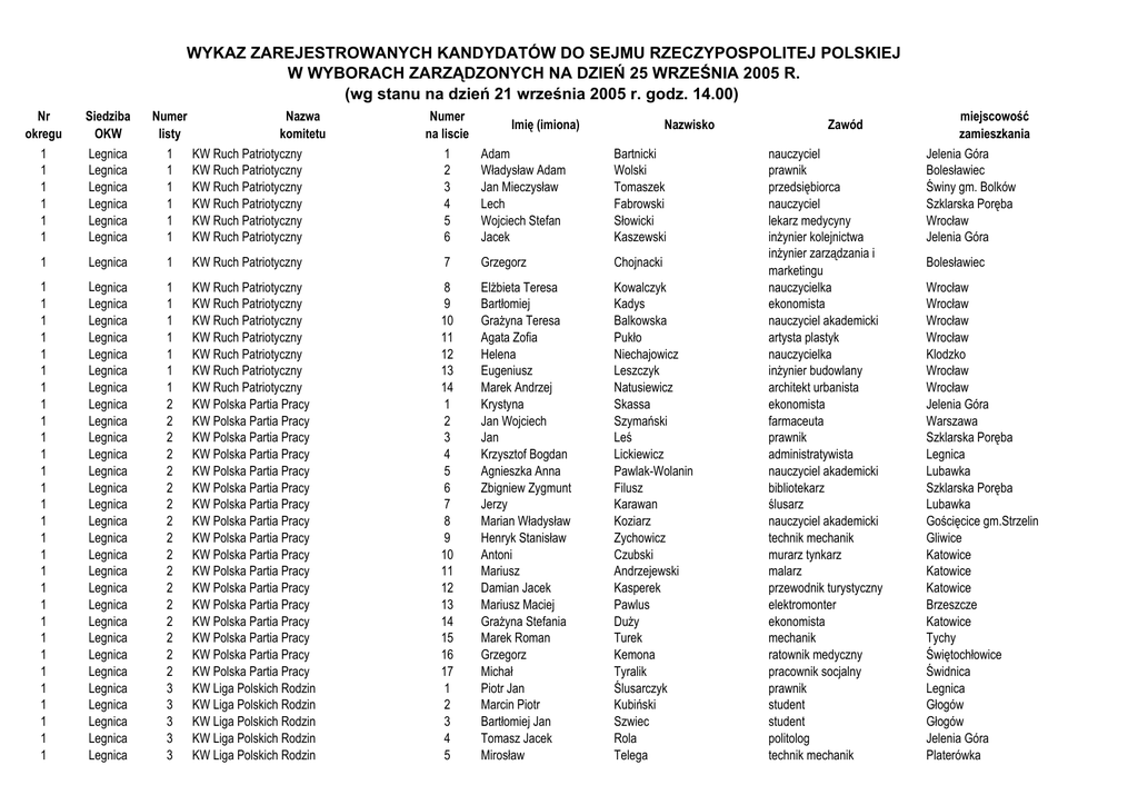WYKAZ ZAREJESTROWANYCH KANDYDATÓW DO SEJMU RZECZYPOSPOLITEJ POLSKIEJ W WYBORACH ZARZĄDZONYCH NA DZIEŃ 25 WRZEŚNIA 2005 R. (wg stanu na dzień 21 września 2005 r. godz. 14.00) Nazwa komitetu KW Ruch Patriotyczny KW Ruch Patriotyczny KW Ruch Patriotyczny KW Ruch Patriotyczny KW Ruch Patriotyczny KW Ruch Patriotyczny Nr okregu 1 1 1 1 1 1 Siedziba OKW Legnica Legnica Legnica Legnica Legnica Legnica Numer listy 1 1 1 1 1 1 1 Legnica 1 KW Ruch Patriotyczny 1 1 1 1 1 1 1 1 1 1 1 1 1 1 1 1 1 1 1 1 1 1 1 1 1 1 1 1 1 Legnica Legnica Legnica Legnica Legnica Legnica Legnica Legnica Legnica Legnica Legnica Legnica Legnica Legnica Legnica Legnica Legnica Legnica Legnica Legnica Legnica Legnica Legnica Legnica Legnica Legnica Legnica Legnica Legnica 1 1 1 1 1 1 1 2 2 2 2 2 2 2 2 2 2 2 2 2 2 2 2 2 3 3 3 3 3 KW Ruch Patriotyczny KW Ruch Patriotyczny KW Ruch Patriotyczny KW Ruch Patriotyczny KW Ruch Patriotyczny KW Ruch Patriotyczny KW Ruch Patriotyczny KW Polska Partia Pracy KW Polska Partia Pracy KW Polska Partia Pracy KW Polska Partia Pracy KW Polska Partia Pracy KW Polska Partia Pracy KW Polska Partia Pracy KW Polska Partia Pracy KW Polska Partia Pracy KW Polska Partia Pracy KW Polska Partia Pracy KW Polska Partia Pracy KW Polska Partia Pracy KW Polska Partia Pracy KW Polska Partia Pracy KW Polska Partia Pracy KW Polska Partia Pracy KW Liga Polskich Rodzin KW Liga Polskich Rodzin KW Liga Polskich Rodzin KW Liga Polskich Rodzin KW Liga Polskich Rodzin Numer na liscie 1 2 3 4 5 6 Imię (imiona) Nazwisko Adam Władysław Adam Jan Mieczysław Lech Wojciech Stefan Jacek Bartnicki Wolski Tomaszek Fabrowski Słowicki Kaszewski 7 Grzegorz Chojnacki 8 9 10 11 12 13 14 1 2 3 4 5 6 7 8 9 10 11 12 13 14 15 16 17 1 2 3 4 5 Elżbieta Teresa Bartłomiej Grażyna Teresa Agata Zofia Helena Eugeniusz Marek Andrzej Krystyna Jan Wojciech Jan Krzysztof Bogdan Agnieszka Anna Zbigniew Zygmunt Jerzy Marian Władysław Henryk Stanisław Antoni Mariusz Damian Jacek Mariusz Maciej Grażyna Stefania Marek Roman Grzegorz Michał Piotr Jan Marcin Piotr Bartłomiej Jan Tomasz Jacek Mirosław Kowalczyk Kadys Balkowska Pukło Niechajowicz Leszczyk Natusiewicz Skassa Szymański Leś Lickiewicz Pawlak-Wolanin Filusz Karawan Koziarz Zychowicz Czubski Andrzejewski Kasperek Pawlus Duży Turek Kemona Tyralik Ślusarczyk Kubiński Szwiec Rola Telega Zawód nauczyciel prawnik przedsiębiorca nauczyciel lekarz medycyny inżynier kolejnictwa inżynier zarządzania i marketingu nauczycielka ekonomista nauczyciel akademicki artysta plastyk nauczycielka inżynier budowlany architekt urbanista ekonomista farmaceuta prawnik administratywista nauczyciel akademicki bibliotekarz ślusarz nauczyciel akademicki technik mechanik murarz tynkarz malarz przewodnik turystyczny elektromonter ekonomista mechanik ratownik medyczny pracownik socjalny prawnik student student politolog technik mechanik miejscowość zamieszkania Jelenia Góra Bolesławiec Świny gm. Bolków Szklarska Poręba Wrocław Jelenia Góra Bolesławiec Wrocław Wrocław Wrocław Wrocław Klodzko Wrocław Wrocław Jelenia Góra Warszawa Szklarska Poręba Legnica Lubawka Szklarska Poręba Lubawka Gościęcice gm.Strzelin Gliwice Katowice Katowice Katowice Brzeszcze Katowice Tychy Świętochłowice Świdnica Legnica Głogów Głogów Jelenia Góra Platerówka Nazwa Numer listy komitetu 3 KW Liga Polskich Rodzin 3 KW Liga Polskich Rodzin Numer Imię (imiona) na liscie 6 Krzysztof 7 Wojciech Dominik Nr okregu 1 1 Siedziba OKW Legnica Legnica 1 Legnica 3 KW Liga Polskich Rodzin 8 1 1 1 1 1 1 1 1 1 1 1 1 1 1 1 1 1 1 1 1 1 1 1 1 1 1 1 1 1 1 1 1 1 Legnica Legnica Legnica Legnica Legnica Legnica Legnica Legnica Legnica Legnica Legnica Legnica Legnica Legnica Legnica Legnica Legnica Legnica Legnica Legnica Legnica Legnica Legnica Legnica Legnica Legnica Legnica Legnica Legnica Legnica Legnica Legnica Legnica 3 3 3 3 3 3 3 3 3 3 3 3 3 3 3 3 4 4 4 4 4 4 4 4 4 4 4 4 4 4 4 4 4 KW Liga Polskich Rodzin KW Liga Polskich Rodzin KW Liga Polskich Rodzin KW Liga Polskich Rodzin KW Liga Polskich Rodzin KW Liga Polskich Rodzin KW Liga Polskich Rodzin KW Liga Polskich Rodzin KW Liga Polskich Rodzin KW Liga Polskich Rodzin KW Liga Polskich Rodzin KW Liga Polskich Rodzin KW Liga Polskich Rodzin KW Liga Polskich Rodzin KW Liga Polskich Rodzin KW Liga Polskich Rodzin KW Partii Demokratycznej-demokraci.pl KW Partii Demokratycznej-demokraci.pl KW Partii Demokratycznej-demokraci.pl KW Partii Demokratycznej-demokraci.pl KW Partii Demokratycznej-demokraci.pl KW Partii Demokratycznej-demokraci.pl KW Partii Demokratycznej-demokraci.pl KW Partii Demokratycznej-demokraci.pl KW Partii Demokratycznej-demokraci.pl KW Partii Demokratycznej-demokraci.pl KW Partii Demokratycznej-demokraci.pl KW Partii Demokratycznej-demokraci.pl KW Partii Demokratycznej-demokraci.pl KW Partii Demokratycznej-demokraci.pl KW Partii Demokratycznej-demokraci.pl KW Partii Demokratycznej-demokraci.pl KW Partii Demokratycznej-demokraci.pl 1 Legnica 4 1 1 Legnica Legnica 4 5 Nazwisko Zawód miejscowość zamieszkania Skorobogaty Zimirski ekonomista informatyk Lubin Bolesławiec Robert Mariusz Brzozowski teolog Godziszowa gm.Mściwojów 9 10 11 12 13 14 15 16 17 18 19 20 21 22 23 24 1 2 3 4 5 6 7 8 9 10 11 12 13 14 15 16 17 Zbigniew Piotr Ryszard Mieczysław Krystyn Adam Wiesław Mariusz Zygmunt Kazimierz Jarosław Michał Marcin Tomasz Kamil Szymon Anna Monika Natalia Barbara Monika Magdalena Barbara Grażyna Teresa Tomasz Krzysztof Jacek Piotr Bożena Jan Radosław Artur Krystyna Ryszard Stanisław Zbigniew Andrzej Jan Adam Tomasz Krzysztof Michał Władysław Tadeusz Ernest Arkadiusz Adam Tadeusz Marta Monika Tomasz Jakub Jerzy Waldemar Leszek Antoni Woźny Lisiewicz Kostrowicki Wierzbicki Nowaczyk Oliwa Tarnowski Kołodziej Kopeć Zabłocka Markiewicz Jacewicz Sulowska Trybulska Ardelli Blicharski Borys Czekańska-Smykalla Cołokidzi Pluciński Barcik Kabat Zalewski Wysocki Żarczyński Buszewicz Polak Kłósek Kończak Pilecka-Lalewicz Buganik Rę