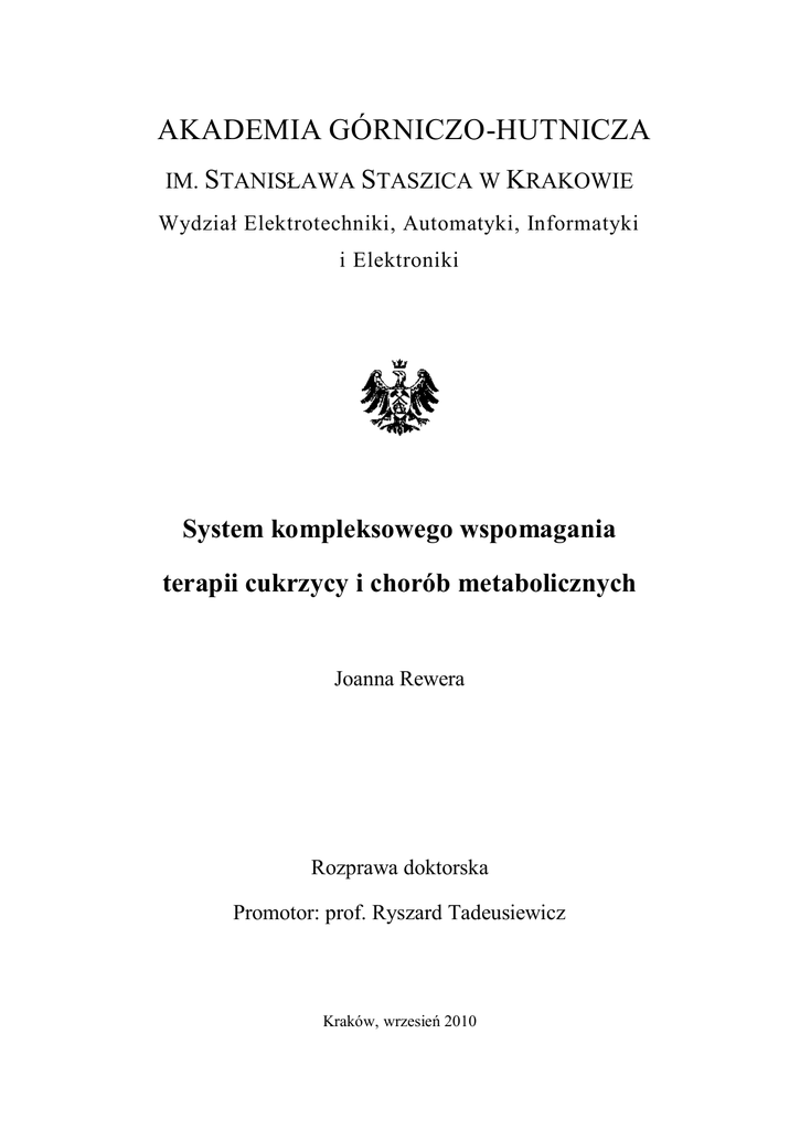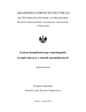 AKADEMIA GÓRNICZO-HUTNICZA IM. STANISŁAWA STASZICA W KRAKOWIE Wydział Elektrotechniki, Automatyki, Informatyki i Elektroniki System kompleksowego wspomagania terapii cukrzycy i chorób metabolicznych Joanna Rewera Rozprawa doktorska Promotor: prof. Ryszard Tadeusiewicz Kraków, wrzesień 2010 Karmapa Czienno Joanna Rewera System kompleksowego wspomagania terapii cukrzycy i chorób metabolicznych Spis treści SPIS TREŚCI ............................................................................................................................................................. 3 OBJAŚNIENIA SKRÓTÓW NAZW I POJĘĆ UŻYTYCH W PRACY.................................................................. 6 1. WPROWADZENIE I CEL ROZPRAWY ........................................................................................................ 7 1.1. TERAPIA CUKRZYCY JAKO ZŁOŻONY PROCES DYNAMICZNY ........................................................................... 7 1.2. KOMPUTEROWO WSPOMAGANA TERAPIA CUKRZYCY ..................................................................................... 8 1.2.1. 1.3. 2. Przegląd dostępnych systemów komputerowych wspomagających terapię cukrzycy ............................ 10 MODELE METABOLICZNE W ZASTOSOWANIACH KLINICZNYCH ..................................................................... 11 1.3.1. Możliwości predykcji stężenia glukozy z pomocą modeli .................................................................... 11 1.3.2. Modele symulacyjne w zastosowaniach edukacyjnych ........................................................................ 11 1.3.3. Modele w analizie diety cukrzycowej ................................................................................................. 12 1.4. CEL PRACY ................................................................................................................................................ 12 1.5. STRUKTURA PRACY .................................................................................................................................... 14 KOMPUTEROWE WSPOMAGANIE TERAPII CUKRZYCY Z WYKORZYSTANIEM MODELI METABOLICZNYCH ............................................................................................................................................ 17 2.1. CUKRZYCA I METABOLIZM WĘGLOWODANÓW W UJĘCIU MATEMATYCZNYM ................................................ 17 2.2. PRZEGLĄD DOSTĘPNYCH ROZWIĄZAŃ TELEMEDYCZNYCH DEDYKOWANYCH DLA DIABETYKÓW, BAZUJĄCYCH NA MODELACH SYMULACYJNYCH ....................................................................................................... 22 2.2.1. 2.2.1.1. Ocena insulinooporności na podstawie modeli symulacyjnych ....................................................................... 22 2.2.1.2. Edukacja z wykorzystaniem interaktywnych modeli symulacyjnych .............................................................. 24 2.2.1.3. Teleedukacja w cukrzycy .............................................................................................................................. 24 2.2.2. 2.3. Podział i zastosowania systemów ...................................................................................................... 22 Przegląd i porównanie systemów....................................................................................................... 26 PRZYJĘTE ZAŁOŻENIA I WYMAGANIA WOBEC MODELU SYMULACYJNEGO ORAZ SYSTEMU TELEMEDYCZNEGO GIGISIM .................................................................................................................................. 29 2.3.1. 3. Wymagania i oczekiwania użytkowników wobec wspomaganej komputerowo terapii cukrzycy............ 29 WYBÓR I ADAPTACJA MODELU SYMULACYJNEGO DLA SYSTEMU GIGISIM DO ZASTOSOWAŃ EDUKACYJNYCH ............................................................................................................... 32 3.1. WYBÓR MODELI DO ZASTOSOWAŃ SYMULACYJNYCH .................................................................................. 32 3.1.1. Rozważane modele glukoza-insulina.................................................................................................. 32 3.1.2. Model A ............................................................................................................................................ 35 3.1.3. Model B ............................................................................................................................................ 36 3.1.4. Model C............................................................................................................................................ 37 Akademia Górniczo-Hutnicza 3 Joanna Rewera 3.1.5. 3.2. Wstępne modyfikacje dla modeli A, B i C........................................................................................... 38 3.1.5.1. Konwersje jednostek .................................................................................................................................... 38 3.1.5.2. Określenie prawidłowych wartości brzegowych dla wyników ........................................................................ 39 SYMULACJE PODSTAWOWE ......................................................................................................................... 39 3.2.1.1. 3.3. System kompleksowego wspomagania terapii cukrzycy i chorób metabolicznych Weryfikacja wyniku testu OGTT – modele A, B i C ...................................................................................... 40 ALGORYTMY SYMULACJI WPŁYWU WYBRANYCH ASPEKTÓW TERAPII CUKRZYCY ......................................... 45 3.3.1. Definicja problemu ........................................................................................................................... 45 3.3.2. Modelowanie wpływu wysiłku fizycznego na dynamikę glukozy i insuliny ........................................... 45 3.3.2.1. Wpływ wysiłku f