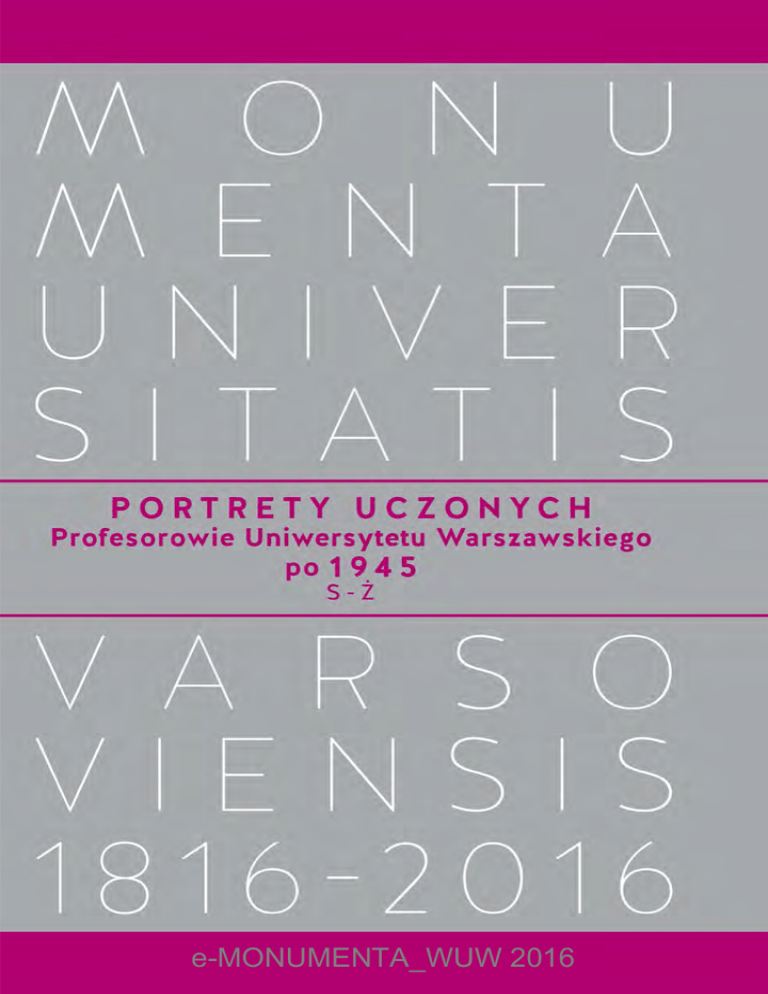 e-MONUMENTA_WUW 2016 e-MONUMENTA_WUW 2016 e-MONUMENTA_WUW 2016 Zespół Rektorski ds. Wydawnictw Jubileuszowych dr hab. Waldemar Baraniewski Wydział Historyczny UW/ Wydział Zarządzania Kulturą Wizualną ASP prof. dr hab. Tomasz Kizwalter Wydział Historyczny UW dr hab. Piotr M. Majewski Wydział Historyczny UW prof. dr hab. Piotr Salwa Wydział „Artes Liberales” UW prof. dr hab. Henryk Samsonowicz Wydział Historyczny UW prof. dr hab. Wojciech Tygielski – przewodniczący Wydział Historyczny UW prof. dr hab. Marek Wąsowicz Wydział Prawa i Administracji UW prof. dr hab. Andrzej Wydział Fizyki UW Kajetan Wróblewski e-MONUMENTA_WUW 2016 Szanowni Państwo! Drodzy Czytelnicy! W 2016 roku będziemy obchodzić jubileusz dwóchsetlecia Uniwersytetu Warszawskiego. Nasz Uniwersytet nie jest jedynie wyższą szkołą, nie jest tylko pracownią uczonych – to środowisko, którego działania w ciągu dwóch wieków polskiej historii stanowiły istotny wkład do wiedzy, kultury, myśli ludzkiej. Z okazji jubileuszu powstaje seria wydawnicza Monumenta Universitatis Varsoviensis, w której opisujemy dzieje i dorobek naszej Uczelni oraz przypominamy sylwetki jej najwybitniejszych profesorów. W syntetycznej formie przedstawiamy również losy oraz architekturę budynków Uniwersytetu, a także zbiory i kolekcje, które są w naszym posiadaniu oraz nad którymi przyszło nam sprawować pieczę. Nie zabraknie też dokumentów ilustrujących różne sfery społecznego oddziaływania Uczelni, a także świadectw życia codziennego naszej społeczności. Kolejne tomy ukazywać się będą sukcesywnie, od roku 2016. Mamy nadzieję, że spotkają się z Państwa życzliwym przyjęciem i wzbudzą zainteresowanie. Gaudeamus igitur! Katarzyna Chałasińska-Macukow Rektor Uniwersytetu Warszawskiego w latach 2005–2012 Marcin Pałys Rektor Uniwersytetu Warszawskiego Warszawa, 19 listopada 2012 r. e-MONUMENTA_WUW 2016 Monumenta Universitatis Varsoviensis 1816–2016 Dzieje Uniwersytetu Warszawskiego 1816–1915 Dzieje Uniwersytetu Warszawskiego 1915–1945 Dzieje Uniwersytetu Warszawskiego po 1945 PORTRETY UCZONYCH Profesorowie Uniwersytetu Warszawskiego 1816–1915 PORTRETY UCZONYCH Profesorowie Uniwersytetu Warszawskiego 1915–1945 (A–Ł) Poczet Rektorów Uniwersytetu Warszawskiego Gmachy Uniwersytetu Warszawskiego Uniwersytet Warszawski i fotografia 1839–1921 Ludzie, miejsca, wydarzenia Nauki humanistyczne na Uniwersytecie Warszawskim Nauki społeczne na Uniwersytecie Warszawskim PORTRETY UCZONYCH Profesorowie Uniwersytetu Warszawskiego 1915–1945 (M–Ż) Biblioteka Uniwersytecka w Warszawie 1817–2017 Miscellanea PORTRETY UCZONYCH Profesorowie Uniwersytetu Warszawskiego po 1945 (A–K) Nauki ścisłe i przyrodnicze na Uniwersytecie Warszawskim PORTRETY UCZONYCH Profesorowie Uniwersytetu Warszawskiego po 1945 (L–R) PORTRETY UCZONYCH Profesorowie Uniwersytetu Warszawskiego po 1945 (S–Ż) e-MONUMENTA_WUW 2016 PORTRETY UCZONYCH Profesorowie Uniwersytetu Warszawskiego po 1945 S–Ż Monumenta Universitatis Varsoviensis 1816–2016 WA R S Z AWA 2 0 1 6 e-MONUMENTA_WUW 2016 Redaktorzy naukowi Waldemar Baraniewski Wojciech Tygielski Andrzej Kajetan Wróblewski Dyrektor WUW Anna Szemberg Redaktor Naczelny WUW Anna Kħdziorek Redaktor prowadzČcy WUW Beata Jankowiak-Konik Redakcja Marta Nazarczuk-Bųoŷska Marta Wiliŷska Korekta Anna Parcheta Urszula Gogol Indeks Krystyna Komorowska Projekt graficzny serii Marcin Wųadyka /Studio Headme© Konsultacja graficzna Krzysztof Stefaniuk Projekt stron tytuųowych Krzysztof Stefaniuk Koordynator produkcji Martyna Choųuj Skųad i ųamanie Marcin SzczeƑniak ISBN 978-83-235-1791-7 (MUV) ISBN 978-83-235-2158-7 (Portrety Uczonych po 1945) ISBN 978-83-235-2085-6 (S–) © Copyright by Wydawnictwa Uniwersytetu Warszawskiego Warszawa 2016 Wydawnictwa Uniwersytetu Warszawskiego 00-497 Warszawa ul. Nowy _wiat 4 e-mail: [email protected] Ksiħgarnia internetowa www.wuw.pl Wydanie 1 Druk i oprawa POZKAL Wydawnictwa UW dziħkujČ Narodowemu Archiwum Cyfrowemu za bezpųatne udostħpnienie zdjħđ e-MONUMENTA_WUW 2016 SPIS TREŚCI ( P IOTR BIEL IŃ SK I) 10 ANNA SADURSKA 1924–2004 20 JAN SAMSONOWICZ 1888–1959 36 ARTUR SANDAUER 1913–1989 48 JAKUB SAWICKI 1899–1979 56 ADAM SCHAFF 1913–2006 66 MARGARET SCHLAUCH 1898–1986 76 MICHAŁ SCZANIECKI 1910–1977 88 MŚCIWÓJ SEMERAU-SIEMIANOWSKI 1885–1953 98 DAVID SHUGAR 1915–2015 (MICH A Ł SZULCZEWSK I) ( TOMA SZ WROCZYŃSK I) ( ANDRZEJ ZA K RZEWSK I) ( J ERZY SZACK I) (MA ŁGORZATA GRZEGORZEWSK A ) (K ATA RZYNA SÓJK A -ZIEL IŃ SK A ) (RYSZA RD W. GRYGLEWSK I) ( RYSZA RD STOL A RSK I) 106 ROMAN SIKORSKI 1920–1983 ( ROMA N DUDA ) 112 GRZEGORZ SINKO 1923–2000 ( MA ŁGORZATA GRZEGORZEWSK A ) 120 ALINA SKIRGIEŁŁO 1911–2007 ( TOMA SZ MA JEWSK I) 128 STANISŁAW SKORUPKA 1906–1988 136 KAZIMIERZ SMULIKOWSKI 1900–1987 146 ANDRZEJ SOŁTAN 1897–1959 154 LEONARD SOSNOWSKI 1911–1986 162 FRANCISZEK STAFF 1885–1966 170 JERZY STAROŚCIAK 1914–1974 180 JULIUSZ STARZYŃSKI 1906–1974 198 WITOLD JAKUB STEFAŃSKI 1891–1973 206 EDWARD STENZ 1897–1956 212 ZDZISŁAW STIEBER 1903–1980 222 KAZIMIERZ STOŁYHWO 1880–1966 230 PIOTR STREBEYKO 1907–2003 ( MA ŁGORZATA WIERZBICK A ) 236 ABDON STRYSZAK 1908–1995 ( TOMA SZ MA JEWSK I) 242 BOGDAN SUCHODOLSKI 1903–1992 258 ROMAN SUSZKO 1919–1979 266 KLEMENS SZANIAWSKI 1925–1990 (A NDRZEJ MA RKOWSK I) (JA N BURCHA RT) ( LUDWIK N ATA NSON) (MA RIA N GRYN BERG) (TOMA SZ MA JEWSK I) ( HUBERT IZDEBSK I) (MA RTA L EŚN IA KOWSK A ) (TOMA SZ MA JEWSK I) ( ROMA N TEISSEYRE) (ZBIGN IEW GREŃ) (AGATA MUSIA Ł) (IRENA WOJN A R) ( M IE CZYSŁAW OMYŁA ) (JA N WOL EŃSK I, JACEK H OŁÓWK A ) e-MONUMENTA_WUW 2016 (K A ROL SAUERL A N D) 278 ELIDA MARIA SZAROTA 1904–1994 294 WŁADYSŁAW LUDWIK SZENAJCH 1879–1964 304 ZOFIA SZMYDTOWA 1893–1977 312 STEFAN SZULC 1881–1956 322 ZDZISŁAW SZYMAŃSKI 1926–1999 (JA N USZ DĄ BROWSK I) 328 STANISŁAW ŚLIWIŃSKI 1887