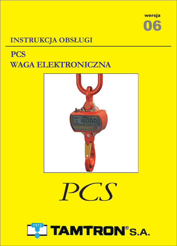 wersja 06 INSTRUKCJA OBSŁUGI PCS WAGA ELEKTRONICZNA PCS INSTRUKCJA OBSŁUGI WAGI PCS Tamtron S.A. UL.Sobocińkiego 19a 40-687 Katowice Poland Tel. +48 32 202 67 67 Fax +48 32 205-91-91 www.tamtron.com.pl UWAGA Prezentowana tu publikacja nie może w żaden sposób być utożsamiana z gwarancją opisywanych tu wyrobów. Tamtron S.A. nie jest w żaden sposób odpowiedzialna na gruncie niniejszej publikacji za niebezpośrednie gwarancje ani też za właściwość stosowania niniejszego wyposażenia do celów wymaganych przez użytkownika. Ponadto, Tamtron S.A. rezerwuje sobie prawo do dokonywania zmian w niniejszej publikacji jak również zmian odnośnie wyrobów w niej prezentowanych. Tamtron S.A. nie jest zobligowana do powiadamiania o zmianach wyszczególnionych osobno. PCS INSTRUKCJA OBSŁUGI SPIS TREŚCI STRONA 1 WAŻNE (Przeczytaj przed użyciem) .........................................................................4 1.1 Wskazówki dotyczące eksploatacji, transportu i składowania wag ............................5 2 WIADOMOŚCI OGÓLNE .........................................................................................6 3 OPIS DZIAŁANIA WAGI............................................................................................7 3.1 Uruchomienie ...........................................................................................................7 3.1.1 Wyświetlanie zegara, testu wewnętrznego i stanu naładowania akumulatora…........7 3.2 Sterownik na podczerwień ........................................................................................8 3.3 Zerowanie ................................................................................................................8 3.3.1 Akumulator i parametry ładowania ............................................................................8 3.4 Tarowanie .................................................................................................................9 3.5 Tryb pracy brutto lub netto .........................................................................................10 3.5.1 Data ....................................................................................................................…..10 3.6 Podświetlenie wyświetlacza ......................................................................................10 3.7 Wskaźnik przeciążenia .............................................................................................10 3.8 Automatyczne wygaszanie wyświetlacza .................................................................10 3.8.1 Zmiana automatycznego wygaszania wyświetlacza .................................................10 3.9 Kontrola napięcia ładowania .....................................................................................10 3.10 Wyświetlanie wartości maksymalnej ciężaru ważonego............................................10 4 ŁADOWANIE AKUMULATORA .................................................................................11 5 CZYNNOŚCI SERWISOWE .....................................................................................11 5.1 Wiadomości ogólne ..................................................................................................11 5.2 Przechowywanie wagi ..............................................................................................11 5.3 Kalibracja .................................................................................................................11 5.4 Wymiana baterii w sterowniku na podczerwień .........................................................12 5.5 Wymiana akumulatora ..............................................................................................12 5.6 Wymiana bezpiecznika .............................................................................................12 6 DANE TECHNICZNE ................................................................................................13 3 PCS INSTRUKCJA OBSŁUGI 1. WAŻNE (Przeczytaj przed użyciem) Najwyższe dopuszczalne obciążenie, które jest oznaczone na panelu przednim wagi i na naklejce fabrycznej, nie może być przekraczane. Najwyższe dopuszczalne obciążenie jest równe ładunkowi całkowitemu lub sumie TARA + ŁADUNEK. Waga i wyposażenie wagi (zawiesia i hak) muszą być sprawdzane regularnie, jak również urządzenia służące do podnoszenia ładunków. Możliwe zaobserwowane defekty muszą być natychmiast naprawiane. Jeżeli zawiesia, w które wyposażona jest waga są zmieniane, nowe muszą mieć co najmniej taki sam współczynnik bezpieczeństwa jak te oryginalne. Przed użyciem wagi, operator musi zaznajomić się z zasadą działania wagi oraz instrukcją bezpieczeństwa. Waga jest przeznaczona do używania w normalnych warunkach przemysłowych. Waga nie może być używana w warunkach gdzie występują silne pola elektryczne i/lub magnetyczne. Waga wyświetla ciężar ważony w kilogramach. Przed użyciem operator musi znać maksymalne dopuszczalne obciążenie wagi. Pracując z ładunkiem bliskim maksymalnemu dopuszczalnemu obciążeniu, należy unikać gwałtownych ruchów. Maksymalne obciążenie oznacza TARA + ŁADUNEK. Operator musi mieć na głowie hełm w czasie ważenia. Operator i inny personel obsługujący wagę muszą znajdować się w bezpiecznej odległości od miejsca ważenia, aby uniknąć niebezpieczeństwa w wypadku zerwania się przedmiotu ważonego. Waga nie może być używana w czasie ładowania akumulatora. Waga musi być ładowana w suchym miejscu w temperaturze pokojowej. Ładowarka zawiera elementy pod napięciem, które nie mogą być dotykane. Stan techniczny zawiesi, w które wyposażona jest waga musi być sprawdzany każdorazowo przed ich użyciem. Jeżeli ogniwo, szekle, przetwornik tensometryczny, łącznik haka, trzpień zabezpieczenia zamknięcia haka lub hak wyglądają na zużyte lub uszkodzone, nie należy dopuścić do użycia wagi. Ogl