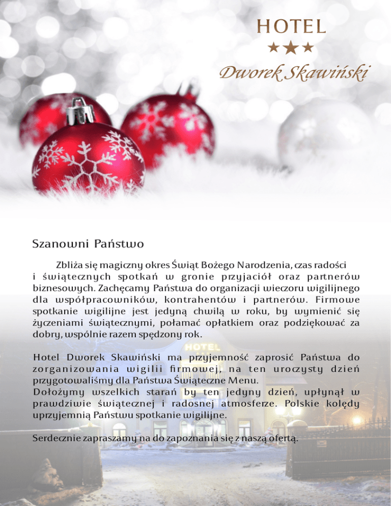 HOTEL Dworek Skawiński Szanowni Państwo Zbliża się maginy okres Świąt Bożego Narodzenia, as radości i świątenych otkań w gronie pyjaciół oraz panerów biznesowych. Zachęcamy Państwa do organizacji wieoru wigilijnego dla wółpracowników, kontrahentów i panerów. Firmowe otkanie wigilijne jest jedyną chwilą w roku, by wymienić się żyeniami świątenymi, połamać opłatkiem oraz podziękować za dobry, wólnie razem ędzony rok. Hotel Dworek Skawiński ma pyjemność zaprosić Państwa do zorganizowania wigilii firmowej, na ten uroysty dzień pygotowaliśmy dla Państwa Świątene Menu. Dołożymy wszelkich starań by ten jedyny dzień, upłynął w prawdziwie świątenej i radosnej atmosfee. Polskie kolędy upyjemnią Państwu otkanie wigilijne. Serdenie zapraszamy na do zapoznania się z naszą ofeą. Propozycje menu wigilijnego Pystawki: (1 do wyboru) Śledź w marynacie wigilijnej Krokiet z jajkiem i gybami Pierogi kapustą i gybami na sosie gybowym, Zupy: (1 do wyboru) Barsz erwony z uszkami Zupa gybowa z łazankami Żur z gybami i ziemniakami Dania główne: (1 do wyboru) Panierowane fileciki z karpia z ziemniakami po polsku i surówką z kiszonej kapusty Dorsz w sosie koperkowym z ziemniakami puree oraz zestawem surówek Schab ze śliwką w sosie naturalnym z ziemniakami puree i surówką z marchwi Deser: (1 do wyboru) Rolada makowa Sernik z polewą ekoladową Kutia Napoje: Kompot Woda niegazowana Ceny menu: pystawka, zupa, danie główne, deser, napoje: 60,00 zł / os. zupa, danie główne, deser, napoje: 50,00 zł / os. zupa, danie główne, napoje lub danie główne, deser, napoje: 40,00 zł / os. Zimna płyta: Sałatka z porów serem i szynką Sałatka jaynowa Rolada drobiowa z suszonymi owocami Galaretka wiepowa Śledź w oleju Mix wędlin Pieywo Lampka wina do kolacji: Eada Negra, Hiszpania, pół wytrawne Cena zimnej płyty: 38,00 zł/os. HOTEL Dworek Skawiński ZAPRASZAMY DO WSPÓŁPRACY W razie jakichkolwiek pytań proszę o kontakt. Anna Boroń Kom: 889-546-003 Tel: 12 276-85-70 Fax: 12 276-03-45 [email protected] www.dworek-skawinski.pl