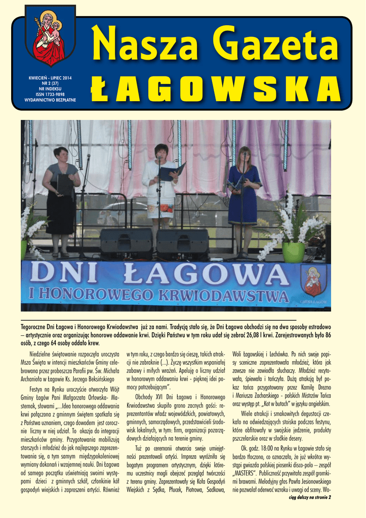 Nasza Gazeta KWIECIEŃ - LIPIEC 2014 NR 2 (37) NR INDEKSU ISSN 1733-9898 WYDAWNICTWO BEZPŁATNE ŁAGOWSKA Tegoroczne Dni Łagowa i Honorowego Krwiodawstwa już za nami. Tradycją stało się, że Dni Łagowa obchodzi się na dwa sposoby estradowo – artystycznie oraz organizując honorowe oddawanie krwi. Dzięki Państwu w tym roku udał się zebrać 26,08 l krwi. Zarejestrowanych było 86 osób, z czego 64 osoby oddało krew. Niedzielne świętowanie rozpoczęła uroczysta Msza Święta w intencji mieszkańców Gminy celebrowana przez proboszcza Parafii pw. Św. Michała Archanioła w Łagowie Ks. Jerzego Beksińskiego Festyn na Rynku uroczyście otworzyła Wójt Gminy Łagów Pani Małgorzata Orłowska- Masternak, słowami „...Idea honorowego oddawania krwi połączona z gminnym świętem spotkała się z Państwa uznaniem, czego dowodem jest corocznie liczny w niej udział. To okazja do integracji mieszkańców gminy. Przygotowania mobilizują starszych i młodzież do jak najlepszego zaprezentowania się, a tym samym międzypokoleniowej wymiany dokonań i wzajemnej nauki. Dni Łagowa od samego początku uświetniają swoimi występami dzieci z gminnych szkół, członkinie kół gospodyń wiejskich i zaproszeni artyści. Również w tym roku, z czego bardzo się cieszę, takich atrakcji nie zabraknie (...). Życzę wszystkim wspaniałej zabawy i miłych wrażeń. Apeluję o liczny udział w honorowym oddawaniu krwi - pięknej idei pomocy potrzebującym”. Obchody XVI Dni Łagowa i Honorowego Krwiodawstwa skupiło grono zacnych gości: reprezentantów władz wojewódzkich, powiatowych, gminnych, samorządowych, przedstawicieli środowisk lokalnych, w tym: firm, organizacji pozarządowych działających na terenie gminy. Tuż po ceremonii otwarcia swoje umiejętności prezentowali artyści. Impreza wyróżniła się bogatym programem artystycznym, dzięki któremu uczestnicy mogli obejrzeć przegląd twórczości z terenu gminy. Zaprezentowały się Koła Gospodyń Wiejskich z Sędka, Płucek, Piotrowa, Sadkowa, Woli Łagowskiej i Lechówka. Po nich swoje popisy sceniczne zaprezentowała młodzież, która jak zawsze nie zawiodła słuchaczy. Młodzież recytowała, śpiewała i tańczyła. Dużą atrakcją był pokaz tańca przygotowany przez Kamilę Drezno i Mariusza Zacharskiego - polskich Mistrzów Tańca oraz występ pt. „Kot w butach” w języku angielskim. Wiele atrakcji i smakowitych degustacji czekało na odwiedzających stoiska podczas festynu, które obfitowały w swojskie jedzenie, produkty pszczelarskie oraz w słodkie desery. Ok. godz. 18:00 na Rynku w Łagowie stało się bardzo tłoczono, co oznaczało, że już wkrótce wystąpi gwiazda polskiej piosenki disco-polo – zespół „MASTERS”. Publiczność przywitała zespół gromkimi brawami. Melodyjny głos Pawła Jesionowskiego nie pozwalał oderwać wzroku i uwagi od sceny. Wociąg dalszy na stronie 2 „Śpiewali polskie piosenki” Ponad 60 młodych wokalistów z terenu gminy Łagów i gmin sąsiednich zmierzyło się z rodzimą muzyką rozrywkową podczas I Festiwalu Polskiej Piosenki o „Złotą Nutkę”, który odbył się 15 czerwca 2014 r. w Łagowie. Festiwal został zorganizowany wspólnie przez Wójta Gminy Łagów oraz Dyrektora Gminnego Zespołu Szkół w Łagowie. kalista bawił również publiczność poprzez włączenie jej do wspólnej zabawy. Wieczorny czas upłynął przy muzyce zespołu „K2” z Kielc. Serdeczne podziękowanie organizatorzy składają sponsorom, którzy wsparli organizację imprezy: • „Budromost” Starachowice • Przedsiębiorstwo Techniczno-Produkcyjne „EKWOD” Sp. z o.o • Bank Spółdzielczy w Ostrowcu Św. • Zakład Robót Inżynieryjno-Transportowych WOD-GAZ • „GEORYT” Krzysztof Witkowski • Kamieniołomy Świętokrzyskie Sp. z o.o • Przedsiębiorstwo Handlowo-Usługowe „Zieliński” • GMC Staszów • PKS w Ostrowcu Św. • „U misia” wulkanizacja i myjnia samochodowa Pogoda dopisała, humory również, więc pozostaje powiedzieć: „Do zobaczenia za rok!” A. Kędziora Uczestników festiwalu oceniało jury w składzie: Pani Małgorzata Orłowska-Masternak Wójt Gminy Łagów, Pani Elżbieta Ginał Dyrektor Szkoły Podstawowej w Zbelutce, Pani Małgorzata Bęben Dyrektor Szkoły Podstawowej w Piotrowie, Pani Barbara Goliat członkini Chóru Kościelnego w Łagowie oraz Pan Wiesław Nawrocki Dyrektor Gminnego Zespołu Szkół w Łagowie. Przy ocenie występów uczestników komisja konkursowa brała pod uwagę m.in. dobór repertuaru, poprawność intonacji i ogólne wrażenie artystyczne. Swoje możliwości wokalne uczniowie mogli zaprezentować występując solo, w duetach lub w zespołach. Zadaniem uczestników było wykonanie wybranej piosenki polskiej przy akompaniamencie instrumentalnym lub do nagranego podkładu. Uczniowie przedstawiali własne interpretacje piosenek z gatunku szeroko pojętej muzyki rozrywkowej – wśród nich znalazły się zarówno hity sprzed lat (z repertuaru m.in. Edyty Geppert) jak i przeboje współczesnych gwiazd sceny mu- zycznej (m.in. Sylwii Grzeszczak). Występy były dobrze przygotowane, a młodzi wokaliści włożyli niezwykle dużo serca w wykonanie wybranej przez siebie polskiej piosenki. Ostatecznie „Złotę Nutki” trafiły do: I miejsce – Aleksandra Herbuś z piosenką „Mam tę moc”, II miejsce – Roksana Miechowicz „ Piosenka Księżycowa”, III miejsce – Izabela Sławska „Szukaj mnie”. Przyznano także kilka wyróżnień, które odebrały: Katarzyna Miller, Agata Wróbel, Patrycja Wiącek, Emilia Haba, Weronika Kiciok, Zuzanna Bera, Jakub Duda, Paulina Cisak, Katarzyna Dudek. Osoby wyróżnione dostały dodatkowo szansę zaprezentowania się podczas Gminnych Dożynek 2014 r. Wszystkim uczestnikom Festiwalu gratulujemy i zapraszamy do wzięcia udziału w następnym! A. Kędziora SUKCES ZESPOŁU TEATRALNEGO „MAŁY ARLEKIN” Z ŁAGOWA Po raz czwarty zespół teatralny
