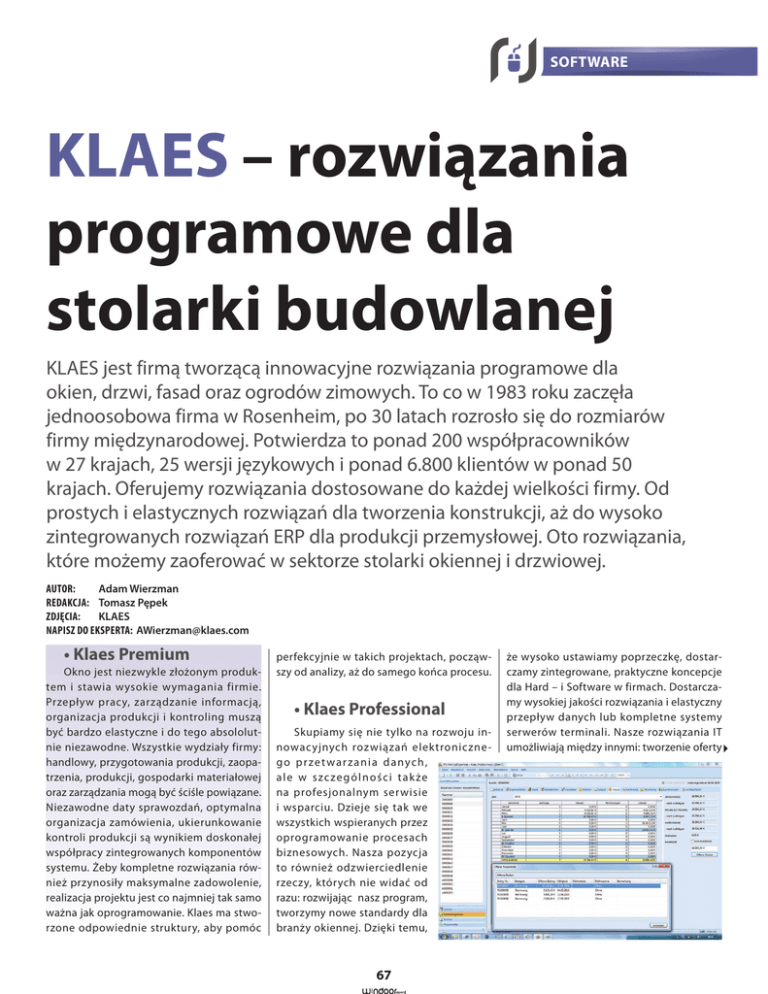 SOFTWARE KLAES – rozwiązania programowe dla stolarki budowlanej KLAES jest firmą tworzącą innowacyjne rozwiązania programowe dla okien, drzwi, fasad oraz ogrodów zimowych. To co w 1983 roku zaczęła jednoosobowa firma w Rosenheim, po 30 latach rozrosło się do rozmiarów firmy międzynarodowej. Potwierdza to ponad 200 współpracowników w 27 krajach, 25 wersji językowych i ponad 6.800 klientów w ponad 50 krajach. Oferujemy rozwiązania dostosowane do każdej wielkości firmy. Od prostych i elastycznych rozwiązań dla tworzenia konstrukcji, aż do wysoko zintegrowanych rozwiązań ERP dla produkcji przemysłowej. Oto rozwiązania, które możemy zaoferować w sektorze stolarki okiennej i drzwiowej. AUTOR: Adam Wierzman REDAKCJA: Tomasz Pępek ZDJĘCIA: KLAES NAPISZ DO EKSPERTA: [email protected] • Klaes Premium Okno jest niezwykle złożonym produktem i stawia wysokie wymagania firmie. Przepływ pracy, zarządzanie informacją, organizacja produkcji i kontroling muszą być bardzo elastyczne i do tego absololutnie niezawodne. Wszystkie wydziały firmy: handlowy, przygotowania produkcji, zaopatrzenia, produkcji, gospodarki materiałowej oraz zarządzania mogą być ściśle powiązane. Niezawodne daty sprawozdań, optymalna organizacja zamówienia, ukierunkowanie kontroli produkcji są wynikiem doskonałej współpracy zintegrowanych komponentów systemu. Żeby kompletne rozwiązania również przynosiły maksymalne zadowolenie, realizacja projektu jest co najmniej tak samo ważna jak oprogramowanie. Klaes ma stworzone odpowiednie struktury, aby pomóc perfekcyjnie w takich projektach, począwszy od analizy, aż do samego końca procesu. • Klaes Professional Skupiamy się nie tylko na rozwoju innowacyjnych roz wiązań elektroniczne g o p r z e t w a r z a n i a d a nyc h , ale w szczególności także na profesjonalnym ser wisie i wsparciu. Dzieje się tak we wszystkich wspieranych przez oprogramowanie procesach biznesowych. Nasza pozycja to również odzwierciedlenie rzeczy, których nie widać od razu: rozwijając nasz program, tworzymy nowe standardy dla branży okiennej. Dzięki temu, 67 że wysoko ustawiamy poprzeczkę, dostarczamy zintegrowane, praktyczne koncepcje dla Hard – i Software w firmach. Dostarczamy wysokiej jakości rozwiązania i elastyczny przepływ danych lub kompletne systemy serwerów terminali. Nasze rozwiązania IT umożliwiają między innymi: tworzenie oferty SOFTWARE z dowolnego miejsca na świecie, pracę w wielu językach dzięki modułowi wielojęzykowemu, wygodną wycenę przygotowaną bezpośrednio przez partnera handlowego oraz sterowanie maszyn online. • Klaes Vario Firma technicznie zorientowana na produkcję okien potrzebuje rozwiązań dostosowujących się do niej, rozwijających się i zawsze aktualnych. Potrzebny jest program do produkcji okien, który pozwala szybko i łatwo stawiać wszystkie ważne kroki w biurze i produkcji. Klaes Vario jest oprogramowaniem okiennym, umożliwiającym mniejsz ym producentom cieszyć się zaletami korzystania z profesjonalnego oprogramowania. Program dostosowuje się cenowo do wielkości produkcji i sprzedaży firmy i oferuje usługi, które są naprawdę potrzebne. Planowanie, realizacja zleceń i produkcja odbywa się bez strat. Klaes Vario to rozwiązanie dla handlowo zorientowanych mniejszych producentów w branży okiennej. • Elastyczne modele cenowe – uwzględniające aktualny wolumen sprzedaży • Zindywidualizowany wybór funkcji – odpowiednie do rzeczywistego procesu produkcji • Zorientowany na rozwój system modułowy – otwarty na późniejszą rozbudowę • Klaes Trade Każda firma zorientowana na zysk potrzebuje rozwiązań, które pomogą jej w zmaganiu z codziennymi zadaniami. Potrzebuje rozwiązań programowych, które zaspokoją jej potrzeby. Rozwiązań, które zoptymalizują czas i zminimalizują błędy, a tym samym obniżą koszty. Potrzebują rozwiązania, z którym szybko stworzą ofertę, zamówienie i fakturę, które w przyszłości będzie przetwarzać zamówienia 68 pewniej i szybciej. Dzięki któremu będzie mogła automatycznie przejść do zaległych płatności, realizować ważne handlowe kalkulacje i w końcu wspierać korespondencję z dostawcami, architektami i klientami. Oczywiście to rozwiązanie musi być łatwe i przyjazne w obsłudze. Czy Klaes Trade to takie rozwiązanie? Tak. • Klaes E-control Od kilku komputerowych generacji Klaes Professional wspiera połączenia sterowanych komputerowo maszyn produkcyjnych poprzez econtrol. Nasze zespoły programistów blisko współpracują z największymi producentami maszyn, dlatego też nasze interfejsy do poszczególnych maszyn są zawsze aktualne. Niezależnie czy to skomplikowane konstrukcje, rozbudowane projekty na dużą skalę z produkcją seryjną, czy małe serie: wszystko jest możliwe. E-control zapewnia połączenie i jednocześnie wsparcie. Wymagania nowoczesnych zakładów produkcyjnych rosną nieustannie. Dlatego też zoptymalizowany przepływ pracy jest tym, co najważniejsze. Wystarczy wysłać zamówienie produkcyjne poprzez kliknięcie przyciskiem myszki do centrum sterowania Twojego parku maszynowego. Tym samym ostatni element jest na swoim miejscu i optymalizacja staje się faktem. Klaes Professional poprzez E-control zwiększa wydajność maszyn, zachowując jednocześnie wysoką jakość. Począwszy od dostawy, poprzez konstruowanie i planowanie pracy, z przejściem na linię produkcyjną, aż do zarządzania gospodarką materiałową: sterowanie maszyn przez Econtrol jest decydującym czynnikiem w optymalizacji wszystkich procesów produkcyjnych. Także w przyszłości, gdyż Klaes zatrudnia wysokiej klasy inżynierów oraz programistów, którzy już dziś wiedzą jakie maszyny będą dostępne jutro. SOFTWARE • Klaes E-prod • Klaes 3D „Elektroniczna produkcja“ w produkcji okien. Z E-prod dane produkcyjne nie będą już przenoszone na papierze, lecz będę dostę