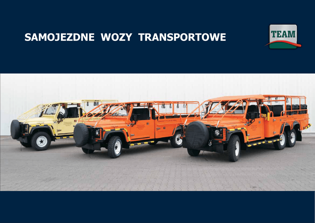 SAMOJEZDNE WOZY TRANSPORTOWE FIRMA Przedsiębiorstwo „TEAM Marek Pasierbski” na rynku motoryzacyjnym działa nieprzerwanie od 1994 roku. Pierwsze pojazdy dla lubińskiego kombinatu miedziowego KGHM (z przeznaczeniem do eksploatacji w podziemnej części kopalń) powstały w 1997 roku. Warunki pracy w chodnikach położonych ponad 1000 m pod ziemią należą do wyjątkowo ciężkich, a składają się na to: - wysoka temperatura - wilgotność - wysokie zasolenie - skaliste podłoże o znacznych różnicach poziomów. W chwili obecnej w polskich kopalniach pracuje ponad 300 tego typu pojazdów w kilkunastu różnych wersjach, przejeżdżając rocznie od kilku do kilkudziesięciu tysięcy kilometrów. CHARAKTERYSTYKA OGÓLNA Samojezdny wóz transportowy zbudowany jest na bazie samochodu terenowego Land Rover Defender 110 lub Defender 130. Pojazd przeznaczony jest do przewozu ludzi oraz transportu środków strzałowych i innych materiałów w niemetanowych wyrobiskach górniczych kopalń rud metali i surowców mineralnych. Aktualnie produkowany typoszereg oznaczony jest symbolem SWT -TEAM 4/10/14/20 gdzie : SWT – oznacza Samojezdny Wóz Transportowy TEAM – element nazwy producenta 4/10/14/20 – ilość przewożonych pracowników W dniu dzisiejszym przedsiębiorstwo „TEAM Marek Pasierbski” jest znaczącym dealerem polskiej sieci Land Rover z wydzielonym oddziałem produkcji pojazdów specjalnych. www.pojazdy-specjalne.pl SWT-TEAM 4 SWT – TEAM 4 pojazd przeznaczony jest do transportu ekip serwisowych (wraz ze sprzętem) oraz dokonywania inspekcji obszarów oddalonych od szybów. PARAMETRY TECHNICZNE Długość ….......................... 4165 Szerokość …....................... 1900 Wysokość …....................... 2100 Rozstaw osi ....................… 2360 Rozstaw kół ...................... 1486 Głębokość brodzenia …......... 500 Minimalny promień skrętu .. 4000 Kąt natarcia …............................. Kąt zejścia ................................. Max kąt najazdu ......................... mm mm mm mm mm mm mm 24° 21° 45° Masa własna pojazdu .................. 2200 kg Ilość przewożonych osób ................. 3 +1 Dopuszczalna masa przewożonych . materiałów .................................... 800 kg PARAMETRY WYROBISKA Pochylenie wzdłużne wyrobiska ............. 8° Pochylenie poprzeczne wyrobiska .......... 5° Min. wysokość wyrobiska ........... 2300 mm Min. szerokość wyrobiska ........... 4000 mm SWT-TEAM 10 PARAMETRY TECHNICZNE Długość ………….............…………...……. 4900 mm Szerokość ……….............……………...…. 1990 mm Wysokość ……….....……………...........…. 2100 mm * Rozstaw osi ……………………..............… 2794 mm Rozstaw kół ……………………..............… 1486 mm Prześwit ..………………………................… 215 mm Głębokość brodzenia ………...........…..... 500 mm Wewnętrzny promień skrętu …........….. 4500 mm Zewnętrzny promień skrętu ……........... 7200 mm Kat najazdu …………………….......................…. 32° Kąt zjazdu ....…………………….............…...…. 21° Max. Kąt pokonywania wzniesień ................. 45° Masa własna pojazdu (łącznie z operatorem) ……………........… 2300 kg Max. obciążenie przedniej osi ……....... 1580 daN Max. obciążenie tylnej osi ………......... 2200 daN Dopuszczalna masa całkowita .…......... 3500 kg PRĘDKOŚĆ JAZDY Przewóz ludzi ……………………….....…. do 25 km/h Holowanie przyczepy ….……………..… do 20 km/h Przewóz środków strzałowych …..…. do 10 km/h PARAMETRY WYROBISKA Pochylenie Pochylenie Minimalna Minimalna * ** *** **** wzdłużne wyrobiska …….............. 8° poprzeczne wyrobiska ……........... 5° wysokość wyrobiska ….….... 2300 mm szerokość wyrobiska …..…. 4400 mm dostępna jest wersja o wysokości 1900 mm dostępna wersja do 15° dostępna wersja do 8° dla wersji o wys. 1900 mm - 2100 mm www.pojazdy-specjalne.pl ZASTOSOWANIE WOZU Do przewozu osób i materiałów: • 9 osób + operator Stopień składany na czas holowania przyczepy ŁADOWNOŚĆ: 1 + 9 osób lub 800 kg K50 TEAM Marek Pasierbski ul. Gen. Stefana Grota-Roweckiego 41 52-219 WROCŁAW www.team.pl lub • 800 kg MW i 100 mb LD w opakowaniach fabrycznych lub • 5000 szt. zapalników w opakowaniach fabrycznych oraz 1 osoba w kabinie kierowcy 25 lub Zaczep holowniczy kulowo-sworzniowy K50/ 25 przyczepy wraz z urządzeniem montażowym dla Defendera 110 • 250 kg MW w puszkach strzałowych lub opakowaniach fabrycznych • 150 szt ZE w naczyniach transportowych oraz max. 4 osoby służby strzałowej i • 100 mb LD w puszkach strzałowych Przegroda składana Uchwyt na ładownice zapalnikowe Do holowania przyczepy: • o masie do 750 kg, bez hamulca najazdowego • o masie od 750 do 1500 kg z hamulcem najazdowym Szakla 3/4" (WWL=4,75 T) - opcja - patrz rys. 25 Blacha gr. 4 mm Stałe fotele - 4 pary (8 miejsc) OPCJE WOZÓW TRANSPORTOWYCH SWT-TEAM 10 SWT-TEAM 10/1,9K przeznaczony jest do transportu ludzi, środków strzałowych oraz innych materiałów w polach niemetanowych i metanowych ze stopniem „a” wybuchu metanu kopalń rud metali i surowców mineralnych. PARAMETRY WYROBISKA W KTÓRYM MOŻE PORUSZAĆ SIĘ WÓZ • Pochylenie wzdłużne wyrobiska - 15° • Pochylenie poprzeczne wyrobiska - 8° • Minimalna wysokość wyrobiska - 2100 mm • Minimalna szerokość wyrobiska - 4000 mm SWT-TEAM 10/1,9 KT wyposażony jest w hydrauliczny dźwig załadunkowy typu TC13C, który został wyprodukowany przez niemiecką firmę ATLAS Maschinen GMBH. Dźwig ten został zabudowany na platformie transportowej w miejsce dwu przednich siedzisk pasażerów, zlokalizowanych tuż za kabiną kierowcy-operatora. Przeznaczony jest do transportu ludzi oraz innych materiałów w polach niemetanowych i metanowych ze
