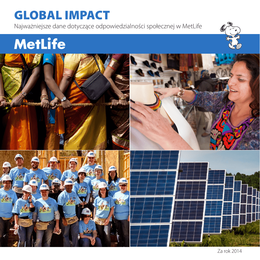 GLOBAL IMPACT Najważniejsze dane dotyczące odpowiedzialności społecznej w MetLife Za rok 2014 Tworzymy wartość, dbamy o rozwój Firma MetLife poszukuje stabilnych, bezpiecznych i zróżnicowanych inwestycji, dzięki którym jest w stanie dotrzymywać dawanych klientom obietnic. W odniesieniu do dokonywanych inwestycji dokładamy starań, aby dopasowywać aktywa do pasywów z myślą o trwale dobrej kondycji i stabilności finansowej. 473,7 mld USD w zarządzanych aktywach* 1,5 mld USD inwestycji w tanie budownictwo mieszkaniowe** 15,4 mld USD inwestycji w obligacje komunalne** 9,1 mld USD inwestycji ekologicznych** 2,9 mld USD inwestycji w projekty pozyskiwania energii ze źródeł odnawialnych od 2003 roku *Według stanu z 31.12.2014. Patrz s. 20 Raportu o postępach Global Impact 2014, gdzie zamieszczono informacje finansowe inne niż zgodne z GAAP, definicje i/lub uzgodnienia. ** Według wartości godziwej Zarządzamy ryzykiem oraz działamy etycznie i uczciwie Od niemal 150 lat MetLife umacnia reputację firmy przestrzegającej najwyższych standardów etycznego postępowania. Nasza kultura opiera się na solidnym nadzorze prowadzonym za pośrednictwem wielu komisji zarządu i kierownictwa wyższego szczebla, programie zarządzania ryzykiem inwestycyjnym, a także zasadach i limitach dotyczących wszystkich istotnych źródeł ryzyka operacyjnego. Dysponujemy też procedurami eskalacji problemów oraz kompleksowej sprawozdawczości dla kierownictwa wyższego szczebla, komisji ds. ryzyka oraz Rady Dyrektorów. Zarządzanie ryzykiem Etyka Uczciwość Nasze wartości PO PIERWSZE KLIENT BĄDŹMY NAJLEPSI UŁATWIAJMY ODNOŚMY SUKCESY RAZEM Koncentrujemy się na klientach Bardzo uważnie analizujemy zgłaszane przez klientów potrzeby, a także prowadzimy pogłębione badania, aby poprawiać jakość każdego ich kontaktu z MetLife. Projektowanie produktów Nasze rozwiązania tworzymy z myślą o unikatowych wyzwaniach i potrzebach występujących na każdym z obsługiwanych przez nas rynków. Zwiększanie dostępności Zdecydowanie poprawiliśmy nasze wskaźniki Net Promoter Score: +183% Poszerzamy dostęp do korzystnie wycenionych produktów i usług na rynkach wschodzących całego świata. Angażowanie pracowników w tworzenie rozwiązań +127% W przypadku nowych nabywców na etapie dokonywania zakupu osiągnęliśmy przeszło dwukrotnie lepszy wynik. Ogółem w ciągu ostatnich trzech lat uzyskaliśmy poprawę o 183%. W przypadku obsługi roszczeń wskaźnik TNPS wzrósł przeszło dwukrotnie — o 127%. Dajemy pracownikom możliwości poszukiwania rozwiązań dla klientów. Inwestycje w obsługę klienta Inwestujemy w ludzi i systemy, aby zapewniać wyjątkową obsługę. +33% W przypadku obsługi klienta przez rok udało nam się poprawić wynik o 33%. Praca w MetLife Chcemy tworzyć środowisko angażujące pracowników, pomagające im w rozwoju umiejętności i talentów, a także doceniające każdą z osób za jej unikatowy wkład oraz doświadczenie wnoszone do naszego globalnego zespołu. Warsztaty „Motywujące przywództwo” 935 przedstawicieli kadry kierowniczej poznawało różne style zarządzania i podejścia do przywództwa. Współpraca jest ważna 4528 przełożonych uczyło się, jak tworzyć wspierające i otwarte środowisko pracy. Rozmowy o karierze 5704 przełożonych uzyskało narzędzia ułatwiające ukierunkowanie rozmów o karierze w celu zwiększenia efektywności rozwoju zespołów. Orientacja na klientów Motywujące przywództwo Zaangażowani pracownicy Z dumą wspieramy siedem zespołów „Różnorodność i współpraca” (Diversity Business Resource Networks, DBRN) grupujących naszych pracowników, którzy w ramach wolontariatu promują świadomość, szacunek oraz współpracę. Geje, lesbijki, biseksualiści, osoby transpłciowe i przyjaciele w MetLife (GLAM) Alumni INROADS i Sieć Wschodzących Liderów (iRISE) Sprawni Inaczej w MetLife (MDA) Sieć Weteranów MetLife (MVET) Globalni, Wielokulturowi, Profesjonalni (GMP) Biznesowa Sieć Kobiet (WBN) Rodziny w MetLife (FAM) Zmieniamy na lepsze Od 1976 r. MetLife Foundation przekazała ponad 670 mln dolarów grantów, aby zmieniać na lepsze życie osób, rodzin i społeczności, którym służymy. W 2013 r. Fundacja MetLife przeznaczyła na promocję włączenia finansowego na świecie ponad 200 milionów dolarów w ciągu pięciu lat. 670 mln USD 200 mln USD Dostęp i wiedza Zwiększanie gotowości, chęci i zdolności rodzin o niskich dochodach do korzystania z usług sektora finansowego. Dostęp do usług Sprzyjanie rozwojowi i zapewnianie finansowych usług oraz produktów wysokiej jakości, takich jak plany oszczędnościowe, ubezpieczenia i kredyty. Dostęp do wniosków z naszych doświadczeń Inwestowanie w badania i dzielenie się doświadczeniami ze społecznością organizacji działających na rzecz włączenia finansowego oraz innymi podmiotami. Ponad 27 mln USD Ponad 13 mln USD grantów udzielonych na świecie od 1976 r. na włączenie finansowe w ciągu pięciu lat. grantów na włączenie finansowe udzielonych w 2014 r. grantów na inne cele udzielonych w 2014 r. Chronimy środowisko Ochronę środowiska postrzegamy w długim horyzoncie czasowym. We wszystkich oddziałach na świecie dążymy do osiągania najważniejszych celów w zakresie ograniczenia poziomów emisji oraz zużycia energii i wody — także w naszym łańcuchu dostaw. Od 2005 r. ograniczyliśmy o 100% pośrednie emisje gazów cieplarnianych z posiadanych i wynajmowanych przez nas biur w Stanach Zjednoczonych dzięki umowom na dostawy energii elektrycznej ze źródeł odnawialnych i zakupom certyfikatów energii odnawialnej. Firma jest oficjalnym uczestnikiem SmartWay Transportation Partnership, programu realizowanego przez amerykańską Agencję Ochrony Środowiska. Wynik 99 w indeksie Carbon Disclosure Project oraz kategoria efektywności „B” za ciągłe doskonalenie. W „Zielonych Rankingach” magazy