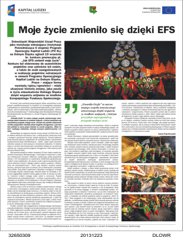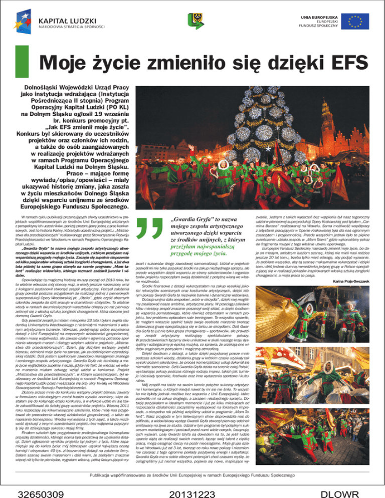 Moje życie zmieniło się dzięki EFS Dolnośląski Wojewódzki Urząd Pracy jako instytucja wdrażająca (Instytucja Pośrednicząca II stopnia) Program Operacyjny Kapitał Ludzki (PO KL) na Dolnym Śląsku ogłosił 19 września br. konkurs promocyjny pt. „Jak EFS zmienił moje życie”. Konkurs był skierowany do uczestników projektów oraz członków ich rodzin, a także do osób zaangażowanych w realizację projektów wdrażanych w ramach Programu Operacyjnego Kapitał Ludzki na Dolnym Śląsku. Prace – mające formę wywiadu/opisu/opowieści – miały ukazywać historię zmiany, jaka zaszła w życiu mieszkańców Dolnego Śląska dzięki wsparciu unijnemu ze środków Europejskiego Funduszu Społecznego. W ramach cyklu publikacji prezentujących efekty uczestnictwa w projektach współfinansowanych ze środków Unii Europejskiej widzianych z perspektywy ich uczestników, poniżej prezentujemy jedną z prac konkursowych. Jest to historia Kariny, która była uczestniczką projektu „Mistrzostwa dla przedsiębiorczych” realizowanego przez Stowarzyszenie Rozwoju Przedsiębiorczości we Wrocławiu w ramach Programu Operacyjnego Kapitał Ludzki. „Gwardia Gryfa” to nazwa mojego zespołu artystycznego utworzonego dzięki wsparciu ze środków unijnych, z którym przeżyłam najwspanialszą przygodę mojego życia. Zaczęło się zupełnie niepozornie od kilku pasjonatów włoskiej sztuki żonglerki chorągwiami, a już dwa lata później ta sama grupa stanęła na scenie programu „Mam talent” realizując widowisko, którego rozmach zadziwił jurorów i widzów. Opowiadając tą magiczną historię muszę zacząć od 2010 roku, bo to właśnie wówczas mój obecny mąż, a wtedy jeszcze narzeczony wraz z kolegami postanowił stworzyć zespół artystyczny. Pomysł założenia grupy powstał podczas przygotowań do realizacji jednej z plenerowych superprodukcji Opery Wrocławskiej pt. „Otello”, gdzie część obecnych członków zespołu do dziś pracuje w charakterze statystów. To właśnie wtedy w ramach dwumiesięcznych warsztatów chłopcy po raz pierwszy zetknęli się z włoską sztuką żonglerki chorągwiami, która obecnie jest domeną Gwardii Gryfa. Gdy powstał zespół ja miałam niespełna 23 lata i byłam zwykła studentką Uniwersytetu Wrocławskiego z nieśmiałymi marzeniami o własnym artystycznym biznesie. Wówczas, podejmując próbę pozyskania dotacji z Unii Europejskiej na rozpoczęcie działalności gospodarczej, miałam masę wątpliwości, ale zawsze czułam ogromną potrzebę spełniania własnych marzeń i dlatego wzięłam udział w projekcie „Mistrzostwa dla przedsiębiorczych”. Dzień, gdy złożyłam wstępny projekt biznesu, odmienił moje życie na zawsze, jak za dotknięciem czarodziejskiej różdżki. Dziś jestem spełnionym zawodowo managerem znanego i cenionego zespołu artystycznego. Gwardia Gryfa nie istniałaby a moje życie wyglądałoby zupełnie inaczej, gdyby nie fakt, że wierząc we własne marzenia miałam odwagę wziąć udział w konkursie. Projekt „Mistrzostwa dla przedsiębiorczych”, w którym uczestniczyłam, był realizowany ze środków Unii Europejskiej w ramach Programu Operacyjnego Kapitał Ludzki przez mieszczące się przy ulicy Trwałej we Wrocławiu Stowarzyszenie Rozwoju Przedsiębiorczości. Złożony przeze mnie do konkursu wstępny projekt biznesu zawarty w formularzu rekrutacyjnym został bardzo wysoko oceniony, więc dostałam się do kolejnego etapu konkursu, a w efekcie udało mi się także zakwalifikować do ścisłej grupy uczestników projektu. Wiosną 2011 roku rozpoczęły się kilkumiesięczne szkolenia, które miały nas przygotować do prowadzenia własnej działalności gospodarczej, a także do napisania biznesplanu. Wiedza wyniesiona z tych zajęć, a także możliwość dyskusji z innymi uczestnikami projektu bez wątpienia przyczyniły się do dzisiejszego sukcesu mojej firmy. Finałem szkoleń było przygotowanie profesjonalnego biznesplanu przyszłej działalności, którego ocena była podstawą do uzyskania dotacji. Dzień ogłoszenia wyników projektu był jednym z tych, które zapamiętuje się do końca życia: mój biznesplan uzyskał najwyższą ocenę komisji i otrzymałam 40 tys. zł bezzwrotnej dotacji na założenie firmy. Dałam szansę swoim marzeniom i dziś wiem, że zdobyłam znacznie więcej niż tylko te pieniądze, wygrałam własną, pełną fascynujących wy- „Gwardia Gryfa” to nazwa mojego zespołu artystycznego utworzonego dzięki wsparciu ze środków unijnych, z którym przeżyłam najwspanialszą przygodę mojego życia. zwań i sukcesów drogę zawodowej samorealizacji. Udział w projekcie pozwolił mi nie tylko pozyskać środki na zakup niezbędnego sprzętu, ale przede wszystkim dzięki wsparciu ze strony szkoleniowców i organizatorów projektu rozpoczęłam swoją działalność z potężną wiarą we własne możliwości. Środki finansowe z dotacji wykorzystałam na zakup wysokiej jakości rekwizytów scenicznych oraz kostiumów artystycznych, dzięki którym pokazy Gwardii Gryfa to niezwykle barwne i dynamiczne widowiska. Dotacja unijna dała zespołowi „wiatr w skrzydła”, dzięki niej mogliśmy zrealizować nasze ambitne, artystyczne plany. W przeciągu zaledwie kilku miesięcy zespół znacznie poszerzył swój skład, a dzięki środkom ze wsparcia pomostowego, które również otrzymałam w ramach projektu, bez problemu opłacałam sale treningowe. To wszystko sprawiło, że mogłam wreszcie spełnić także swoje osobiste marzenie tworząc dziewczęcą grupę specjalizującą się w tańcu ze skrzydłami. Dziś Gwardia Gryfa to już nie tylko grupa chorągwiarzy – sportowców, ale prawdziwy zespół artystyczny realizujący spektakularne pokazy. W przedstawieniach łączymy dwie unikatowe w skali naszego kraju dyscypliny i wzbogacamy je epicką muzyką, co sprawia, że urzekają one widzów oryginalnym pomysłem i magiczn