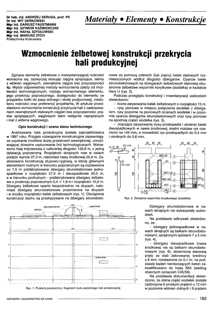przypadku belki do pasa dolnego i strefy podporowej), niedoboru nośnościoraz preferencji projektanta. W artykule przedstawiono wzmocnienie konstrukcji przykrycia hali z zastosowaniem zewnętrznych stalowych cięgien bez przyczepności,prętów spręzających, węglowych taśmWstępnie napręzanych