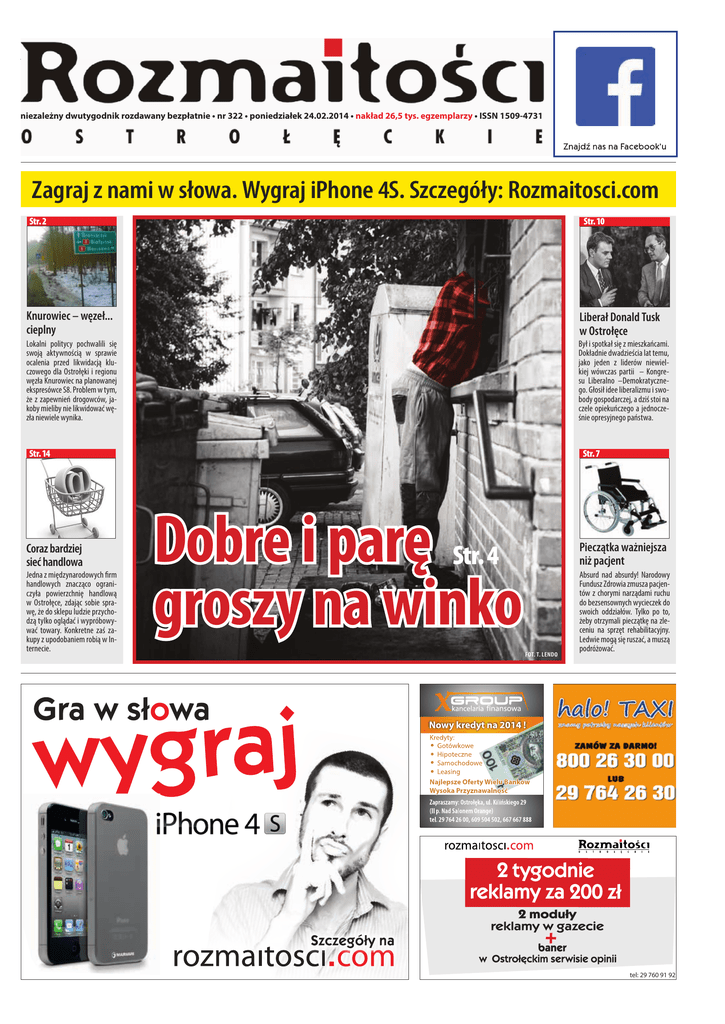 1 RO • poniedziałek 24.02.2014 niezależny dwutygodnik rozdawany bezpłatnie • nr 322 • poniedziałek 24.02.2014 • nakład 26,5 tys. egzemplarzy • ISSN 1509-4731 Zagraj z nami w słowa. Wygraj iPhone 4S. Szczegóły: Rozmaitosci.com Str. 2 Str. 10 Knurowiec – węzeł... cieplny Liberał Donald Tusk w Ostrołęce Lokalni politycy pochwalili się swoją aktywnością w sprawie ocalenia przed likwidacją kluczowego dla Ostrołęki i regionu węzła Knurowiec na planowanej ekspresówce S8. Problem w tym, że z zapewnień drogowców, jakoby mieliby nie likwidować węzła niewiele wynika. Był i spotkał się z mieszkańcami. Dokładnie dwadzieścia lat temu, jako jeden z liderów niewielkiej wówczas partii – Kongresu Liberalno –Demokratycznego. Głosił idee liberalizmu i swobody gospodarczej, a dziś stoi na czele opiekuńczego a jednocześnie opresyjnego państwa. Str. 14 Coraz bardziej sieć handlowa Jedna z międzynarodowych firm handlowych znacząco ograniczyła powierzchnię handlową w Ostrołęce, zdając sobie sprawę, że do sklepu ludzie przychodzą tylko oglądać i wypróbowywać towary. Konkretne zaś zakupy z upodobaniem robią w Internecie. Str. 7 Dobre i parę groszy na winko Str. 4 Pieczątka ważniejsza niż pacjent FOT. T. LENDO Absurd nad absurdy! Narodowy Fundusz Zdrowia zmusza pacjentów z chorymi narządami ruchu do bezsensownych wycieczek do swoich oddziałów. Tylko po to, żeby otrzymali pieczątkę na zleceniu na sprzęt rehabilitacyjny. Ledwie mogą się ruszać, a muszą podróżować. tel: 29 760 91 92 2 RO • poniedziałek 24.02.2014 Knurowiec – węzeł ... cieplny WJAZD OD STRONY OSTROŁĘKI NA KRAJOWĄ ÓSEMKĘ W KNUROWCU - WIDOK OBECNY. FOT. INFORMEDIA Obserwując zamieszanie związane z rezygnacją przez drogowców z budowy węzła w Knurowcu, można odnieść wrażenie, że wcale nie jest to obiekt drogowy, a węzeł... cieplny. Pozwolił ogrzać się naszym lokalnym politykom w gorącej atmosferze społecznego niezadowolenia wynikającego z faktu, że Generalna Dyrekcja Dróg Krajowych i Autostrad postanowiła odciąć wjazd na planowaną ekspresówkę do Warszawy podróżnym z regionu ostrołęckiego. A jednocześnie pozostawić bezkolizyjne powiązanie drogi szybkiego ruchu S8 ze ślepą uliczką w podwyszkowskiej wsi Trzcianka. Mieszkańcom Ostrołęki i okolic, którzy nieczęsto jeżdżą do Warszawy, a jeżeli już, to tylko uświęconym wiekową tradycją traktem przez Pułtusk i most Gdański wyjaśnijmy, że odkąd podwyszkowski Tiurzyn z przedmieściami Warszawy łączy dwujezdniowa ekspresówka, wielu kierowców decyduje się na niewygody ostrych zakrętów na drodze przez Długosiodło, by w Turzynie wyjechać na starą krajową ósemkę, która dosłownie za chwilę zmienia się w jasną, dość długą i prostą drogę do Warszawy, jakościowo znacznie lepszą niż np. dolnośląski odcinek autostrady A4. Ta świetna ekspresówka ma wkrótce zostać przedłużona w kierunku Ostrowi. Kiedy – dokładnie nie wiadomo. Bo konkretna budowa kosztuje konkretne pieniądze, a i napracować przy tym się trzeba. Drogowcy, urzędnicy i politycy od lat pogrążeni są więc w podróżach palcem po mapie i kreśleniu kolejnych wizji przebiegu planowanego przedłużenia ekspresówki warszawsko –białostockiej. Wizji tych była cała masa. Łącznie z taką proekologiczną, omijającą Puszczę Białą szerokim łukiem – zahaczającym niemal o przedmieścia Goworowa. Ten proekologiczny wariant drogowcy prędziutko jednak zamknęli w szafie jako nieopłacalny ekonomicznie. A szkoda – bo i Puszcza Biała by odetchnęła, a i my mielibyśmy w pobliżu Ostrołęki dobrą drogę do Warszawy, do której nasi samorządowcy mogliby dobudować prosty drogowy wysięgnik za stosunkowo niewielkie pieniądze. I mielibyśmy trasę prosto do Europy. Nie tylko do Warszawy. Ale śmiałe plany poszły do kosza. Pozostał wariant budowy ekspresówki po śladzie starej ósemki – między Wyszkowem a Ostrowią. Na tych planach zaznaczono, że z nowej ekspresówki będzie zjazd do Długosiodła i dalej do Ostrołęki. Zjazd właśnie w miejscowości Knurowiec. W grudniu ubiegłego roku ktoś przytomny w Generalnej Dyrekcji Dróg Krajowych i Autostrad nagle jednak zauważył, że „panowie, ale te węzły za Wyszkowem to za gęsto są zaplanowane”. Dyrekcja postanowiła więc, że zlikwiduje się ten najruchliwszy węzeł – właśnie w Knurowcu, a pozostawi się (na prawach węzłów drogi ekspresowej!) zjazdy do wiosek Poręba i Trzcianka, które poza tymi oboma uroczymi miejscowościami tak naprawdę donikąd nie prowadzą. W powiecie wyszkowskim powstał więc społeczny bunt. W powiecie ostrołęckim panowała na ten temat zagadkowa cisza dopóki pod koniec stycznia „Rozmaitości Ostrołęckie” nie ujawniły tych szkodliwych społecznie planów Generalnej Dyrekcji. Szum zrobił się więc również w Ostrołęce. Poseł Arkadiusz Czartoryski zainicjował spotkanie w sprawie węzła w Knurowcu w ostrołęckim ratuszu. Poseł Andrzej Kania zainicjował spotkanie w tej sprawie z wiceministrem transportu i złożył interpelację poselską. Poseł Bartłomiej Bodio zaś zainicjował swą interwencję w Generalnej Dyrekcji, gdzie podobno upoważniono go do przekazania informacji, że węzeł w Knurowcu zostaje. Z formalnego punktu widzenia ta radosna nowina oznacza tylko tyle, że pozwolenie na budowę tego węzła przedłużono o dwa lata. W tym czasie ekspresówka między Ostrowią a Wyszkowem na pewno nie powstanie. Nie jest jeszcze nawet zabudżetowana, a nie mając pieniędzy Generalna Dyrekcja nie ogłosi przetargu na modernizację tej drogi. Za dwa lata pozwolenie na budowę węzła w Knurowcu wygaśnie. Wtedy drogowcy będą mogli spokojnie wykreślić go z planów już bez konsultacji społecznych. I oby było to nieuprawnione proroctwo... ■ (WKB) Zmarł Henryk Maćkowiak Społecznik, pedagog i regionalista, dr Henryk Maćkowiak z