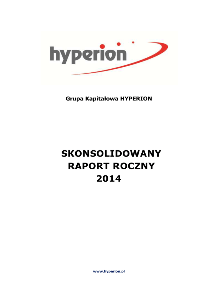 Grupa Kapitałowa HYPERION SKONSOLIDOWANY RAPORT ROCZNY 2014 www.hyperion.pl Zawartość: Pismo Prezesa Zarządu do akcjonariuszy Spółki Hyperion S.A. Oświadczenie Zarządu Hyperion S.A. Skonsolidowane sprawozdanie finansowe Hyperion S.A. za rok 2014 wraz z informacją dodatkową Opinia niezależnego biegłego rewidenta z badania skonsolidowanego sprawozdania finansowego Grupy Kapitałowej Hyperion za rok 2014 Raport uzupełniający opinię z badania skonsolidowanego sprawozdania finansowego Grupy Kapitałowej Hyperion za rok 2014 Sprawozdanie Zarządu z działalności Grupy Kapitałowej Hyperion w roku 2014 Oświadczenie o stosowaniu ładu korporacyjnego w roku 2014 Warszawa, dnia 30 kwietnia 2015 roku PISMO PREZESA ZARZĄDU HYPERION S.A. SKIEROWANE DO AKCJONARIUSZY SPÓŁKI Szanowni Państwo, W imieniu Zarządu Hyperion S.A. (Spółka) przedstawiam Państwu raporty roczne za rok obrotowy zakończony 31 grudnia 2014 roku. Wydarzenia, które miały miejsce i działania operacyjne podejmowane przez Zarządy Spółki i Zarządy spółek zależnych w sposób bezpośredni wpłynęły na osiągnięte wyniki finansowe. W roku 2014 roku Grupa Kapitałowa Hyperion: osiągnęła przychody ze sprzedaży w wysokości 18,344 mln zł poniosła stratę operacyjną (EBIT) w wysokości 56,444 mln zł, odnotowała stratę operacyjną przed amortyzacją (EBITDA) w wysokości 54,185 mln zł, poniosła stratę netto w wysokości 58,232 mln zł. Zeszłoroczne wyniki nie cieszą Zarządu i nie przynoszą satysfakcji Akcjonariuszom, ale mamy nadzieję, że nowa strategia i efekty jej wdrożenia przyniosą szybkie rezultaty i już bieżący rok będzie początkiem nowych, lepszych wyników. W miesiącu wrześniu 2014 roku nastąpiły istotne zmiany w akcjonariacie i we władzach spółki. Nowy Zarząd wraz z Radą Nadzorczą przygotował istotne zmiany w strategii rozwoju i natychmiast rozpoczęto jej wdrażanie. W pierwszej kolejności przystąpiono do uruchomienia projektu „Małopolska Sieć Szerokopasmowa” którego skuteczna realizacja będzie jednym z filarów rozwoju Grupy Kapitałowej w najbliższych latach. Do chwili obecnej udało się zakończyć zgodnie z harmonogramem budowę 35% sieci a wszystkie kluczowe z punktu widzenia realizacji projektu umowy z partnerami takimi jak Małopolski Urząd Marszałkowski, Orange Polska S.A., Comp S.A. czy Telprojekt S.A. są podpisane i realizowane zgodnie z założeniami i w partnerskiej atmosferze. W ramach tego projektu zostanie wybudowana i pozyskana sieć światłowodowa o łącznej długości prawie 3 tys. km, w tym ok. 700 km sieci szkieletowej oraz ponad 2,2 tys. km sieci dystrybucyjnej, zbudowanych zostanie 19 węzłów głównych na sieci szkieletowej oraz 245 węzłów sieci dystrybucyjnej. Realizacja tego projektu zapewni dostęp do sieci szerokopasmowej dla: ok. 1 mln mieszkańców; ok. 350.000 gospodarstw domowych; ok. 2000 jednostek administracji publicznej. Jednocześnie Grupa Hyperion zgodnie z nową strategią przekształca się w Holding spółek o charakterze czysto telekomunikacyjnym. Temu ma służyć zrealizowana już po zamknięciu roku obrotowego transakcja zbycia spółek działających w innych obszarach gospodarczych (Telestar, Netshops, First Class). Ich zbycie a jednocześnie rozliczenie wszelkich zobowiązań wobec podmiotów związanych z poprzednim inwestorem strategicznym Grupy, spółką MNI S.A., pozwoli uwolnić bilans Hyperiona i skoncentrować naszą uwagę na realizacji celu jakim jest stworzenie małej ale efektywnej i dysponującej nowoczesną infrastrukturą Grupy telekomunikacyjnej. Niestety restrukturyzacja działalności zwykle jest kosztowna i tak jest również w tym wypadku. Oczyszczenie bilansu z działalności nie będącej przyszłością Grupy spowodowało konieczność dokonania znaczących odpisów wartości zbywanych aktywów. Ich poziom w 2014 roku wyniósł 52,79 mln zł. Jest to oczywiście wynik czysto księgowy nie mający wpływu na naszą płynność finansową a poprzez utworzenie tarczy podatkowej nawet poprawiający naszą sytuację w przyszłości, ale obciążający nasze wyniki w 2014 roku. Przekształcenie się w podmiot będący operatorem telekomunikacyjnym ma zostać również wzmocnione poprzez kolejną transakcję zrealizowaną po zamknięciu roku obrotowego a mianowicie nabycie aktywów telekomunikacyjnych pozwalających na świadczenie usług w Warszawie, Radomiu i okolicach oraz na Podlasiu. Na bazie tych aktywów zostanie utworzona spółka, której celem będzie realizowanie na tych obszarach oraz w województwie małopolskim nowoczesnej sieci szerokopasmowej dla abonentów w modelu B2C. Zakładamy, że projekty te zostaną zrealizowane z udziałem środków z nowej perspektywy unijnej przeznaczonych na rozbudowę abonenckiej infrastruktury telekomunikacyjnej. Jestem przekonany, iż w roku 2015 będziecie Państwo świadkiem dalszego rozwoju Naszej Spółki i jej Grupy Kapitałowej, powrotu do wzrostu przychodów i rentowności prowadzonej działalności. ___________________ Piotr Majchrzak Prezes Zarządu Warszawa, dnia 30 kwietnia 2015 roku OŚWIADCZENIE ZARZĄDU Zgodnie z wymogami Rozporządzenia Ministra Finansów z dnia 19 lutego 2009 roku w sprawie informacji bieżących i okresowych przekazywanych przez emitentów papierów wartościowych oraz warunków uznawania za równoważne informacji wymaganych przepisami prawa państwa niebędącego państwem członkowskim Zarząd Hyperion S.A.: oświadcza, że zgodnie z jego najlepszą wiedzą, roczne skonsolidowane sprawozdanie finansowe Grupy Kapitałowej Hyperion („Grupa Hyperion”) za rok obrotowy 2014 oraz dane porównywalne zostały sporządzone zgodnie z obowiązującymi zasadami rachunkowości oraz że odzwierciedlają w sposób prawdziwy, rzetelny i jasny sytuację majątkową i finansową oraz wynik finansowy Grupy Hyperion. Sprawozdanie z działalności Grupy Hyperion zawiera prawdziwy obraz rozwoju i osiągnięć ora