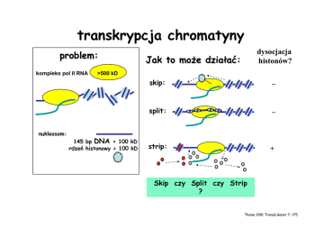 transkrypcja chromatyny problem: kompleks pol II RNA nukleosom: dysocjacja histonów? Jak to może działać: >500 kD 145 bp DNA = 100 kD rdzeń histonowy = 100 kD skip: - split: - strip: + Skip czy Split czy Strip ? Thoma 1991 Trends Genet 7: 175 skip? Jak by to się mogło dziać? przesuwanie się wzdłuż pętli DNA Studitsky, Clark, Felsenfeld 1974 Cell 76, 371 tak działa pol III RNA i fagowe pol RNA (także zależne od ATP kompleksy remodelujące) Studitsky i in. 2004 Trends Bioch Sci 29: 127-135 split ? Jak by to się mogło dziać? w ME transkrybowana chromatyna wydaje się być „gładka” (o jednakowej grubości), nić jest grubsza niż gołe DNA, przeciwciała wykrywają obecność histonów czy to są artefakty? Transcription kb 3.53 -+ +3.5kb CIN2 +3.0kb 2.03 1.58 a +2.5kb 0.98 transkrypcja eksponuje dwie, normalnie ukryte, reszty cysteinowe H3 na działanie czynników modyfikujących i chromatografię powinowactwa Hg mononukleosomy wydają się być niesfałdowane w postaci dwu tetramerów histonów + nieduże białka niehistonowe Prior & Allfrey 1983 Cell 34, 1a0a33a HSP82 1.33 +2.0kb 0.82 w transkrybowanej chromatynie po trawieniu DNazą I pojawiają się powtórzenia połówek nukleosomów Lee & Garrard 1991 EMBO J. 10, 607 powolna transkrypcja przez pol II RNA powoduje wyparcie z nukleosomu jednego dimeru H2A-H2B Studitsky i in. 2004 Trends Bioch Sci 29: 127-135 strip ? synteza histonów obrót histonów problem: które histony są dostępne do tworzenia nukleosomów ? mitoza faza G2 zależne od replikacji faza G konstytutywne faza S M faza G1 zastępcze histony faza S faza G2 M u wszystkich eukariota H3.3, u roślin wysoce zacetylowany H3.2 aktywna transkrypcja przez pol II RNA powoduje rozpad nukleosomów Kulaeva i in. 2007 Mutat Res 618: 116-129 dynamiczna struktura chromatyny • w obrębie wysp CpG struktura chromatyny jest zależna od stanu metylacji DNA • modyfikacje histonów tworzą „kod histonowy” • remodelowanie chromatyny * z udziałem dużych kompleksów remodelujących zależnych od ATP * niekiedy za pośrednictwem interferencji RNA (RNAi) NOBEL 2006 przykłady zależnej od RNA heterochromatynizacji: - inaktywacja chromosomu X (Xi), - wyciszenie centromerów i loci typu koniugacyjnego u drożdży rozszczepkowych Schizosaccharomyces pombe modyfikacje histonów acetylacja lizyn metylacja lizyn (mono, di, tri) oraz arginin (mono, di) fosforylacja seryn i treonin ubikwitynacja C-końcowych lizyn ADP-rybozylacja Allfrey i in. PNAS 51, 786-794 koniugacja SUMO do lizyn Bradbury, BioEssays 14, 9-16 K – lizyna S - seryna acetylacja konserwowanych lizyn (N końce H3 i H4 oraz wzorce ich acetylacji są konserwowane) 5 Ac H4 N-terminus 12 Ac Ac 16 20 Ac Ac or Me Ac-S-G-R-G-K-G-G-K-G-L-G-K-G-G-A-K-R-H-R-K-V-L-R-D+ + + + + + + + + + 4 Me H3 N-terminus 8 9 Ac 18 Ac 14 Ac 23 Ac 27 Ac or Me A-R-T-K-Q-T-A-R-K-S-T-G-G-K-A-P-R-K-Q-L-A-T-K-A-A-R-K-S-A-P+ + + + + + + + + N lizyna Acetyl-CoA C C g C e N+ O C a b C d C HAT (Histone Acetyl-Transferase) O P P wiązanie DNA - O HDAC (Histone Deacetylase) - - - C C O C C e C C C - O - P - - C N - - - N e-N-acetylo-lizyna brak wiązania DNA - odwracalne reakcje CoA O O - -- - - - - - rozmaitość kompleksów HAT modyfikacje lizyny LSD1 demetyluje histony Klose & Zhang 2007 Nature Revi Mol Cell Biol 8, 307-318 a Mechanizm reakcji usuwania grup mon-metylowych przez LSD1. Uważa się, że LSD1 katalizuje demetylację mono- i dimetylowanych reszt lizynowych w reakcji oksydacji amin z FAD jako kemofactor. Loss of the methyl group from mono-methyl lysine occurs through an imine intermediate, which is hydrolysed to form formaldehyde by a non-enzymatic process. b A polypeptide backbone cartoon structure of LSD1 bound to Co-REST and the cofactor FAD. The twolobed amine oxidase (AO) domain is shown in orange and yellow. The Tower domain is in green and the SWIRM domain in blue. The Co-REST linker region (pink) associates with the LSD1 Tower domain and the SANT domain (red) situated at the top of the Tower domain. c Depiction of the potential association of LSD1–Co-REST with nucleosomal DNA. The bottom half shows a nucleo-some with the core histone octamer in the centre and the associated DNA double helix in blue. The LSD1–Co-REST complex modelled onto a nucleosome indi-cates that the SANT domain of Co-REST (red) could interact with nucleosomal DNA, whereas LSD1 tar-gets the histone H3 tail where it protrudes from the DNA gyres (shown by the arrow). d LSD1 w kompleksie Co-REST bierze udział w represji genów neuronalnych w komórkach nieneuronalnych. LSD1 uczestniczy w represji poprzez usuwanie metylacji H3K4. e LSD1 w kompleksie receptora adrogenu (AR) staje się aktywatorem poprzez zmianę specyficzności do substratu, tak żę katalizuje usuwanie metylacji H3K9. Peterson, Laniel 2004 Curr. Biol. 14:R546-51 kod histonowy daje możliwość acetylacji H4 - w 4 pozycjach, fosforylacji H3 – w 2 pozycjach… >4 000 kombinacji modyfikacji pojedynczego nukleosomu kod histonowy H4AcK8 H3AcK14 H3PhS10 = transkrypcja H3MeK9 (trimetylacja) brak acetylacji H3 lub H4 = represja transkrypcji H4AcK4 H4AcK12 = tworzenie nowych nukleosomów w fazie S H2APhS1 H2APhT119 H3PhT3 H3PhS10 H3PhS28 = skondensowana mitotyczna chromatyna Peterson, Laniel 2004 Curr Biol 14, R546 ogólne cechy chromatyny nieaktywnej aktywnej * * * * deacetylacja histonów H4MeK12 5mCpG obecność HP1 (izoformy α,β,γ) * * * * H4AcK5, H3AcK9/14 H3MeK9 brak metylacji DNA m-sca nadwrażliwe na DNazę I acetylacja histonów na promotorach TH receptor hormonu tarczycy przykład czynnika transkrypcyjnego TH ACGGTC ADA2 ADA3 GCN5 HAT p300 CPB HAT HAT P/CAF TACCCG koaktywator korepresor HDAC HAT N-CoR Sin3 RPD3 HAT TA TA TAFII 250 P pol.II TB TA TA P TB brak hormonu TACCCG HAT TAFII 250 represja transkrypcji TR/RXR hormon aktywacja transkrypcji + Wolffe 1997 Nature 387: 16 zmienione aktywacja genów fazy S korepresor Rb HAT CPB TAF 250 II P TB HAT niska aktywność HAT mitoza