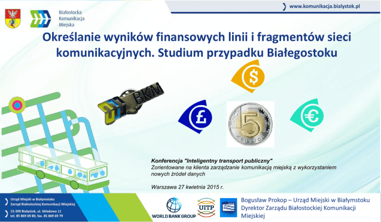 Określanie wyników finansowych linii i fragmentów sieci komunikacyjnych. Studium przypadku Białegostoku Konferencja "Inteligentny transport publiczny" Zorientowane na klienta zarządzanie komunikacją miejską z wykorzystaniem nowych źródeł danych Warszawa 27 kwietnia 2015 r. Bogusław Prokop – Urząd Miejski w Białymstoku Dyrektor Zarządu Białostockiej Komunikacji Miejskiej Plan prezentacji 1. Organizacja publicznego transportu zbiorowego w Białymstoku 2. Podstawy prawne współpracy międzygminnej 3. Zintegrowana taryfa biletowa 4. Narzędzia integracji biletowej 5. Finansowanie obsługi komunikacyjnej i zasady rozliczeń międzygminnych 2 Organizacja publicznego transportu zbiorowego w Białymstoku Zakład Obsługi Komunikacji Miejskiej pierwszy w Polsce zarząd transportu miejskiego utworzony w 1991 r. 1991 – ZOKM Białystok 3 Kontrakt brutto, umowa powierzenia do 2019 r. Organizacja publicznego transportu zbiorowego w Białymstoku Współpraca z gminami w latach 2000-2009 odbywała się na zasadzie porozumień ZOKM z gminami. Na strefę gminną ustalono odrębne bilety. Gminy nie były obciążane kosztem obsługi. W 2005 roku przeprowadzono badania wykazujące poziom dopłaty z gmin. Warunki pozostały bez zmian. Od 1 grudnia 2009 r. obsługa komunikacyjna 6 gmin sąsiednich odbywa się na podstawie porozumień międzygminnych o powierzeniu zadania organizowania komunikacji na ich terenie. Aglomeracyjna komunikacja autobusowa 6 gmin objętych porozumieniem komunikacyjnym 5 BKM poza Białystokiem :17 linii +3 linie wewnątrzgminne, 1 mln km rocznie 6 Taryfa biletowa Białostockiej Komunikacji Miejskiej – najtańsze bilety okresowe wśród miast wojewódzkich w Polsce – w 2014 r. 67% pokrycia kosztów usług przewozowych wpływami z biletów cennik biletów imiennych miesięcznych normalnych Strefa B G2,G3,G4 B+G2 Cena 80 zł 70 zł 150 zł B+G2+G3 B+G2+G3+G4 180 zł 210 zł Rodzaj biletu Cena biletu papierowego Cena biletu z e-karty Jednorazowy 2,80 zł (B), 2,40 zł (G) 2,70 zł (B), 2,30 (G) 24-godzinny 10 zł (B), 18 zł (B+G2+G3+G4) 3-dniowy weekendowy 16 zł (B), 20 zł (B+G2+G3+G4) „u kierowcy” 3,50 zł za każdą strefę G2+G3+G4 130 zł ----- Narzędzie integracji biletowej – ewolucja taryfy = uproszczenie 7 Finansowanie Białostockiej Komunikacji Miejskiej Rodzaj biletu jednorazowe okresowe e-portmonetka u kierowcy suma koszty dopłaty Dochody 23 018 034 zł 38 828 671 zł 1 311 954 zł 1 388 471 zł 64 547 130 zł 96 546 790 zł 31 999 659 zł Udział w Pokrycie dochodzie kosztów 35,66% 23,84% 60,16% 40,22% 2,03% 1,36% 2,15% 1,44% 100,00% 66,86% Dochody z biletów ulgowych Udział dopłaty do ulg w dopłacie ogólnej eportmonetka, 1311 954 zł u kierowcy, 1388 471 zł 33,14% 25 079 624 zł 78% okresowe, 38828 671 zł 8 jednorazowe, 23018 034 zł Zadania i obowiązki Białegostoku • Organizacja usługi: umowy z operatorami, rozkłady jazdy • Sprzedaż i dystrybucja biletów – sieć sprzedaży • Ustalanie taryfy biletowej, kontrola biletowa i windykacja Zadania i obowiązki gmin • Ustalają potrzeby przewozowe • Utrzymują infrastrukturę przystankową na swoim terenie • Pokrywają koszty świadczonych usług, w tym z wpływów z biletów 9 Zintegrowana strefowa taryfa biletowa BKM Aktualny układ stref taryfowych Historyczny układ stref taryfowych 10 • Karta zastąpiła wszystkie papierowe bilety okresowe. • Z elektronicznej portmonetki można kupić dowolny bilet jednorazowy lub wieloprzejazdowy nawet dla 30 osób! Narzędzia integracji biletowej 11 Gmina Liczba ludności Długość linii podmiejskiej Pokrycie kosztów wpływami z biletów Białystok 294 298 --- 70% Choroszcz 14 217 11 km 38% 8 565 15,5 km 46% Juchnowiec Kościelny 14 859 12 i 17 km 33% Supraśl 13 923 11,5 km 33% Wasilków 14 699 6 i 12 km 70% Zabłudów 9 112 2 km 42% Dobrzyniewo Duże Zintegrowana strefowa taryfa biletowa BKM Zasady rozliczeń z gminami sąsiednimi • Koszt wynika z wykonanej liczby wozokilometrów po ustalonej stawce. • Dochód z biletów dla gminy stanowią bilety imienne zakupione przez mieszkańców gminy (adres zamieszkania), elektroniczne bilety jednorazowe zakupione na liniach obsługujących Gminę oraz bilety sprzedane przez kierowców. • Inne dochody gminy z pozostałych rodzajów biletów są pochodną wskaźnika udziału gminy w całości sprzedaży biletów imiennych na strefę gminną zastosowanego do sprzedanych biletów papierowych oraz elektronicznych biletów okresowych na okaziciela. • Mieszkańcy Białegostoku finansują utrzymanie linii komunikacyjnych w gminach, a mieszkańcy gmin komunikację w granicach Białegostoku! Możliwe jest rozliczenie w oparciu o dane z kart rejestrowanych na liniach. Warunek – tylko bilet elektroniczny i bilet u kierowcy w autobusie. 13 Finansowanie usług komunikacyjnych Przypisanie dochodów z biletów na podstawie back-office Zał.1.Rozliczenie wplywów z biletów imiennych, na okaziciela i jednorazowych - I kwartał 2014. Udział gminy w dochodach z biletów imiennych G Przychody ze sprzedaży biletów imiennych obowiązujących w strefach taryfowych gmina BIAŁYSTOK INNE DOBRZYNIEWO DUŻE CHOROSZCZ JUCHNOWIEC KOŚCIELNY SUPRAŚL WASILKÓW ZABŁUDÓW koszty dystrybucji dochód SUMA B 7 153 725 7 027 940 1 591 850 1 560 790 157 880 87 690 228 865 163 085 324 360 283 065 326 410 231 280 382 565 228 915 69 845 62 740 10 235 500 9 645 505 G3+G4 G2+G3+G4 G2 G3 G4 125 785 122 460 2 385 940 31 060 30 345 465 250 70 190 49 980 15 015 5 195 65 780 65 835 15 41 295 41 295 - 95 130 94 155 930 45 153 650 153 560 45 45 7 105 6 925 120 60 - 589 995 564 555 18 975 6 535 409 420 385 820 23 600 22 582 759 261 9 826 080 9 259 685 566 395 541 973 18 216 6 274 14 Dochody gminy z bile imiennych ------12,14% 15,99% 10,03% 22,87% 37,29% 1,68% 100,00% ------24 490 ---------------24 490 24 490 Kluczowym jest rozdzielenie wpływów zakupionych przez białostoczan oraz gmin spoza aglomeracji Udział gminy 