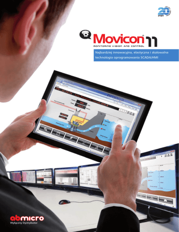 Movicon Monitoring vision and control Movicon Monitoring vision and control Najbardziej innowacyjna, elastyczna i skalowalna technologia oprogramowania SCADA/HMI Wyłączny Dystrybutor Rozwiązania dla: przemysłu motoryzacyjnego, chemicznego, spożywczego, farmaceutycznego, naftowego i gazownictwa, energetyki, górnictwa, gospodarki wodno-ściekowej, automatyki budynkowej, telemetrii, ochrony środowiska Otwarta i elastyczna architektura Movicon™ zapewnia najlepsze rozwiązanie SCADA/HMI dla zastosowań we wszystkich sektorach przemysłu Gwarancja stałego, nieprzerwanego przepływu danych z procesu produkcyjnego w czasie rzeczywistym, od czujników i przetworników pomiarowych do systemów monitorowania, sterowania i analiz, jest niezbędna dla efektywnego zarządzania nowoczesnymi instalacjami przemysłowymi oraz zwiększenia wydajności i rentowności produkcji. Movicon™11 to najlepsze z dostępnych dziś na rynku rozwiązań dla wszystkich producentów, którzy chcą wdrożyć i efektywnie wykorzystywać aplikację nadrzędnej kontroli i sterowania, animowany w czasie rzeczywistym interfejs użytkownika oraz oprogramowanie do gromadzenia danych produkcyjnych. Technologia “XML-Inside” jest rewolucyjną innowacją, dzięki której Movicon™11 oferuje zintegrowane środowisko projektowe dla aplikacji HMI, SCADA, Soft-Logic i analiz statystycznych, redukujące do minimum czas opracowaniai zapewniające użytkownikom rozwiązania o bogatej funkcjonalności, elastyczne i łatwe w utrzymaniu. Movicon™11 stanowi znakomitą platformę SCADA/HMI o bezkonkurencyjnej otwartości, wydajności i łatwości obsługi. Jako jedyny 2 w swojej klasie oparty jest całkowicie na standardach XML i najnowszych technologiach takich jak Web Services, skalowalna grafika wektorowa SVG, OPC, SQL, ODBC, .Net oraz technologia Java, wykorzystywana w rozwiązaniach zdalnego dostępu przez Internet (Web Client). Movicon™11 jest standardowym oprogramowaniem dla zastosowań w automatyce przemysłowej, zdalnym sterowaniu, telemetrii i automatyce budynkowej, stanowiąc uniwersalną, niezależną od stosowanych rozwiązań sprzętowych, platformę SCADA/ HMI, którą można zaadaptować do każdych wymagań oraz zainstalować i udostępnić wszędzie tam, gdzie jest to potrzebne. Aplikacje Movicon™11 mogą być instalowane na różnych poziomach począwszy od paneli operatorskich HMI i urządzeń mobilnych opartych na WinCE aż po komputery PC i serwery w dużych systemach przemysłowych z redundowaną architekturą Klient/Serwer, komunikacją z różnymi sterownikami PLC i różnymi magistralami obiektowymi. Otwartość i przenaszalność aplikacji na różne platformy sprzętowe oszczędza czas potrzebny na ich opracowanie i skraca czas wdrożenia, zmniejszając ponoszone koszty i zapewniając ochronę inwestycji. Elastyczny system nadzoru Ochrona inwestycji dzięki najbardziej innowacyjnej i nowoczesnej technologii oprogramowania Elastyczność jest jednym z kluczowych wymagań stawianych współczesnym systemom automatyki. Elastyczność oznacza szybką adaptację do zmieniających się wymagań klientów, bez poświęcania wcześniej wdrożonych rozwiązań i zdobytego doświadczenia. Tu właśnie Movicon™11 zapewnia najwyższą gwarancję ochrony inwestycji, gdyż za pomocą jednego oprogramowania można zrealizować potrzeby wszystkich poziomów aplikacji automatyki w całym przedsiębiorstwie. Od poziomu lokalnego sterowania (sterowniki PLC, panele HMI) do ogólnozakładowego poziomu SCADA/MES. Movicon™11 jest prawdzie elastyczną platformą oprogramowania, umożliwiającą adaptację do potrzeb wszystkich nowoczesnych modeli aplikacji stosowanych w automatyce. Dzięki tym właściwościom, poprzez stosowanie jednego, realizującego wszystkie potrzeby, oprogramowania SCADA/HMI w całym przedsiębiorstwie, można zredukować koszty oszczędzając na aktualizacji wielu platform, szkoleniach pracowników i uczeniu się obsługi różnych narzędzi. Rewolucyjny Movicon™11 rozszerza granice dotychczasowych koncepcji przemysłowych systemów nadzoru. Movicon™11 nie tylko dostarcza bogaty zestaw narzędzi do szybkiego i intuicyjnego tworzenia zaawansowanych projektów wizualizacji i sterowania, ale udostępnia także najbardziej innowacyjne technologie umożliwiające łatwą integrację z całym światem, zarówno w zakresie dostarczania danych do systemów zarządzania (MES, ERP), jak i udostępniania danych lokalnym i zdalnym użytkownikom poprzez Intranet i Internet. Dzięki prawdziwej, korzystającej z systemu ochrony Java, architekturze “Web-enabled” wgląd do zbudowanego systemu mogą mieć autoryzowani, korzystający z dowolnego komputera lub urządzenia mobilnego, użytkownicy znajdujący się w dowolnym miejscu na świecie. Elastyczność środowiska Movicon™11 pozwala budować aplikacje nadzoru dowolnego typu, proste lub złożone, bez konieczności kompromisów i rezygnowania z czegokolwiek. Od poziomu sterowania wejść/wyjść do lokalnych paneli HMI i komputerowych systemów wizualizacji, od zaawansowanych systemów nadzoru i sterowania SCADA do systemów gromadzenia i analizy danych produkcyjnych dla potrzeb zarządzania i optymalizacji wydajności, z powiadamianiem pracowników utrzymania ruchu na telefony komórkowe. Movicon™11 umożliwia integrację systemów w skali globalnej. Za pomocą jednej platformy projektowej można zapewnić otwartą i bezpieczną, wielosystemową, wymianę danych, z możliwością zdalnego zarządzania poprzez Intranet i Internet, także z poziomu urządzeń mobilnych. Windows 2008 Server Historian / Analysis MES/ERP Windows Mobile Client JavaPhones Web Client Windows 7 Supervision (SCADA) Windows Mobile Web Client Windows 7 Embedded HMI Touch PC Windows / Linux Web Client Windows CE HMI Touch Panels 3 Nieważne co chcesz zbudować… … my pomożemy Ci zrobić to znacznie szybciej W automatyce przemysłowej koszty tworzenia oprogramowania si