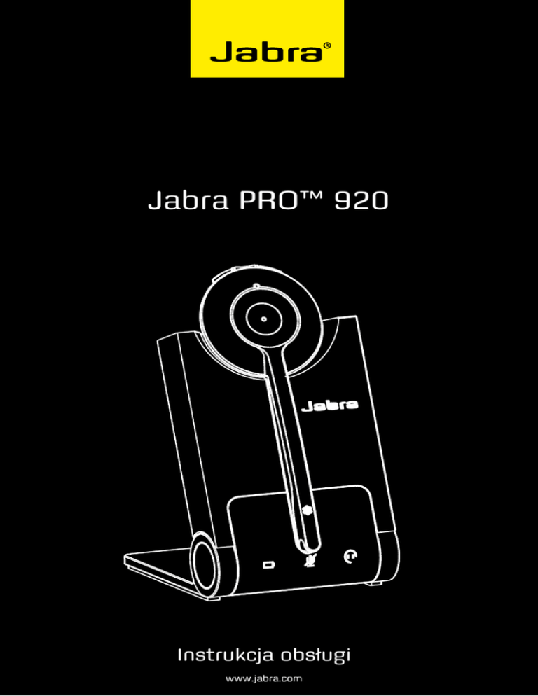 Jabra PRO™ 920 Instrukcja obsługi www.jabra.com 2.1 ZAWARTOŚĆ OPAKOWANIA............................................................................................................5 ENGLISH SPIS TREŚCI 1.WSTĘP..........................................................................................................4 2. PREZENTACJA PRODUKTU..................................................................5 2.2 PREZENTACJA ZESTAWU SŁUCHAWKOWEGO...................................................................6 2.3 MOCOWANIE ZESTAWU SŁUCHAWKOWEGO.....................................................................7 2.4 PREZENTACJA BAZY.............................................................................................................................8 2.5 WYPOSAŻENIE DODATKOWE........................................................................................................9 3. ŁĄCZENIE Z TELEFONEM STACJONARNYM............................... 10 3.1 SKŁADANA PODPÓRKA BAZY.....................................................................................................10 3.2 ŁĄCZENIE Z TELEFONEM STACJONARNYM.......................................................................11 3.3 PODŁĄCZANIE ZASILANIA DO BAZY.....................................................................................13 3.4 DOKOWANIE ZESTAWU SŁUCHAWKOWEGO...................................................................13 4. KONFIGUROWANIE DŹWIĘKU TELEFONU STACJONARNEGO................................................................................ 14 4.1 USTAWIANIE CZYSTEGO SYGNAŁU WYBIERANIA..........................................................14 4.2 USTAWIANIE GŁOŚNOŚCI MIKROFONU...............................................................................14 5. FUNKCJE ZESTAWU JABRA PRO 920............................................ 15 5.1 PRZYCISK WIELOFUNKCYJNY ZESTAWU SŁUCHAWKOWEGO...............................15 5.2 PRZYCISKI GŁOŚNOŚCI GŁOŚNIKA ZESTAWU SŁUCHAWKOWEGO...................15 5.3 PRZYCISK WYCISZANIA ZESTAWU SŁUCHAWKOWEGO............................................15 5.4 WSKAŹNIK LED ZESTAWU SŁUCHAWKOWEGO..............................................................16 5.5 WSKAŹNIKI DŹWIĘKOWE ZESTAWU SŁUCHAWKOWEGO.......................................16 5.6 WSKAŹNIKI OPTYCZNE BAZY......................................................................................................17 6. OBSŁUGA POŁĄCZEŃ......................................................................... 18 6.1 WYKONYWANIE, ODBIERANIE I KOŃCZENIE POŁĄCZEŃ.........................................18 6.2 PRZEŁĄCZANIE MIĘDZY TELEFONEM I ZESTAWEM SŁUCHAWKOWYM........18 6.3 POŁĄCZENIE KONFERENCYJNE WIELU ZESTAWÓW SŁUCHAWKOWYCH.....19 JABRA PRO 920 2 7.1 OCHRONA PRZED HAŁASEM SAFETONE™........................................................................20 7.2 ZASIĘG BEZPRZEWODOWY.........................................................................................................20 7.3 ZARZĄDZANIE ENERGIĄ.................................................................................................................20 ENGLISH 7. ZAAWANSOWANE FUNKCJE ZESTAWU JABRA PRO 920...... 20 7.4 ZDALNA OBSŁUGA POŁĄCZEŃ.................................................................................................20 7.5 ZMIANA USTAWIEŃ ZAAWANSOWANYCH........................................................................21 7.6 PRZYWRACANIE USTAWIENIOM ZAAWANSOWANYM WARTOŚCI FABRYCZNYCH.......................................................................................................................................22 7.7 KOPIOWANIE USTAWIEŃ DO WIELU BAZ JABRA PRO 920.......................................22 7.8 PAROWANIE WYMUSZONE (PAROWANIE NOWEGO ZESTAWU GŁÓWNEGO)..................................................................................................................22 7.9 AKTUALIZACJA OPROGRAMOWANIA SYSTEMOWEGO I USTAWIEŃ ZESTAWU SŁUCHAWKOWEGO (PRZEWÓD SERWISOWY).......................................22 8.POMOC..................................................................................................... 23 8.1 ROZWIĄZYWANIE PROBLEMÓW I CZĘSTO ZADAWANE PYTANIA....................23 9. DANE TECHNICZNE............................................................................. 24 9.1 ZESTAW SŁUCHAWKOWY JABRA PRO 920.........................................................................24 9.2 BATERIA ZESTAWU SŁUCHAWKOWEGO..............................................................................24 9.3 MATERIAŁY I ALERGIE........................................................................................................................25 9.4 BAZA JABRA PRO 920.......................................................................................................................25 9.5 UTYLIZACJA PRODUKTU................................................................................................................25 9.6 CERTYFIKATY I ATESTY BEZPIECZEŃSTWA........................................................................26 JABRA PRO 920 3 Gratulujemy zakupu nowego zestawu Jabra PRO 920. Szeroka gama dostępnych funkcji, komfort noszenia i prosta obsługa zestawu z pewnością zyskają Państwa uznanie. Funkcje zestawu słuchawkowego Jabra PRO 920 • Wyjątkowa jakość dźwięku. • Przyciski regulacji głośności i wyciszania. • Intuicyjny przycisk wielofunkcyjny do prostej obsługi połączeń. • Wskaźniki optyczne i dźwiękowe. • Zaawansowana ochrona słuchu za pomocą technologii SafeTone™. • Mikrofon z redukcją szumów. • Automatyczny tryb uśpienia pozwala oszczędzać energię. • Pałąk na głowę i zaczep na ucho (zaczep nie występuje we wszystkich regionach). ENGLISH 1. WSTĘP Funkcje bazy Jabra PRO 920 • Podstawka dokująca do ładowania zestawu słuchawkowego. • Optyczne 
