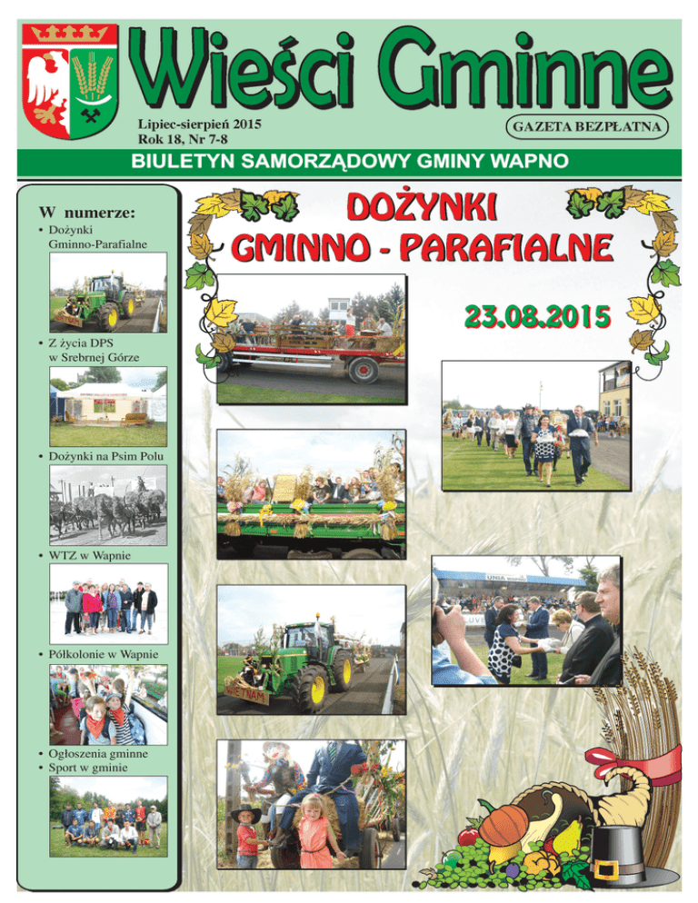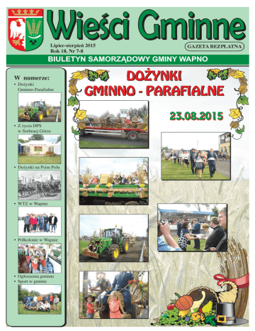 W numerze: • Do¿ynki Gminno-Parafialne • Z ¿ycia DPS w Srebrnej Górze • Do¿ynki na Psim Polu • WTZ w Wapnie • Pó³kolonie w Wapnie • Og³oszenia gminne • Sport w gminie WIEŒCI GMINNE lipiec - sierpnieñ 2015 Do¿ynki gminno -parafialne Tegorocznym gospodarzem do¿ynek gminno - parafialnych by³o so³ectwo Wapno Po³udnie. Do¿ynki odby³y siê 23 sierpnia br. Obrzêd Œwiêta Plonów rozpocz¹³ siê od uroczystej Mszy Œw. w Srebrnej Górze sprawowanej przez ksiêdza proboszcza Marka Szewczykowskiego w asyœcie ksiêdza proboszcza Adama Dyderskiego. Po uformowaniu siê delegacji wieñcowych i chlebowych, reprezentuj¹cych wszystkie so³ectwa naszej gminy, zosta³y one wprowadzone do srebrnogórskiego koœcio³a i pob³ogos³awione. Po zakoñczeniu uroczystej Mszy Œw. kolorowy korowód do¿ynkowy przejecha³ ulicami Wapna na stadion sportowy. Delegacje chlebowe na czele ze starostami do¿ynek Ann¹ Lidmann i Piotrem Filipowiczem przekaza³y bochny chleba, wypieczone z tegorocznych zbó¿ na rêce Wójta Gminy Zbigniewa Grabowskiego, Przewodnicz¹cego Rady Gminy Rados³awa Kubisza oraz Przewodnicz¹cej Rady Powiatu Ma³gorzaty Osuch. Po wyg³oszeniu okolicznoœciowego przemówienia przez wójta g³os zabra³a Ma³gorzata Osuch przekazuj¹c wszystkim uczestnikom do¿ynek podziêkowania i ¿yczenia od samorz¹du powiatowego. Nastêpnie wrêczone zosta³y nagrody Herbu Powiatu W¹growieckiego. Otrzymali je: Maria Kubisz, Ma³gorzata Wróblewska, Henryk Rogalski, Miros³aw Wojciñski oraz Maciej Ryska. Nagrod¹ Zas³u¿ony dla Rolnictwa wyró¿niony zosta³ Ryszard Skotarek (nagroda zostanie wrê- 2 czona na Do¿ynkach Powiatowych w Damas³awku). Tegoroczne Œwiêto Plonów obfitowa³o w wiele atrakcji skierowanych zarówno dla dzieci i m³odzie¿y jak i doros³ych mieszkañców gminy. Grupa karateków z klubu TIGER zademonstrowa³a swoje sportowe mo¿liwoœci. Ratownicy medyczni z w¹growieckiego szpitala przeprowadzili pokazow¹ lekcjê u¿ywania defibrylatora. Na scenie wyst¹pi³a 14- letnia utalentowana skrzypaczka Klaudia Ignas oraz iluzjonista Marek Corelli. Mo¿na by³o równie¿ postrzelaæ z karabinków, ³adowanych kulami z farb¹. Zgromadzonych przed scen¹ widzów rozbawia³ kabareciarz i satyryk Mieczys³aw Góra. Nie zabrak³o równie¿ koncertu muzycznego w wykonaniu Zbigniewa Zaranka i S³awomira Cz³apy. Na p³ycie stadionu odby³y siê równie¿ pokazy sprzêtu stra¿ackiego oraz lokalnego rêkodzielnictwa. Swoje prace prezentowa³a Bo¿ena Kubasik, Eugeniusz Jucha, Halina Pietrzycka, Jadwiga Jankiewicz, Hanna Gêbiak i siostry Nowakowskie. Dzieci zaœ t³umnie oblega³y „dmuchañce”, czyli zje¿d¿alnie i zamek oraz korzysta³y z przeja¿d¿ki kucykiem. W trakcie do¿ynek odby³a siê aukcja. Mo¿na by³o wylicytowaæ kucyka ufundowanego przez rodzinê pañstwa Jach. Spragnieni i g³odni mogli odwiedziæ stoisko z grochówk¹ oraz stoisko wolontariuszy proponuj¹cych kawê i ciasto. Na koniec, prawie do bia³ego rana, najwytrwalsi uczestnicy gminno - parafialnego Œwiêta Plonów bawili siê razem z zespo³em „Dombek Show”. Rados³aw Kubisz lipiec - sierpieñ 2015 WIEŒCI GMINNE Z ¿ycia Domu Pomocy Spo³ecznej w Sr ebr nej Górze Srebr ebrnej ci¹g dalszy ... Ostatnie wydarzenia w srebrnogórskim DPS potwierdzaj¹, ¿e ka¿dy wiek jest dobry na zabawê, wycieczki czy imprezy integracyjne. W ci¹gu minionego miesi¹ca nasi mieszkañcy mogli uczestniczyæ w kilku wydarzeniach, które by³y dla podopiecznych bardzo wa¿ne, ciekawe i integruj¹ce. Na pocz¹tku czerwca oœmiu mieszkañców razem z Pani¹ Dyrektor Beat¹ ¯o³nierowicz, Pani¹ Dorot¹ Stalic¹ – g³ównym ksiêgowym oraz Panem Andrzejem Królem – opiekunem, pojecha³o na kilka dni do Sarbinowa. Ju¿ na samym pocz¹tku wycieczki okaza³o siê, ¿e to by³ bardzo dobry pomys³. Mieszkañcy zadowoleni z wyjazdu, tym bardziej, ¿e niektórzy mogli zobaczyæ morze pierwszy raz w ¿yciu. Wspólnie spêdzony czas, odpoczynek na pla¿y, czy k¹piel w morzu dostarczy³y podopiecznym niesamowitych wra¿eñ. Mamy nadziejê, ¿e w przysz³ym roku równie¿ uda nam siê zorganizowaæ podobny wyjazd, którym sprawimy mieszkañcom tyle radoœci co w tym roku. Kolejnym wydarzeniem z udzia³em naszych mieszkañców by³o powitanie lata w Domu Pomocy Spo³ecznej w Nakle nad Noteci¹. Podopieczni razem z Pani¹ Barbr¹ Soñta oraz Panem Zenonem Nowakowskim udali siê do zaprzyjaŸnionego DPS 18 czerwca. Na uczestników imprezy czeka³o mnóstwo atrakcji: wystêpy artystyczne, konkursy, zabawy w których nasi mieszkañcy mogli wzi¹æ udzia³. W mi³ej atmosferze oraz przy bogato zastawionym stole wszyscy spêdzili czas. I wreszcie nadszed³ czas na jedn¹ z najwa¿niejszych i najbardziej oczekiwanych imprez w naszym Domu, a mianowicie spotkanie rodzin i przyjació³ Domu. Ju¿ po raz szósty w Domu Pomocy Spo³ecznej w Srebrnej Górze odby³o siê spotkanie rodzin naszych mieszkañców. Uroczystoœæ pod nazw¹ „VI Spotkanie Rodzin i Przyjació³ Domu Pomocy Spo³ecznej w Srebrnej Górze” odby³a siê 19 czerwca 2015 roku. Tak jak w ubieg³ych latach spotkanie rozpoczê³o siê Msz¹ Œw. któr¹ sprawowa³ proboszcz tutejszej parafii ks. Marek Szewczykowski. Nabo¿eñstwo w intencji mieszkañców, ich rodzin, przyjació³ Domu i pracowników odprawione zosta³o w sali kolorowej srebrnogórskiego Pa³acu. Po Mszy Œw. wszystkich goœci, mieszkañców i pracowników powita³a dyrektor Pani Beata ¯o³nierowicz, która jednoczeœnie podziêkowa³a przyjacio³om naszego Domu za wspó³pracê, wsparcie i zaanga¿owanie na rzecz Mieszkañców Domu, wrêczaj¹c upominki wykonane w ramach terapii zajêciowej naszej placówki. Wœród goœci uczestnicz¹cych w spotkaniu nie zabrak³o Starosty Powiatu W¹growieckiego Pana Tomasza Kranca, Wicestarosty Powiatu W¹growieckiego Pana Micha³a Piechockiego, Dyrektor Powiatowego Centrum Pomocy Rodzinie w W¹growcu Pani Edyty Owczarzak, Pani Lucyny Ostapiuk 