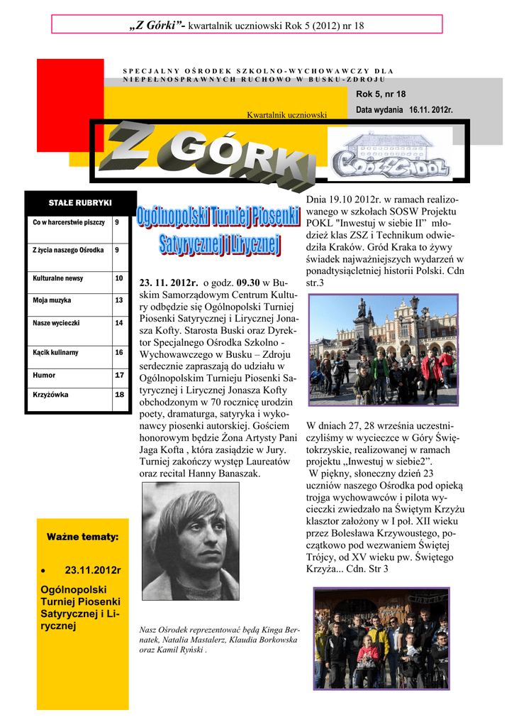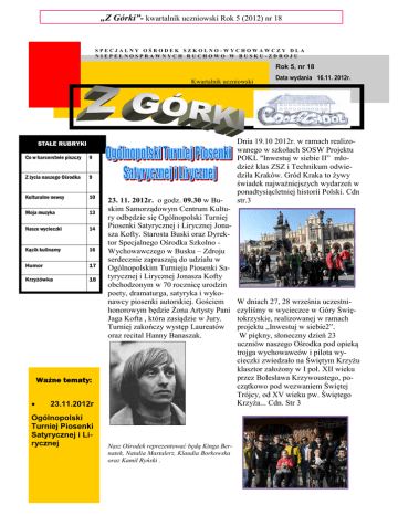 „Z Górki”- kwartalnik uczniowski Rok 5 (2012) nr 18 SPECJALNY OŚRODEK SZKOLNO-WYCHOWAWCZY DLA NIEPEŁNOSPRAWNYCH RUCHOWO W BUSKU-ZDROJU Rok 5, nr 18 Kwartalnik uczniowski STAŁE RUBRYKI Co w harcerstwie piszczy 9 Z życia naszego Ośrodka 9 Kulturalne newsy 10 Moja muzyka 13 Nasze wycieczki 14 Kącik kulinarny 16 Humor 17 Krzyżówka 18 23. 11. 2012r. o godz. 09.30 w Buskim Samorządowym Centrum Kultury odbędzie się Ogólnopolski Turniej Piosenki Satyrycznej i Lirycznej Jonasza Kofty. Starosta Buski oraz Dyrektor Specjalnego Ośrodka Szkolno Wychowawczego w Busku – Zdroju serdecznie zapraszają do udziału w Ogólnopolskim Turnieju Piosenki Satyrycznej i Lirycznej Jonasza Kofty obchodzonym w 70 rocznicę urodzin poety, dramaturga, satyryka i wykonawcy piosenki autorskiej. Gościem honorowym będzie Żona Artysty Pani Jaga Kofta , która zasiądzie w Jury. Turniej zakończy występ Laureatów oraz recital Hanny Banaszak. Ważne tematy: 23.11.2012r Ogólnopolski Turniej Piosenki Satyrycznej i Lirycznej Nasz Ośrodek reprezentować będą Kinga Bernatek, Natalia Mastalerz, Klaudia Borkowska oraz Kamil Ryński . Data wydania 16.11. 2012r. Dnia 19.10 2012r. w ramach realizowanego w szkołach SOSW Projektu POKL "Inwestuj w siebie II” młodzież klas ZSZ i Technikum odwiedziła Kraków. Gród Kraka to żywy świadek najważniejszych wydarzeń w ponadtysiącletniej historii Polski. Cdn str.3 W dniach 27, 28 września uczestniczyliśmy w wycieczce w Góry Świętokrzyskie, realizowanej w ramach projektu „Inwestuj w siebie2”. W piękny, słoneczny dzień 23 uczniów naszego Ośrodka pod opieką trojga wychowawców i pilota wycieczki zwiedzało na Świętym Krzyżu klasztor założony w I poł. XII wieku przez Bolesława Krzywoustego, początkowo pod wezwaniem Świętej Trójcy, od XV wieku pw. Świętego Krzyża... Cdn. Str 3 „Z Górki”- kwartalnik uczniowski Rok 5 (2012) nr 18 ZESPÓŁ REDAKCYJNY Naczelny: Skitek Kamil Spec Plastyczny: Karolina Kochanowicz Humor: : Marysia Warchulska Skład , Łamanie : Joanna Duczek Fotograf: Waldemar Bieńkowski Grafik: Klaudia Ziółkowska Dział Muzyczny: Patrycja Poniewierka, Monika Kołbuc Korekta: Rdakcja Tropicielka Ciekawostek: Paulina Zemła Felietonistka: Martyna Czeluśniak. Wywiad reporterski: Agnieszka Jop Przemiła Współpraca: mgr Marzena Podkowa , mgr Agata Wolska ,mgr Edyta Bugajna, mgr Agnieszka Szymańska, mgr Magda Błażejowska, mgr Pogorzelska Edyta, mgr Wojciech Jaworski Opiekunki koła dziennikarskiego : mgr Małgorzata Bębenek, mgr Barbara Jaskólska WYDAWCA: SOSW dla Niepełnosprawnych Ruchowo Busko-Zdrój ul. Rehabilitacyjna 1 tel./ fax 04 1378 41 19 lub 45 74 e-mail:[email protected] www.sosw.busko.pl Inwestuj w siebie Str.3 Co w harcerstwie „piszczy” Str. 4,5 Dzień chłopaka Str. 6,7,8 Z życia naszego Ośrodka Str.9 Wiadomości kulturalne Str. 10 ,, Jestem Bogiem” Czyli historia ,, Paktofoniki” Str.11 Wspomnienia Str. 12 Moja muzyka Str.13 Nasze wycieczki Str. 14 Kronika sportowa Str.15, Kącik Kulinarny Str.16 Humor Str . 17 Krzyżówka Str. 18 2 „Z Górki”- kwartalnik uczniowski Rok 5 (2012) nr 18 W dniach 27, 28 września uczestniczyliśmy w wycieczce w Góry Świętokrzyskie, realizowanej w ramach projektu „Inwestuj w siebie2”. W piękny, słoneczny dzień 23 uczniów naszego Ośrodka pod opieką trojga wychowawców i pilota wycieczki zwiedzało na Świętym Krzyżu klasztor założony w I poł. XII wieku przez Bolesława Krzywoustego, początkowo pod wezwaniem Świętej Trójcy, od XV wieku pw. Świętego Krzyża. W kaplicy Oleśnickich mogliśmy zobaczyć i oddać cześć cząstce relikwii Krzyża Świętego podarowanej opactwu benedyktynów przez Emeryka, królewicza z Węgier. Obiad i nocleg mieliśmy w pięknym hotelu „Ziółek” w Łącznej. Tam też odbyły się warsztaty dotyczące równości płci. Następnego dnia pojechaliśmy do Muzeum Starożytnego Hutnictwa w Nowej Słupi, tam też uczestniczyliśmy świętokrzyskiej lekcji antycznej historii. Mogliśmy na własne oczy zobaczyć, jak lepi się garnki z gliny czy wytapia w dymarkach żelazo. Z Nowej Słupi pojechaliśmy do Ciekot, gdzie zwiedziliśmy dworek Stefana Żeromskiego i tzw. szklany dom, zbudowany współcześnie wg opisu z „Przedwiośnia”, jednego z najbardziej znanych dzieł pisarza. Po obiedzie w Kielcach, zadowoleni i pełni wrażeń, wróciliśmy do Buska. Dnia 19.10 2012r. w ramach realizowanego w szkołach SOSW Projektu POKL "Inwestuj w siebie II” młodzież klas ZSZ i Technikum odwiedziła Kraków. Gród Kraka to żywy świadek najważniejszych wydarzeń w ponadtysiącletniej historii Polski. Kraków to miejsce o niepowtarzalnej atmosferze i klimacie, przyciągające turystów magią starych uliczek. Na Rynku w Krakowie Grzegorz z Panią Agatą Wolską Oprac: Agata Wolska Oprac: Małgorzata Bębenek 3 „Z Górki”- kwartalnik uczniowski Rok 5 (2012) nr 18 Wrzesień był bardzo pracowitym i intensywnym miesiącem dla naszych harcerzy. Przybyło nam kilku nowych uczniów do projektu „ Nowy Zawód – Nowy Start”, których musieliśmy przeszkolić i przygotować do pracy w harcerskim wolontariacie. W ramach szkoleń i spotkań uczniowie nabyli umiejętności potrzebne do pracy z osobami chorymi i będącymi w podeszłym wieku. Przybliżona im została również ustawa o wolontariacie, karta etyczna wolontariusza, oraz jego prawa. Podczas gier i zabaw integrujących grupę uczniowie dowiedzieli się tez o swoich predyspozycjach, zaletach i wadach. Ponadto uczniowie odbyli również warsztaty aktywizujące z doradcą zawodowym, na których uczyli się planować swoją karierę, zastanawiali się jaki wybrać zawód, jak poruszać się po rynku pracy, jak również uczyli się własnej autoprezentacji. Wszystkie zajęcia prowadzone były w życzliwej i przyjaznej atmosferze. Dlatego z wielką radością przyjęliśmy do grona harcerskiego wolontariatu: Dominikę Słotę, Adama Jakubowskiego, Jacka Szy