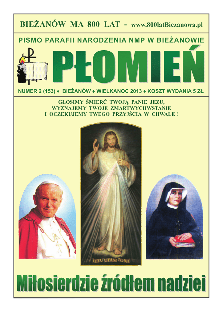BIEŻANÓW MA 800 LAT - www.800latBiezanowa.pl PISMO PARAFII NARODZENIA NMP W BIEŻANOWIE NUMER 2 (153) ♦ BIEŻANÓW ♦ WIELKANOC 2013 ♦ KOSZT WYDANIA 5 ZŁ W tym numerze: GŁOSIMY ŚMIERĆ TWOJĄ PANIE JEZU, WYZNAJEMY TWOJE ZMARTWYCHWSTANIE I OCZEKUJEMY TWEGO PRZYJŚCIA W CHWALE ! STR. 2 PŁOMIEŃ NUMER 2 (153) Z ŻYCIA PARAFII MIŁOSIERDZIE ŻRÓDŁEM NADZIEI W ramach przygotowań do NAWIEDZENIA OBRAZU MIŁOSIERDZIA BOŻEGO uczestniczyliśmy w misjach, które prowadzili Księża Sercanie. Był to bardzo ważny etap w przygotowaniu do peregrynacji. Czas misji był czasem szczególnego spotkania ze Słowem Bożym, który zapewne zostawił w wielu z nas trwały ślad odrodzonej wiary. W czasie misji mogliśmy również być świadkami historycznego wydarzenia, jakim był niewątpliwie wybór pierwszego papieża z Ameryki Południowej – FRANCISZKA. 12 kwietnia w piątek przywitamy Obraz, któremu towarzyszyć będą relikwie Św. Siostry Faustyny i Bł. Jana Pawła II. Dla całej naszej wspólnoty będzie to wydarzenie niezwykłe. Oprócz przygotowań zewnętrznych podejmijmy nade wszystko trud przygotowania duchowego, przez udział w pięknej liturgii TRIDUUM PASCHALNEGO (Wielki Czwartek, Wielki Piątek, Wielka Sobota i Wielkanoc), przez codzienną modlitwę o dobre owoce Nawiedzenia (tekst modlitwy jest zamieszczony w pamiątkowym folderze, który jest w naszych domach) a także przez konkretne czyny miłosierdzia. Gorąco zachęcam do udziału w tej uroczystości, do czuwania przed obrazem w dowolnie wybranej przez siebie porze. Zrodził się również pomysł aby konkretnym wymiarem naszego miłosierdzia, była akcja honorowego krwiodawstwa, którą chcemy zorganizować w Bieżanowie w niedzielę 21 kwietnia. O szczegółach będziemy jeszcze informować ale już dziś warto o tym pomyśleć, aby ci ,którzy mogą oddać krew bliźniemu zdecydowali się na ten niezwykły dar miłosierdzia. MODLITWA DAWCY O Jezu, Zbawicielu, który powiedziałeś: „Wszystko, co uczyniliście jednemu z tych braci moich najmniejszych Mnieście uczynili” (Mt 25,40), spójrz łaskawie na ofiarę, którą Ci składamy. Udręki cierpiących, braci Twoich naszych, pobudzają nas, abyśmy dali trochę naszej krwi, aby przywrócić im energię do życia. Chcemy jednak, aby ten dar był czyniony ze względu na Ciebie, który przelałeś swoją bezcenną krew za nas. Uczyń Panie nasze życie bogatym w dobro dla naszych bliskich, dla chorych. Umocnij nas w tym poświęceniu, aby było zawsze szlachetne, pokorne i ciche. Spraw, abyśmy z wiarą umieli odkryć Twoje oblicze w ubogich, abyśmy szybko śpieszyli im z pomocą Natchnij nasze działania i kieruj nimi płomieniem miłosierdzia, aby były one czynione w jedności z Tobą, by prowadziły nas do doskonałości i zawsze podobały się Ojcu Niebieskiemu. Niech się tak stanie. (Papież Jan XXIII) Na czas Triduum Paschalnego i przygotowań do Nawiedzenia życzę wszystkim. SZCZĘŚĆ BOŻE Ks. Proboszcz DOBA NAWIEDZENIA 12 kwietnia - piątek 17.00 – Czuwanie modlitewne w kościele w oczekiwaniu na obraz 17.30 – Procesyjne wyjście z kościoła na powitanie Obrazu 18.00 – Uroczysta Msza św. na rozpoczęcie peregrynacji z udziałem Kapłanów naszego dekanatu pod przewodnictwem Ks. Biskupa Jana Szkodonia Po Mszy św. indywidualne czuwanie do 21.00 21.00 - Msza św. o powołania kapłańskie i zakonne z udziałem Księży Rodaków oraz Kapłanów, którzy posługiwali w naszej parafii Po Mszy św. indywidualne czuwanie do 24.00 13 kwietnia - sobota 24.00 – 1.00 – Czuwanie młodzieży całej parafii pod przewodnictwem Oazy 1.00 – 2.00 – Czuwanie mieszkańców Kolonii i Łazów 2.00 – 3.00 – Czuwanie mieszkańców Gaja 3.00 – 4.00 – Czuwanie mieszkańców Kaimu 4.00 – 5.00 – Czuwanie mieszkańców Zadworza 5.00 – 6.00 – Czuwanie mieszkańców Centrum 6.30 - Msza św. 7.00 – Msza św. Po Mszach św. czuwanie indywidualne do g. 10.00 10.00 – Msza św. z udziałem chorych, niepełnosprawnych i starszych 12.00 – 13.00 – Anioł Pański i czuwanie dzieci 13.00 – 16.00 – Czuwanie indywidualne 16.00 - Godzina Miłosierdzia i Msza św. na zakończenie Nawiedzenia z Aktem Zawierzenia Parafii Bożemu Miłosierdziu i pożegnanie Obrazu 17.30 – Procesja z Obrazem do samochodu-kaplicy i przekazanie do parafii Bł. Jerzego Popiełuszki na Złocieniu NUMER 2 (153) PŁOMIEŃ STR. 3 NOWENNA PRZED ŚWIĘTEM MIŁOSIERDZIA Powiedział mi Pan, żeby tę koronkę odmawiać przez dziewięć dni przed świętem Miłosierdzia. Rozpoczynać się ma w Wieli Piątek. W tej nowennie udzielę duszom wszelkich łask. Nowenna do Miłosierdzia Bożego, którą mi kazał Jezus napisać i odprawiać przed świętem Miłosierdzia rozpoczyna się w Wielki Piątek. Pragnę, abyś przez te dziewięć dni sprowadziła dusze do zdroju mojego miłosierdzia, by zaczerpnęły siły i ochłody, i wszelkiej łaski, jakiej potrzebują na trudy życia, a szczególnie w śmierci godzinie. W każdym dniu przyprowadzisz do serca mego odmienna grupę dusz i zanurzysz je w tym morzu miłosierdzia mojego. A ja te wszystkie dusze wprowadzę w dom Ojca mego. Czynić to będziesz w tym życiu i w przyszłym. I nie odmówię żadnej duszy niczego, którą wprowadzisz do źródła miłosierdzia mojego. W każdym dniu prosić będziesz Ojca mojego prze gorzką mękę moją o łaski dla tych dusz. I odpowiedział mi Jezus, że powie mi na każdy dzień, jakie mam dusze wprowadzić w Serce Jego. Dzień pierwszy. Dziś sprowadź mi ludzkość całą, a szczególnie wszystkich grzeszników, i zanurzaj je w morzu miłosierdzia mojego. A tym pocieszysz mnie w gorzkim smutku w jaki mnie pogrąża utrata dusz. Dzień drugi. Dziś sprowadź mi dusze kapłańskie i dusze zakonne, i zanurz je w niezgłębionym miłosierdziu moim. One dały mi moc przetrwania gorzkiej męki, przez nich jak przez kanały spływa na ludzkość miłosierdzie moje. Dzień trzeci. Dziś sprowadź mi wszy