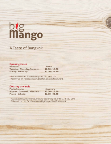 A Taste of Bangkok Opening times Monday : Tuesday - Thursday, Sunday : Friday - Saturday : Closed 12.00 - 19.30 12.00 - 21.30 • For reservations & take-away call 731 667 201 • Follow us on Facebook.com/BigMango.ThaiRestaurant Godziny otwarcia Poniedziałek : Wtorek - Czwartek, Niedziela : Piątek - Sobota : Nieczynne 12.00 - 19.30 12.00 - 21.30 • Rezerwacje i zamówienia prosimy dzwonić pod nr tel 731 667 201 • Odwiedź nas na Facebook.com/BigMango.ThaiRestaurant Restauracja tajska w Bronowicach! Zainspirowana naszymi podróżami. Tajska dyrektor kreatywna i polska stewardessa. Wspólnie zwiedziłyśmy niemal cały świat w pogonii za inspirującym smakiem … Kuchnia tajska cieszy sie WSZĘDZIE niesamowitym powodzeniem…coś w tym musi być…Przyjdź i rozsmakuj się w aromatycznej kolendrze, trawie cytrynowej, gorącym chili.. Big Mango to więcej niż kulinarna podróż, to także klimat i atmosfera, którą tworzymy dla Was z tęsknoty do Tajlandii. Przyjdź i odkryj street food Bangkoku! Zapraszamy i czekamy na Ciebie! Kuchnia tajska to nieprzebrane bogactwo smaków. Szczególny naciskł kładzie się na łączenie pięciu smaków - słodkiego, kwaśnego, słonego, gorzkiego i ostrego. Słodycz pochodzi od kokosów, trzciny cukrowej, ananasów. Kwaśny - cytryna bądź limonka, pasta z tamaryndowca. Słone doznania zapewnia oprócz soli sos rybny ( nam plaa). Gorzki ogórek (ma-ra) i melon to źródło gorzkiego. A słynna tajska papryczka pali solidnie swoją ostrością. W tajskich restauracjach najczęściej jada się w dużym gronie. Dzieje się tak ze wzgędów towarzyskich. Wspólna biesiada to możliwość spędzenia czasu ze sobą w spokojnej i miłej atmosferze. Dzięki licznemu gronu, każdy może spróbować wielu potraw, próbując danie kogoś innego. Do tego też zachęamy Was nasi drodzy goście, dzielcie się swoimi daniami, próbujcie nowych smaków razem, przy jednym stole. My, w naszej restauracji chcemy zawrzeć w naszych potrawach te wszytkie smaki. Kładziemy duży nacisk na świeżość produktów i schludnośc przygotowania potraw. Te wszytkie elementy jedna z właścicielek wyniosła z domu, z tajskiego domu. W samym procesie jedzenia, używa się głównie widelca i łyżki, widelec trzyma się w prawej dłoni i jego końcem nakłada się potrawę na łyżkę, którą to wkłada się do buzi. Nóż przy stole jest praktycznie niepotrzebny, bo większość potraw jest pokrojona w kuchni na małe kawałki. Jeżeli chodzi o pałeczki, używa się ich naprawdę sporadycznie. Gdy skończymy jeść warto odłożyć razem złożone sztućce na talerz na godzinę 4:20, to sygnał, że nie chcemy już więcej zamawiać i że nasz posiłek dobiegł końca. Restauracja Big Mango umożliwia obserwowanie kucharza podczas pracy, podczas przygotowywania zamówionych posiłków. Chcemy pokazac Wam, ze jedzenie tajskie to przede wszystkim autentyczne, odpowiednie skladniki, reszta nie jest trudna! Chetnie doradzimy też jak przyrzadzic Wasze ulubione dania w domu! Wkrótce pojawią sie kolejne ciekawostki dotyczące produktów prosto z Tajlandii. Także zaglądajcie do nas często. Happy Hour ! 10% discount Happy Hour ! Promocja 10% Happy Hour! Happy Hour! Now from Tuesday to Friday between 12.00 - 16.00 your lunch is going to be 10% cheaper! This promotion is for all main courses. Twój lunch od wtorku do piątku miedzy 12.00 - 16.00 o 10% tańszy! Promocja obejmuje wszystkie dania główne. Terms & Conditions 1. The promotion is for Tuesday, Wednesday, Thursday, Friday. 2. Order and payment time must be between 12.00 - 16.00 only. 3. Promotion doesn't include soups, appetizers, salads, desserts, drinks, lunch sets and take-away packaging. 4. Promotion is valid untill 31.12.2015. Warunki promocji 1. Promocja obejmuje wtorki, środy, czwartki i piątki. 2. Zamówienie oraz płatność należy dokonać pomiędzy godz.12.00 - 16.00. 3. Promocja nie obejmuje zup, przystawek, sałatek, deserów, napojów, zestawów lunchowych oraz opakowań wynosowych. 4. Promocja trwa do 31.12.2015r. • Green & Red Curry has now a choice of rice pasta. • Zielone i czerwone curry teraz dostępne z makaronem ryżowym. 5 zł 150 g. • Limited menu: please check availibility before you order. • Danie limitowane: prosimy sprawdzić dostępność przed zamówieniem. ปอเปยะทอดผัก Po Pia Thot Pak • Vegetable spring rolls served with homemade sweet and sour sauce. • Spring rolls’y podawane z domowym sosem słodko-kwaśnym. 18 zł 160 g. • Limited menu: please check availibility before you order • Danie limitowane: prosimy sprawdzić dostępność przed zamówieniem สมตำไทย Som Tam Thai • Green papaya and carrot salad with dried shrimp and roasted peanuts. • Tajska Sałatka z Zielonej Papaji z suszonymi krewetkami i prażonymi orzeszkami ziemnymi. 33 39 380 g. 440 g. zł zł ยำตะไคร Yum Takrai • Lemongrass salad. • Sałatka z trawą cytrynową. 20 26 230 g. 310 g. zł zł 100% PURE COCONUT MILK MLECZKO KOKOSOWE • Eat Original: Recommended to eat with rice as a main course • Jedz jak Taj: Polecamy jeść z ryżem jako danie główne ตมขาไก Tom Kha Kai • A spicy and sour hot soup with coconut milk and galangal. Served with fresh lemongrass and kaffir lime. • Ostro-kwaśna zupa z mleczkiem kokosowym i galangalem. Podawana ze świeżą trawą cytrynową i liśćmi kafiru. 24 25 400 g. 400 g. zł zł 4 zł Jasmine rice - Ryż jaśminowy 150 g. ตมยำ Tom Yum • Spicy lemongrass soup. • Pikantna zupa z trawą cytrynową. 19 20 23 400 g. 400 g. 400 g. zł zł zł 100% PURE COCONUT MILK MLECZKO KOKOSOWE • Eat Original: Recommended to eat as a main course. • Jedz jak Taj: to danie polecamy jeść jako danie główne. กวยเตี๋ยวตมยำรวมมิตร Kuy Teav Tom Yum Ruam Mit • Rice Noodles with creamy Tom Yum soup and shrimps, chicken, egg, peanuts, lemongrass, kaf