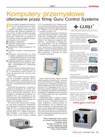 raport prezentacje Komputery przemysłowe oferowane przez firmę Guru Control Systems P rzez termin „komputery przemysłowe” powszechnie rozumie się komputery przystosowane do pracy w ciężkich warunkach środowiskowych. Tymczasem jako definicję należałoby raczej przyjąć: wszelkie urządzenia komputerowe nieprzeznaczone do zastosowań biurowych i domowych. Po przyjęciu takiej definicji można wyodrębnić następujące kategorie tych wyrobów: ● komputery wbudowane ● sterowniki przemysłowe o otwartej architekturze komputerów ● jednopłytkowe układy komputerów AllIn-One ● komputery sterujące i monitorujące procesy ● komputery przystosowane do pracy w ciężkich warunkach środowiskowych – w halach produkcyjnych, na zewnątrz, w pojazdach, kopalniach, na polu walki ● komputery panelowe do zabudowy w kioskach informacyjnych, punktach sprzedaży, samoobsługowych urządzeniach usługowych. Oczywiście poszczególne kategorie zachodzą na siebie np. komputer podróżny w samochodzie można zaliczyć zarówno do pierwszej jak czwartej i piątej kategorii. Firma Guru Control Systems specjalizuje się w produkcji, integracji i dystrybucji komputerów przemysłowych we wszystkich wymienionych kategoriach jak również w dystrybucji podzespołów do ich budowy. Sterowniki przemysłowe o otwartej architekturze komputerów PC zostały omówione w naszym artykule w numerze styczniowym miesięcznika Elektronik. Są to urządzenia o modułowej konstrukcji sterowników PLC, ale o architekturze i sposobie programowania komputerów PC. Nasza firma oferuje duży wybór jednostek centralnych oraz modułów we-wy. Do zastosowań wbudowanych oferujemy całą gamę komputerów jednopłytkowych począwszy od miniaturowego standardu PC/104 o wymiarach płytki 90mm x 96mm, przez nieco większy Wafer (o wymiarach dysku 3,5”), bardzo uniwersalny Epic (NANO) o wymiarach 115mm x 165mm, średni Nova (wymiary napędu 5,25”), po największy Pos. Mogą one pracować pod kontrolą każdego systemu operacyjnego przeznaczonego dla komputerów PC. Niektóre z nich są także oferowane z systemem Windows CE. Na bazie oferowanych przez nas kart pomiarowych, akwizycji danych, wejść-wyjść cyfrowych, analogowych, przekaźnikowych, interfejsów GPIB, CAN, akwizycji obrazów itp. budujemy komputery przemysłowe – monitorujące i sterujące procesy przemysłowe. Są one montowane w obudowach 19”, panelowych, walizkowych, naściennych, wolnostojących. Zajmujemy się także dystrybucją takich kart, obudów, zasilaczy AC-DC, DC-DC, redundant, monitorów i klawiatur do pracy w ciężkich warunkach. Guru Control Systems oferuje również gamę komputerów panelowych – przeznaczonych do zabudowy w pulpitach sterowniczych maszyn i urządzeń, pojazdach, kioskach informacyjnych itp. Są wersje z monitorem LCD o przekątnej od 6,4” do 19”. Od bardzo małych i płaskich, pracujących bez wentylatora, do dużych w których można instalować standardowe karty rozszerzeń PCI. Każdy model może być wyposażony w ekran dotykowy. Produkujemy także, w oparciu o własną, specjalną konstrukcję, komputer przemysłowy do pracy w warunkach bardzo wysokiej wilgotności, zanieczyszczenia, niskich temperatur. Ma on całkowicie hermetyczną obudowę ze stali szlachetnej, specjalny system odprowadzania ciepła. Znajduje zastosowanie głównie w zakładach spożywczych, przetwórstwa mięsa itp. Inny wariant tego komputera przeznaczony jest do pracy w samochodach. Więcej informacji można znaleźć na stronach internetowych firmy: www.guru.com.pl Kontakt: tel. 022 831 10 42, e-mail: [email protected] Krzysztof Andrzej Kamiński Guru Control Systems Elektronik | KWIECIEŃ, 2006 45