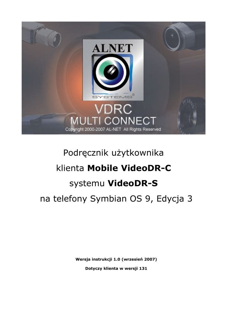 Podręcznik użytkownika klienta Mobile VideoDR-C systemu VideoDR-S na telefony Symbian OS 9, Edycja 3 Wersja instrukcji 1.0 (wrzesień 2007) Dotyczy klienta w wersji 131 Spis treści 1. Wstęp ................................................................................................................................3 1.1 Opis systemu 3 2. Uruchamianie i opis interfejsu programu......................................................................4 3. Obsługa programu...........................................................................................................5 3.1 Podstawowe opcje 3.2 Nawiązanie połączenia 3.3 Dodatkowe opcje podczas połączenia 3.4 Zarządzanie książką adresową 3.4.1 Dodawanie nowego wpisu do książki adresowej 3.4.2 Zmiana wpisu w książce adresowej 3.4.3 Usuwanie wpisu z książki adresowej 3.4.4 Zmiana pozycji wpisu w książce adresowej 3.5 Wybór kamery 3.6 Ustawienia jakości i limitu transferu danych 3.7 Sterowanie wyjściami przekaźnikowymi 3.8 Podgląd stanów wejść alarmowych 3.9 Dostęp do nagrań archiwalnych 3.10 Sterowanie głowicą obrotową 3.11 Fullscreen 3.12 Zoom 3.13 Okienko „About” 3.14 Wyjście z programu 5 6 7 8 8 9 10 10 11 11 13 13 14 16 17 18 20 21 4. Kontakt............................................................................................................................22 Strona 2 1. Wstęp 1. WSTĘP Przedstawiamy państwu kolejną wersję systemu VDRS – VDRS PROFESSIONAL. Pojawia się w niej wiele nowych funkcji i modułów. Wiele z tych zmian jest efektem naszej współpracy z Państwem oraz naszymi Partnerami. Część z nich to nasze pomysły rozszerzające możliwości cyfrowej rejestracji obrazu video. Szczególną uwagę pragniemy zwrócić na jednoczesną możliwość rejestracji obrazu z kamer cyfrowych jak i dotąd szeroko wykorzystywanych kamer analogowych, usprawnione archiwum oraz szersze możliwości kontroli nad całym systemem cyfrowej rejestracji. 1.1 OPIS VDRS SYSTEMU PRO jest cyfrowym rejestratorem video przeznaczonym do współpracy z kamerami telewizji przemysłowej. Do pracy wykorzystuje komputery klasy PC pracujące pod kontrolą systemów operacyjnych Microsoft Windows XP®. Nowa wersja systemu może rejestrować obraz z maksymalnie 64 kamer oraz 16 kanałów dźwiękowych, obsługując przy tym 16 zdalnych przełączników oraz 16 wejść alarmowych. Ponadto system jest hybrydowy, tzn. umożliwia jednoczesną obsługę kamer analogowych oraz kamer sieciowych – dzięki temu możliwa jest prosta rozbudowa istniejącej instalacji o dodatkowe kamery analogowe oraz sieciowe. Możliwe jest zarządzanie video serwerem poprzez sieć komputerową. Program dopuszcza szerokie możliwości ustawienia detekcji ruchu, wyszukiwanie ruchu w archiwach, obsługę zdarzeń alarmowych. Różnicowa metoda kompresji obrazu pozwala na dłuższe, niż w innych systemach tego typu, zapisywanie obrazu nie zmieniając przy tym jakości obrazu oraz wielkości zajmowanego miejsca. Oprogramowanie służące do obsługi systemu VDRS PRO składa się z dwóch niezależnych aplikacji: 1. VDR-S (Video Digital Recording - Server) 2. VDR-C (Video Digital Recording – Client) Pierwszy program pełni rolę serwera: przetwarza obraz z kamer, zarządza użytkownikami, zadaniami, steruje pracą kamer. Druga aplikacja służy jako klient. Dzięki niej możemy podłączyć się do serwera poprzez sieć komputerową i przeprowadzać zdalny monitoring. Aplikacja kliencka dostępna jest na urządzanie mobilne (telefony komórkowe, PocketPC) co daje możliwość dostępu do obrazu z kamer z każdego miejsca na Ziemi. Strona 3 2. Uruchamianie i opis interfejsu programu 2. URUCHAMIANIE I OPIS INTERFEJSU PROGRAMU Program został napisany pod system operacyjny Symbian 9, edycja 3 i działa z telefonami komórkowymi opartymi o ten system (np. Nokia seria E oraz N). Niniejsza instrukcja obsługi została napisana w oparciu o program w wersji 131 zainstalowany na telefonie Nokia N80. Program można pobrać bezpłatnie ze strony www.alnetsystems.com – po skopiowaniu na telefon komórkowy, program jest gotowy do uruchomienia. W tym celu należy z głównego menu wybrać ikonę VDRC . Po uruchomieniu, pojawi się główne okno programu Nazwa kamery Wskaźnik połączenia Wskaźnik wykrycia ruchu (podany jest nr kamery, na której został wykryty ruch). Aktualny transfer podany w FPS (klatki / sek.) Wskaźnik wysyłania (▲) / odbierania (▼) danych Ekran używany jest do wyświetlania obrazów z kamer Rysunek 1: Główne okno programu 1. Options 2. Back – wybór dostępnych opcji programu – przejście do poprzedniego ekranu (użycie przycisku w głównym oknie spowoduje zakończenie działania programu) Strona 4 3. Obsługa programu 3. OBSŁUGA PROGRAMU 3.1 PODSTAWOWE OPCJE Po uruchomieniu programu, w głównym oknie mamy do wyboru następujące opcje: Rysunek 2: Podstawowe opcje programu ● Connect – wybór serwera VDRS z książki adresowej i nawiązanie połączenia z wybranym serwerem ● Settings ● About ● Exit – dodatkowe ustawienia programu – informacje o wersji programu, producencie, etc. – zakończenie działania programu Wyboru dokonujemy przy pomocy joysticka i naciśnięciu Select. Przycisk Cancel powoduje powrót do poprzedniego menu bez wprowadzania zmian. Strona 5 3. Obsługa programu 3.2 NAWIĄZANIE POŁĄCZENIA Wybór opcji Connect wywoła książkę adresową z listą serwerów VDRS. Ten sam efekt można uzyskać poprzez wciśnięcie środkowego przycisku joysticka w menu głównym programu. Wyboru serwera z listy dokonujemy przy pomocy joysticka oraz zatwierdzamy wybór poprzez wciśnięcie środka przycisku joysticka Po wybraniu serwera z listy, pojawi się monit o wybór połączenia internetowego. Połączenie powinno być skonfigurowane zgodnie z zaleceniami operatora GSM. Należy wybrać rodzaj połączenia z listy i nacisnąć przycisk Select lub środkowy przycisk joysticka. Wid