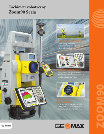 Tachimetr robotyczny Zoom90 Seria W PEŁNI AUTOMATYCZNY • Daleki zasięg Bluetooth® • Napędy hybrydowe X-Motion ™ • Układ jednoosobowy OTWARTY WINDOWS CE NOWOCZESNE ROZWIĄZANIA • STReAm360: Scout-TRack-AiM • Zasięg 1000 m (bezreflektorowy) • Dokładne przechwytywanie ZOOM90 • Elastyczność oprogramowania • Pełna funkcjonalność Windows CE • Możliwość pełnego VGA NAJWYŻSZY TECHNOLOGIA, NAJWYŻSZA WYDAJNOŚĆ Minimalizuje czas każdego zadania badania i zwiększa wydajność i dokładność do maksimum.Zoom 90 wyróżniają m.in. lepsze serwomotory xMotion, których sprawność zwiększono o 20%,wbudowane oprogramowanie xPAD (współpracujące z zestawami GNSS-RTK) oraz udoskonalone opcje wymiany danych (poprzez karty SD, Bluetooth oraz USB), rozszerzony pomiar bez reflektora, STReAM360, technologii accXess i Windows CE otwartej łączności. STReAM360: W PEŁNI ROBOTYCZNY Scout : Skanuje cały obszar pracy w ciągu kilku sekund, aby szybko znaleźć cel. TRack : Stałe śledzenie pryzmatu.Po zablokowaniu przyrząd pozostaje dokładnie skierowany na ruchomej tarczy. AiM : Najwyższa precyzja celowaniana pryzmat - za każdym razem, w każdym warunkach z tą samą wysoką dokładnością. NAPĘD HYBRYDOWY X-Motion ™ Zoom 90 posiada wysoce innowacyjny napęd hybrydowy, dzięki czemu odznacza się wysoką wydajnością w porównaniu do konwencjonalnych automatycznych napędów. TECHNOLOGIA accXess™ EDM Technologia Geomax accXess™ EDM zapewnia prowadzenie pomiarów bez reflektora do 1000 m. Wyjątkowo niewielkie rozmiary lasera i zaawansowana technologia przetwarzania sygnału,zapewniają dokładność bez względu na odległość lub warunki. NavLight™ Wyposażone standardowo w teleskop, NavLight™ jest skuteczną pomocą w wyrównaniu, przyczyniając się do przyspieszenia prac podczas ustawiania. Jego czerwone i żółte migające światła poprowadzi Cię szybko i dokładnie do celu. PEŁNA ŁĄCZNOŚĆ Zoom90 spełnia wszystkie potrzeby jeśli chodzi o łączność. Wysoka wydajność i daleki zasięg Bluetooth® jednoosobowej, zrobotyzowanej stacji . Przechowywanie danych - bardzo dużą pamięć wewnętrzną, na karcie SD lub wymiennym dysku USB za pomocą technologii plug and play. WYTRZYMAŁOŚĆ Instrumenty GeoMax są zbudowane, tak aby wytrzymać w najtrudniejszych warunkach.Zoom90 został zaprojektowany i przetestowany, pyłoszczelny i całkowicie zabezpieczony przed strumieniami wody. NIEZAWODNA ŁĄCZNOŚĆ Połączenie preferowanego oprogramowania z rejestratorem danych daje zdalne wykonywanie zadań kontrolnych o zwiększonej wydajności.Zoom90 korzysta z systemu operacyjnego Windows CE,która pozwala uruchamiać oprogramowania w polu, oferując swobodę wyboru oprogramowania, które najlepiej odpowiada Twoim potrzebom. Pełny VGA kolorowy wyświetlacz dotykowy to najwyższa wydajność i możliwości graficzne. 50°c -20°c Zoom90 Seria Jednoosobowy ,zautomatyzowany tachimetr spełnia Twoje wszystkie potrzeby. GeoMax Zoom90 Robotic (R) Scout TRack AiM ü ü ü ü ü ü ü ü ü GeoMax Zoom90 Servo (S) POMIARY KĄTA Dokładność NavLight ™ 1 "(0,3 mgon), 2" (0,6 mg), 5 "(1,5 mgon) Rozdzielczość wyświetlacza 0,1 "(0,1 mg) Absolutna, ciągła, diametryczna Metoda Kompensator Czteroosobowy LUNETA Powiększenie 30 x POMIAR ODLEGŁOŚCI Zasięg Dokładność Czas Tryb standardowy: 3500 m / 1 mm + 1,5 ppm / typ. 0,8 s * Tryb Long: 10000 m / 5 mm + 2 ppm / typ. 2,5 s POMIAR BEZLUSTROWY Zasięg accXess5/ accXess10 500 m / 1000 m Dokładność 2 mm + 2 ppm** Czas typ. 3 sec Dokładne przechwytywanie 8 x 20 mm na 50 m ZMECHANIZOWANIE Technologia Hybrid Drives Scout Zasięg TRack Zasięg Prędkość 300m w rundzie pryzmat 800m w rundzie pryzmat 90 km / h przy 100 m AiM Zasięg 1000m w rundzie pryzmat Dokładność Hz / V 1 " Przetwarzanie obrazu * Tryb szybki; **> 500 m: 4 mm + 2 ppm; *** Pojedynczy pomiar co 30 sekund w temperaturze 25 ° C czas baterii może być krótszy w zależności od warunków. 5 m na 150 m Zasięg Dokładność 5 cm na 150 m INTERFACE Klawiatura dwustronna, liczba klawiszy-35,oświetlenie (2 opcja) Wyświetlacz kolorowy, dotykowy, z podświetleniem LED,rozmiar 640x480 Pojemność pamięci wewnętrznej – 1GB, Typ pamięci zewnętrznej- SD, pendrive, Rejestracja danych Wymiana danych System operacyjny RS-232, USB, Bluetooth (klasa 2 i dalekiego zasięgu),zasilanie zewnętrzne Windows CE 6.0 DANE TECHNICZNE Waga 5,0 - 5,3 kg (z baterią) Temperatura pracy / - 20 ° C do 50 ° C / -40 ° C do + 70 ° C przechowywania IP55 Norma pyło- i wodoszczelności Klasa ochrony Wilgotność 95%, bez kondensacji BATERIA WEWNĘTRZNA Wewnętrzny akumulator litowo-jonowy wymienny 4,4 Ah / 7,4 V Czas pracy 7-10 h *** SONDA Rodzaj Dokładność Wskaźnik laserowy, z regulacją jasności 1,5 mm na 1,5 m wysokości instrumentu Prawa autorskie GeoMax AG. Ilustracje, opisy i specyfikacji technicznych nie są wiążące i mogą ulec zmianie. Wszystkie znaki towarowe i nazwy handlowe należą do ich właścicieli. Dalmierz (tryb reflektora): Laser klasy 1 zgodnie z normą IEC 60825-1. EN 60825-1; Pion laserowy: Klasa lasera 2 zgodnie z normą IEC 60825-1. EN 60825-1; Dalmierz (tryb reflektora): Klasa lasera 3R zgodnie z IEC 60825-1. EN 60825-1. GeoMax jest międzynarodową firmą z siedzibą w Europie, która rozwija, produkuje i dystrybuuje geodezyjny i budowlany sprzęt, works when you do. Nasza kompleksowa oferta produktów zawiera łatwe w użyciu i wydajne całkowite systemy stacje, GPS / GNSS, skanery laserowe, rejestratory, oprogramowania ELD, poziomy optyczne i cyfrowe, lasery, naprowadzania maszyny i lokalizacji kabli i akcesoriów, wszystko w najlepszym stosunku ceny do wydajności. www.geomax-positioning.com GEOMAX AUTHORIZED DISTRIBUTION PARTNER