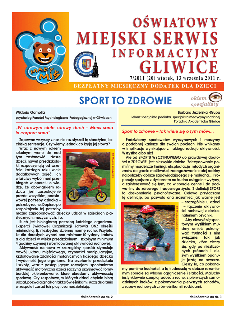 7/2011 (20) wtorek, 13 września 2011 r. BEZPŁATNY MIESIĘCZNY DODATEK DLA DZIECI SPORT TO ZDROWIE Wiktoria Gomolla okiem specjalisty Barbara Jezierska -Krupa psycholog Poradni Psychologiczno-Pedagogicznej w Gliwicach lekarz specjalista pediatra, specjalista medycyny rodzinnej Poradnia Akademicka Gliwice Zapewne wszyscy z nas nie raz słyszeli tę starożytną, łacińską sentencję. Czy wiemy jednak co kryją jej słowa? Wraz z nowym rokiem szkolnym warto się nad tym zastanowić. Nasze dzieci, nawet przedszkolaki, rozpoczynają od września każdego roku wiele dodatkowych zajęć. Ich właściwy wybór musi przebiegać w oparciu o wiedzę, że obowiązkiem rodzica jest zaspokojenie przede wszystkim, podstawowej potrzeby dziecka – potrzeby ruchu. Dopiero po zaspokojeniu tej potrzeby można zaproponować dziecku udział w zajęciach plastycznych, muzycznych, itp. Ruch jest biologiczną potrzebą ludzkiego organizmu. Eksperci Światowej Organizacji Zdrowia ONZ określili minimalną, tj. niezbędną dzienną normę ruchu. Przyjęto, że dla dorosłych wynosi ona minimum10 tysięcy kroków a dla dzieci w wieku przedszkolnym i szkolnym minimum 4 godziny czynnej i zróżnicowanej aktywności ruchowej. Aktywność ruchowa w szczególny sposób stymuluje rozwój układu mięśniowego, czynności manipulacyjne, kształtowanie zdolności motorycznych każdego dziecka i wydolność jego organizmu. Na przełomie przedszkola i szkoły, wraz z postępującym rozwojem, spontaniczna aktywność motoryczna dzieci zaczyna przyjmować formy bardziej ukierunkowane, które określamy aktywnością sportową. Gry zespołowe, w których dzieci chętnie biorą udział, pozwalają na kontakt z rówieśnikami, uczą działania w zespole i zasad fair play, usamodzielniają. Podziwiamy sportowców wyczynowych i marzymy o podobnej karierze dla swoich pociech. Nie wnikamy w implikacje wynikające z takiego rodzaju aktywności. Wszystko albo nic! Ale od SPORTU WYCZYNOWEGO do prawdziwej dbałości o ZDROWIE jest niezwykle daleko. Zdecydowanie pomińmy mordercze treningi, eksploatację młodych organizmów do granic możliwości, zaangażowanie całej rodziny na potrzeby dobrze zapowiadającego się malucha.... Proponuję spojrzeć z dystansem na trudno osiągalne wyżyny, a zainteresować się tym, co w sporcie cenne i da podwa-liny do zdrowego i radosnego życia. Z definicji SPORT to doskonalenie psychofizyczne. Celowo przytaczam tę definicję, bo pozwala ona zrozumieć jak ważne jest – szczególnie u dzieci – łączenie aktywności ruchowej z doskonaleniem psychiki. Aby cieszyć się sportowym wysiłkiem musimy umieć pokonywać trudności z nim związane. Tak jak dziecko, które cieszy się, gdy po niezliczonych próbach i dużym wysiłkiem opanuje jazdę na rowerze. Cieszy to, co pokonamy pomimo trudności, a tą trudnością w dobrze rozumianym sporcie są własne ograniczenie i słabości. Maluchy instynktownie czerpią radość z ruchu, z pierwszych samodzielnych kroków, z pokonywania pierwszych schodów, z zabaw ruchowych z rówieśnikami i rodzicami. dokończenie na str. 2 fot. Monika Seredyńska Sport to zdrowie – tak wiele się o tym mówi... fot. Monika Seredyńska „W zdrowym ciele zdrowy duch – Mens sana in corpore sano” dokończenie na str. 3 Dokończenie ze str. 1 Piłka nożna dzieci – co jest priorytetem? Nad tym pytaniem często nikt z nas się nie zastanawia, nie zostaje one postawione na początku przygody naszych maluchów ze sportem. Warto jednak chwilę się nad tym zastanowić. Dlaczego posyłamy nasze dzieci na zajęcia sportowe w wieku 4 – 6 lat? Co chcemy przez to osiągnąć? Czy chcemy dać radość dziecku, czy może zaspokoić własne ambicje? Postarajmy się usystematyzować najważniejsze informacje i ustalić priorytety, którymi powinni się kierować prowadzący zajęcia z dziećmi trenerzy oraz my, rodzice, przy wyborze odpowiedniej szkółki piłkarskiej. Najważniejsze jest uświadomienie sobie różnic pomiędzy 4 – 6-latkami, a ich o kilka lat starszymi kolegami. Podstawową różnicą jest stopień rozwoju fizycznego dziecka. Organizm 4-latka cały czas jest w stanie rozwoju, jego aparat kostny, mięśniowy czy więzadłowy jest jeszcze niezwykle plastyczny, dąży do osiągnięcia swojej pełni za kilka lat. Niewłaściwe prowadzenie zajęć może doprowadzić do niekorzystnych zmian w tych układach, dlatego kluczowe jest dostosowanie wykorzystywanego sprzętu do potrzeb i możliwości dzieci w wieku najmłodszym oraz taki dobór ćwiczeń, by stymulowały one poprawny rozwój. Zajęcia prowadzone w sposób prawidłowy wykorzystują przede wszystkim odpowiednie do wieku piłki – powinny być np. gumowe, z gąbki, tenisowe czy też o rozmiarze niestanrada dardowym (np. 2, 3). Po Fizjoterapeuty Korzystając ze standardowego sprzętu dla młodzieży i dorosłych, tylko wyrządzamy krzywdę niedostatecznie rozwiniętemu układowi kostnemu dzieci – to ogromny błąd. Równie istotny jest dobór ćwiczeń – nie możemy poddawać dzieci obciążeniom nieadekwatnym do ich wieku, powinniśmy skupić się głównie na grach i zabawach zawierających elementy np. gry w piłkę nożną. W wieku najmłodszym powinniśmy kształtować głównie motorykę dziecka, prowadzić ćwiczenia poprawiające gibkość, zwinność, kształtujące prawidłowe nawyki ruchowe. Zarówno prowadzący zajęcia, jak i rodzice muszą stawiać dobro dziecka na pierwszym miejscu. Nie wprowadzajmy atmosfery napięcia, niepotrzebnej, niezdrowej rywalizacji. Zastanówmy się, czy warto w tak młodym wieku angażować dzieci w niepotrzebne na tym etapie rozgrywki wywołujące stres. Pamiętajmy, że u dziecka najważniejsze jest zaszczepienie pasji do sportu, pokazanie mu, jak dużą radość może czerpać z tych zajęć. Skupmy się na dobrej zabawie, na całą resztę przyjdzie czas. Tomasz Pyszny, fizjoterapeuta e-mail: [email protected] SŁOWNIK „Małego Misia” Zuzia i Szymo
