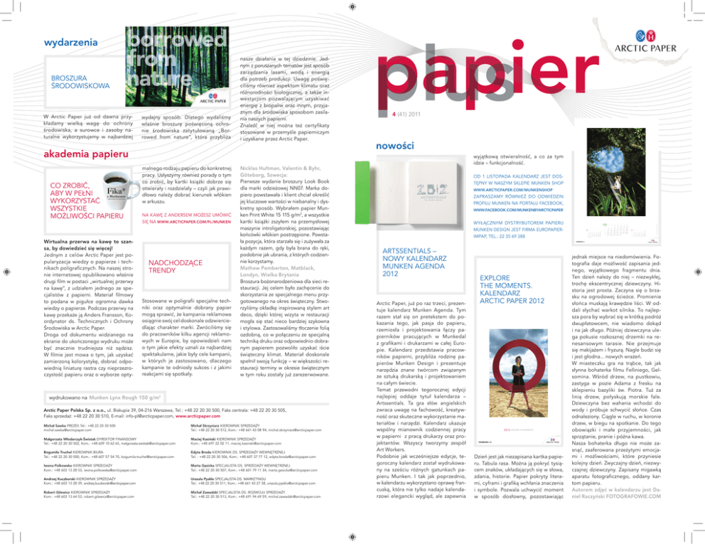 wydarzenia BROSZURA ŚRODOWISKOWA W Arctic Paper już od dawna przykładamy wielką wagę do ochrony środowiska, a surowce i zasoby naturalne wykorzystujemy w najbardziej wydajny sposób. Dlatego wydaliśmy właśnie broszurę poświęconą ochronie środowiska zatytułowaną „Borrowed from nature”, która przybliża nasze działania w tej dziedzinie. Jednym z poruszanych tematów jest sposób zarządzania lasami, wodą i energią dla potrzeb produkcji. Uwagę poświęciliśmy również aspektom klimatu oraz różnorodności biologicznej, a także inwestycjom pozwalającym uzyskiwać energię z biopaliw oraz innym, przyjaznym dla środowiska sposobom zasilania naszych papierni. Znaleźć w niej można też certyfikaty stosowane w przemyśle papierniczym i uzyskane przez Arctic Paper. akademia papieru CO ZROBIĆ, ABY W PEŁNI WYKORZYSTAĆ WSZYSTKIE MOŻLIWOŚCI PAPIERU nowości wyjątkową otwieralność, a co za tym idzie – funkcjonalność. malnego rodzaju papieru do konkretnej pracy. Usłyszymy również porady o tym co zrobić, by kartki książki dobrze się otwierały i rozdzielały – czyli jak prawidłowo należy dobrać kierunek włókien w arkuszu. NA KAWĘ Z ANDERSEM MOŻESZ UMÓWIĆ SIĘ NA WWW.ARCTICPAPER.COM/PL/MUNKEN NADCHODZĄCE TRENDY Stosowane w poligrafii specjalne techniki oraz optymalnie dobrany papier mogą sprawić, że kampania reklamowa osiągnie swój cel doskonale odzwierciedlając charakter marki. Zwróciliśmy się do pracowników kilku agencji reklamowych w Europie, by opowiedzieli nam o tym jakie efekty uznali za najbardziej spektakularne, jakie były cele kampanii, w których je zastosowano, dlaczego kampanie te odniosły sukces i z jakimi reakcjami się spotkały. Nicklas Hultman, Valentin & Byhr, Göteborg, Szwecja: Pierwsze wydanie broszury Look Book dla marki odzieżowej NN07. Marka dopiero powstawała i klient chciał określić jej kluczowe wartości w niebanalny i dyskretny sposób. Wybrałem papier Munken Print White 15 115 g/m2, a wszystkie kartki książki zszyłem na przemysłowej maszynie introligatorskiej, pozostawiając końcówki włókien postrzępione. Powstała pozycja, która starzała się i zużywała za każdym razem, gdy była brana do ręki, podobnie jak ubrania, z których codziennie korzystamy. Mathew Pemberton, Matblack, Londyn, Wielka Brytania Broszura bożonarodzeniowa dla sieci restauracji. Jej celem było zachęcenie do skorzystania ze specjalnego menu przygotowanego na okres świąteczny. Stworzyliśmy okładkę inspirowaną stylem art deco, dzięki której wizyta w restauracji mogła się stać nieco bardziej szykowna i stylowa. Zastosowaliśmy tłoczenie folią ozdobną, co w połączeniu ze specjalną techniką druku oraz odpowiednio dobranym papierem pozwoliło uzyskać iście świąteczny klimat. Materiał doskonale spełnił swoją funkcję – w większości restauracji terminy w okresie świątecznym w tym roku zostały już zarezerwowane. wydrukowano na Munken Lynx Rough 150 g/m2 Arctic Paper Polska Sp. z o.o., ul. Biskupia 39, 04-216 Warszawa, Tel.: +48 22 20 30 500, Faks centrala: +48 22 20 30 505, Faks sprzedaż: +48 22 20 30 510, E-mail: [email protected], www.arcticpaper.com Michał Sawka PREZES Tel.: +48 22 20 30 500 [email protected] Michał Skrzyniarz KIEROWNIK SPRZEDAŻY Tel.: +48 22 20 30 512, Kom.: +48 661 43 08 94, [email protected] Małgorzata Włodarczyk-Świstak DYREKTOR FINANSOWY Tel.: +48 22 20 30 502, Kom.: +48 609 10 62 65, [email protected] Maciej Kasiński KIEROWNIK SPRZEDAŻY Kom.: +48 697 22 02 11, [email protected] Bogumiła Truchel KIEROWNIK BIURA Tel.: +48 22 20 30 500, Kom.: +48 607 57 54 70, [email protected] Edyta Broda KIEROWNIK DS. SPRZEDAŻY WEWNĘTRZNEJ Tel. : +48 22 20 30 506, Kom.: +48 607 37 77 12, [email protected] Iwona Polkowska KIEROWNIK SPRZEDAŻY Kom.: +48 603 13 28 53, [email protected] Marta Gęsicka SPECJALISTA DS. SPRZEDAŻY WEWNĘTRZNEJ Tel.: +48 22 20 30 507, Kom.: +48 601 79 11 34, [email protected] Andrzej Kuczborski KIEROWNIK SPRZEDAŻY Kom.: +48 603 13 28 39, [email protected] Urszula Pyskło SPECJALISTA DS. MARKETINGU Tel.: +48 22 20 30 511, Kom.: +48 661 43 27 38, [email protected] Robert Gilewicz KIEROWNIK SPRZEDAŻY Kom.: +48 603 13 64 53, [email protected] Michał Zawadzki SPECJALISTA DS. ROZWOJU SPRZEDAŻY Tel.: +48 22 20 30 513, Kom.: +48 691 94 69 59, [email protected] OD 1 LISTOPADA KALENDARZ JEST DOSTĘPNY W NASZYM SKLEPIE MUNKEN SHOP WWW.ARCTICPAPER.COM/MUNKENSHOP ZAPRASZAMY RÓWNIEŻ DO ODWIEDZIN PROFILU MUNKEN NA PORTALU FACEBOOK, WWW.FACEBOOK.COM/MUNKENBYARCTICPAPER WYŁĄCZNYM DYSTRYBUTOREM PAPIERU MUNKEN DESIGN JEST FIRMA EUROPAPIERIMPAP, TEL.: 22 35 69 388 VIII 31 VII 26 27 28 29 30 31 Ostateczna wersja.indd 9 ARTSSENTIALS – NOWY KALENDARZ MUNKEN AGENDA 2012 Arctic Paper, już po raz trzeci, prezentuje kalendarz Munken Agenda. Tym razem stał się on pretekstem do pokazania tego, jak pasja do papieru, rzemiosła i projektowania łączy papierników pracujących w Munkedal z grafikami i drukarzami w całej Europie. Kalendarz przedstawia pracowników papierni, przybliża rodzinę papierów Munken Design i prezentuje narzędzia znane twórcom związanym ze sztuką drukarską i projektowaniem na całym świecie. Temat przewodni tegorocznej edycji najlepiej oddaje tytuł kalendarza – Artssentials. Ta gra słów angielskich zwraca uwagę na fachowość, kreatywność oraz skuteczne wykorzystanie materiałów i narzędzi. Kalendarz ukazuje wspólny mianownik codziennej pracy w papierni z pracą drukarzy oraz projektantów. Wszyscy tworzymy zespół Art Workers. Podobnie jak wcześniejsze edycje, tegoroczny kalendarz został wydrukowany na sześciu różnych gatunkach papieru Munken. I tak jak poprzednio, w kalendarzu wykorzystano oprawę francuską, która nie tylko nadaje kalendarzowi elegancki wygląd, ale zapewnia EXPLORE THE MOMENTS. KALENDARZ ARCTIC PAPER 2012 2012 EXPLORE THE MOMENTS Ostateczna wersja.indd 1 9/28/11 1:59:12 PM Dzień jest